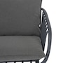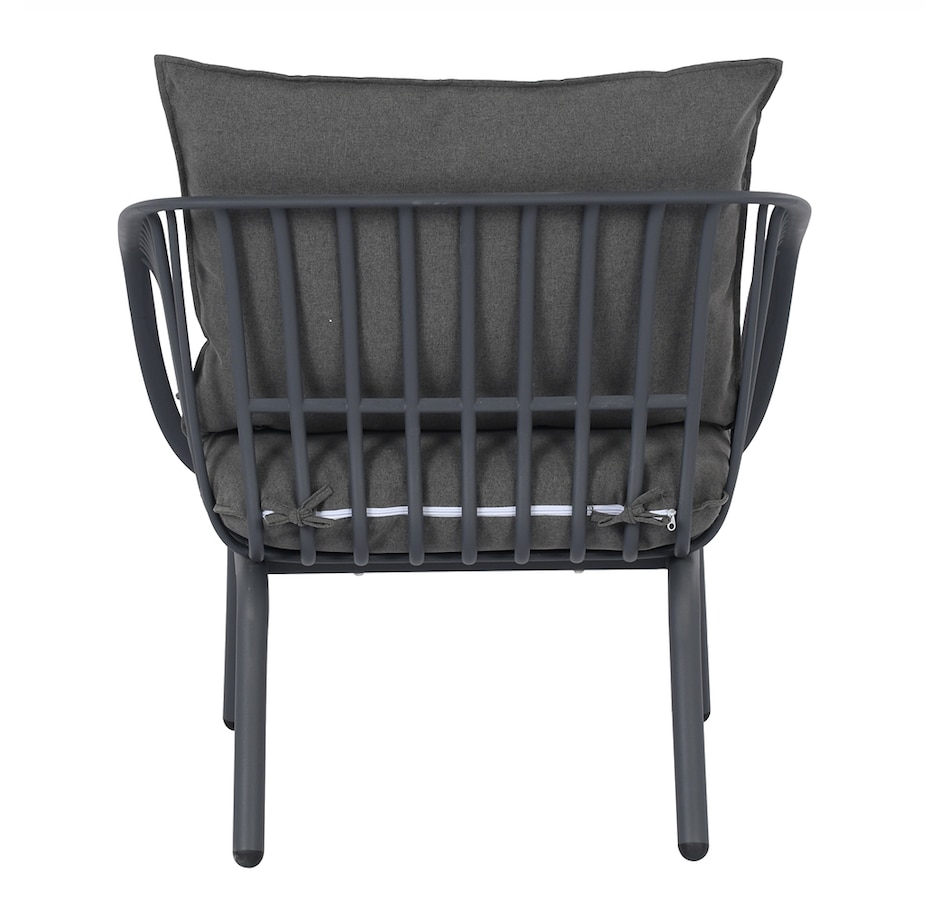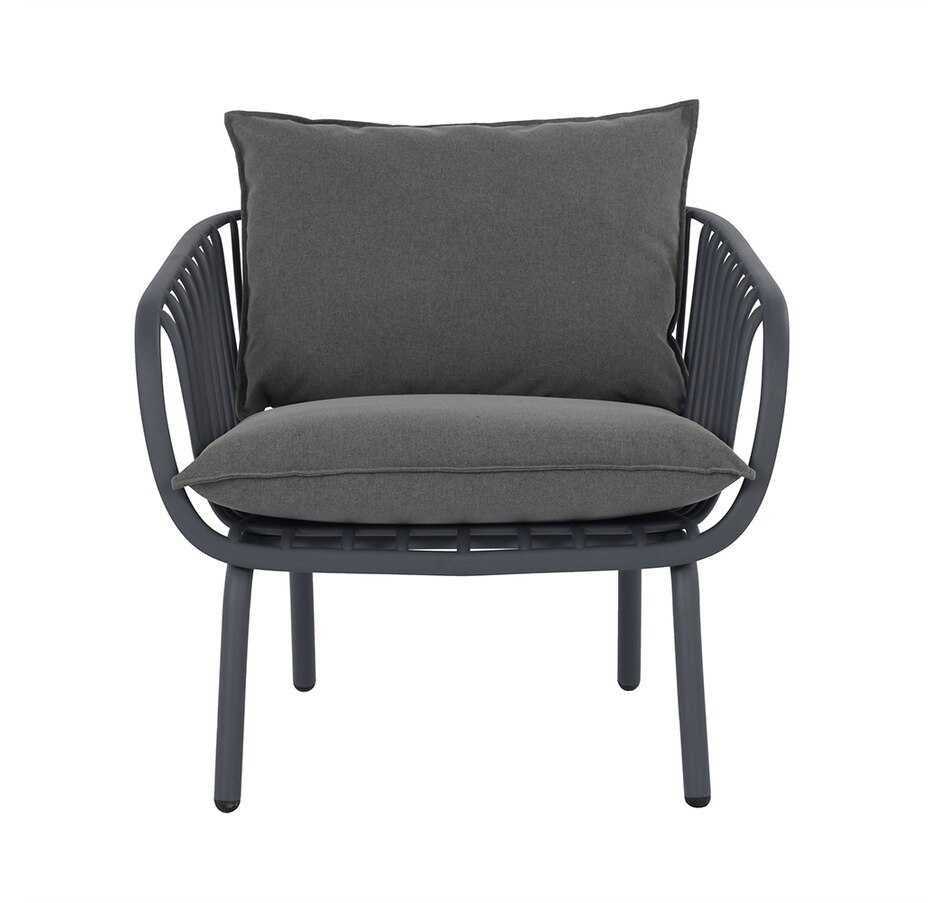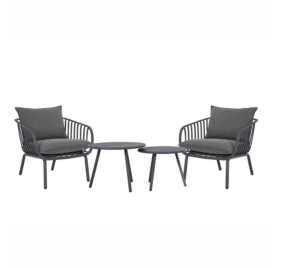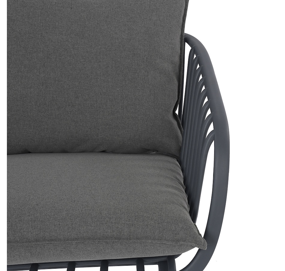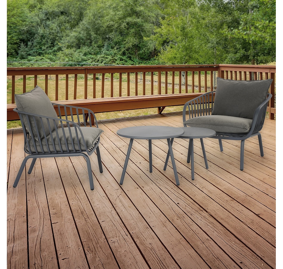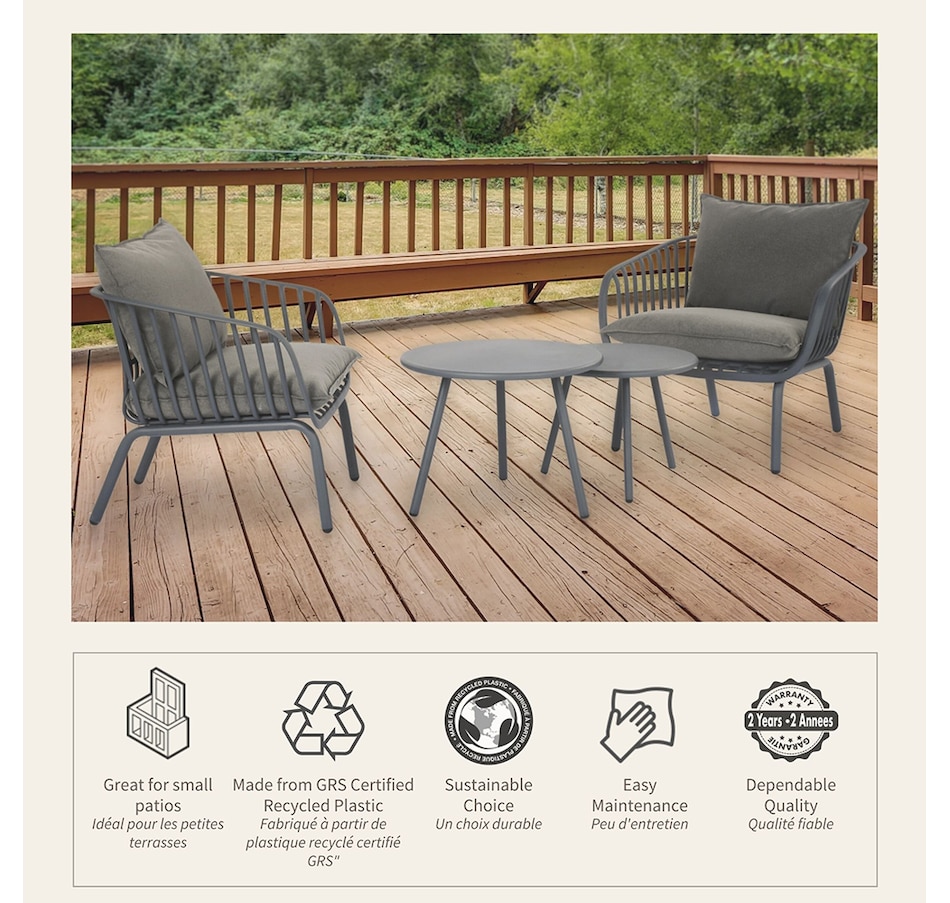 This stylish L-shaped chat set includes a chair composition that is 50% GRS PP plastic with Anti-UV. There's a waterproof fabric on the cushion material to resistance to elements too. The GRS certified plastic is made with a mix of 50% GRS plastic and 50% virgin material. This mix allows for quality and stability and follows the requirements for product to be certified GRS. The tables are finished with durable powder-coated metal.