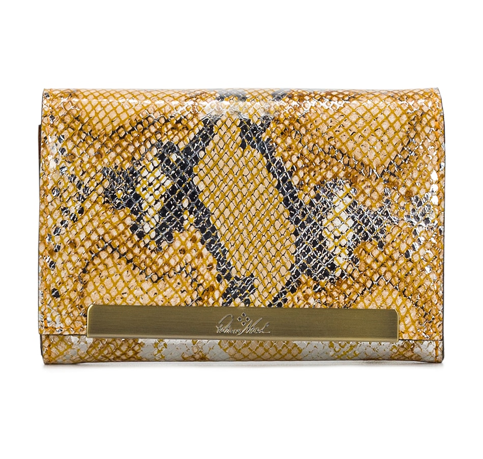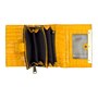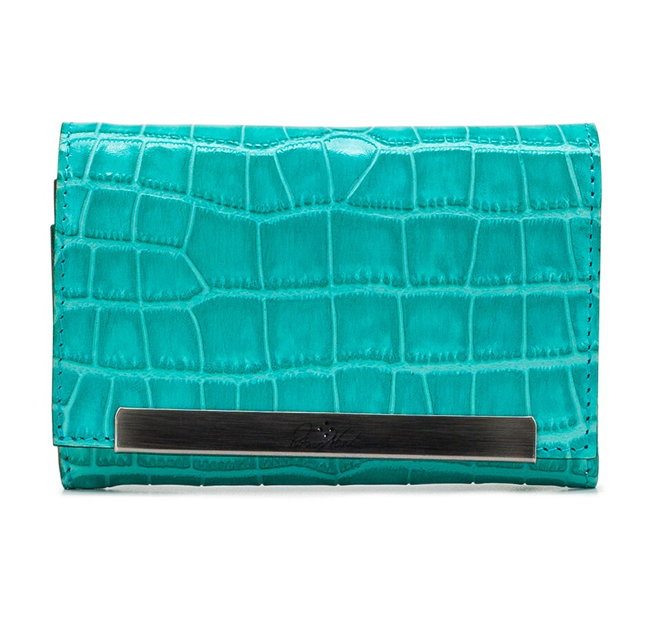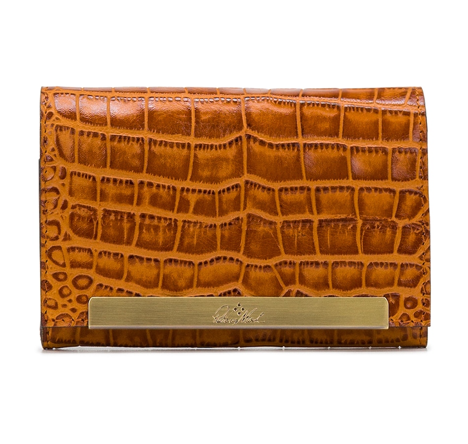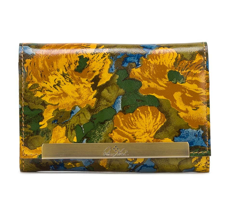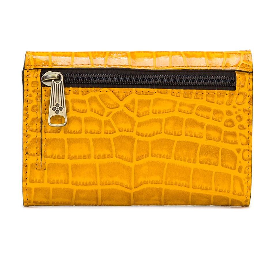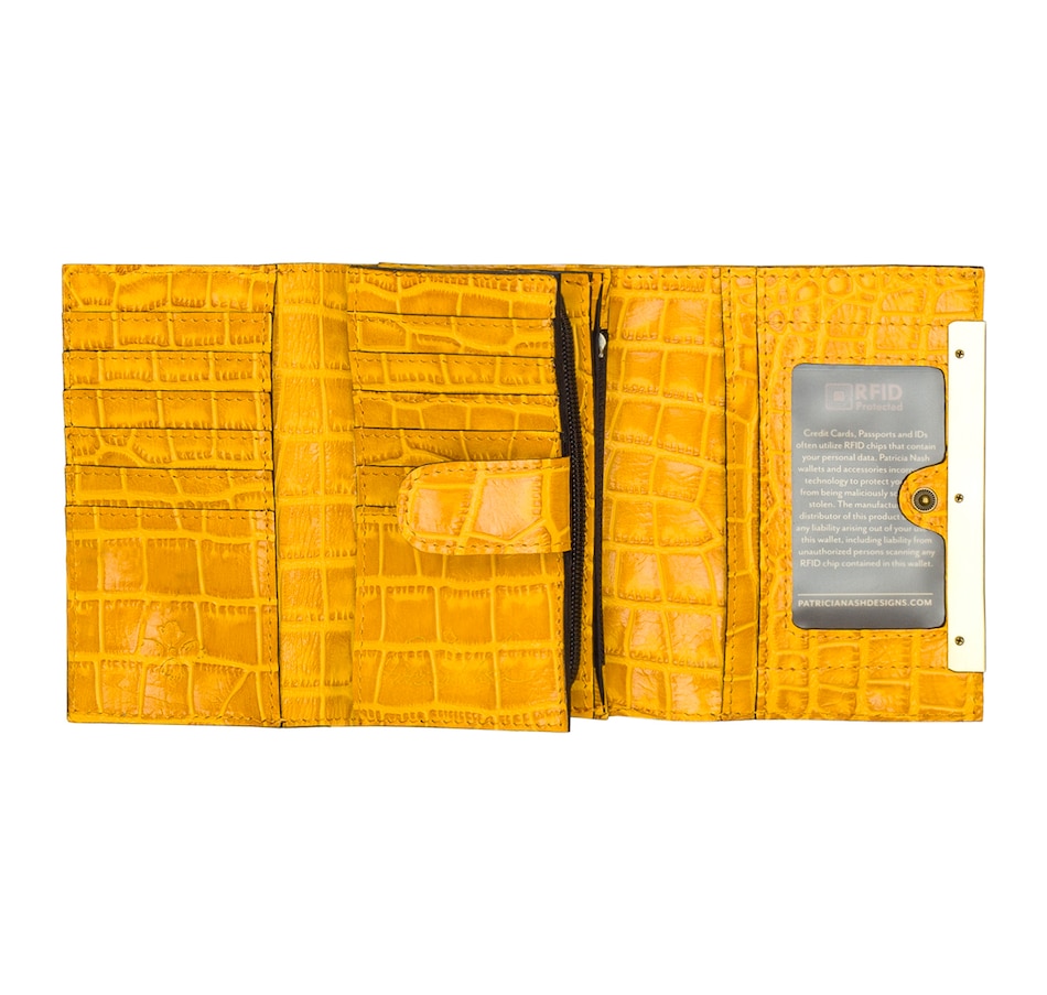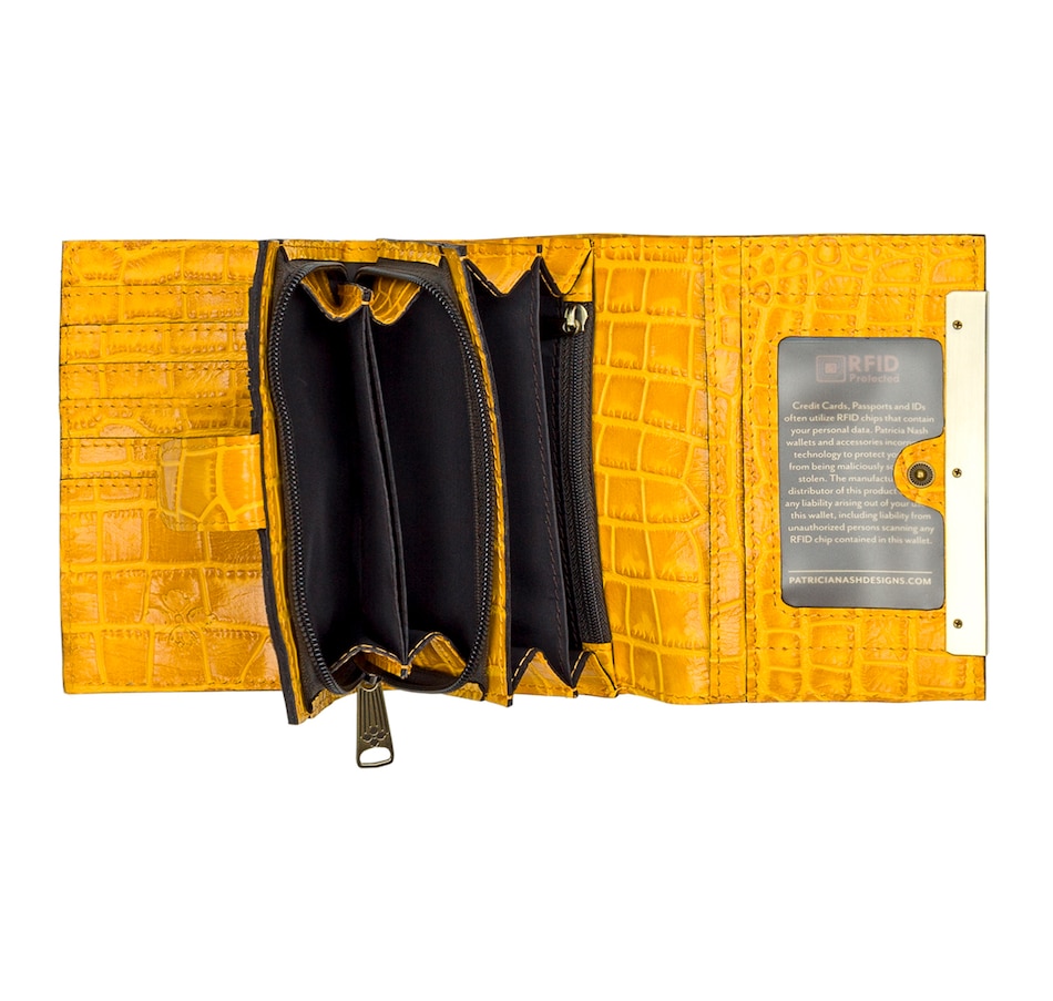 • Interior: bill slot, 3 zipper compartments, compartment with snap closure featuring 12 credit card slots. Fully lined