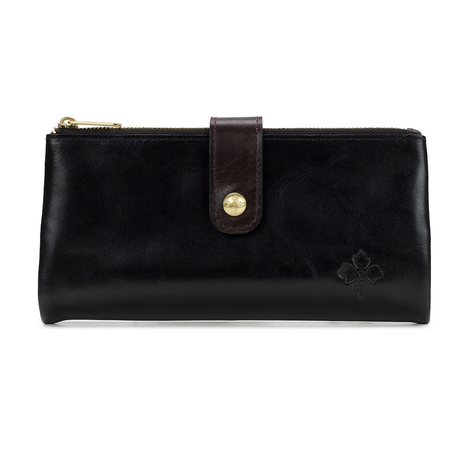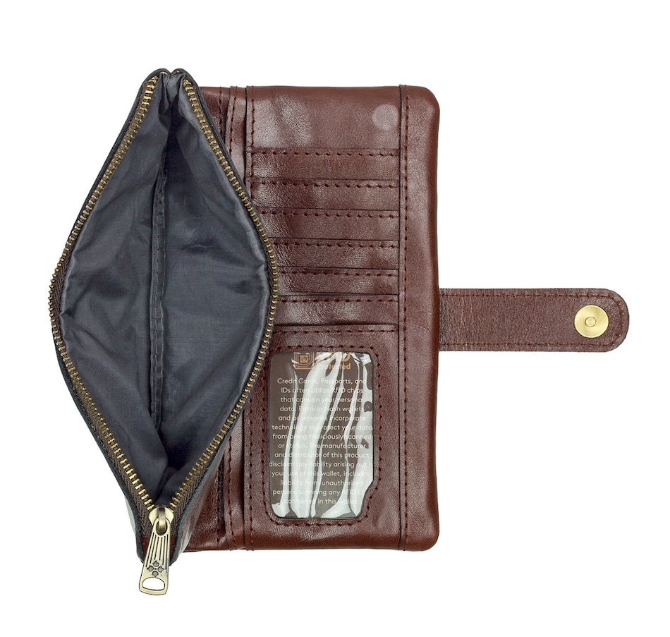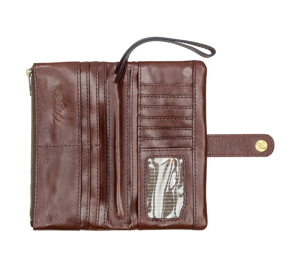 • Interior (3) bill pockets, zip pocket, (12) credit card slots, clear ID window