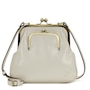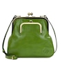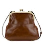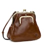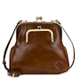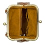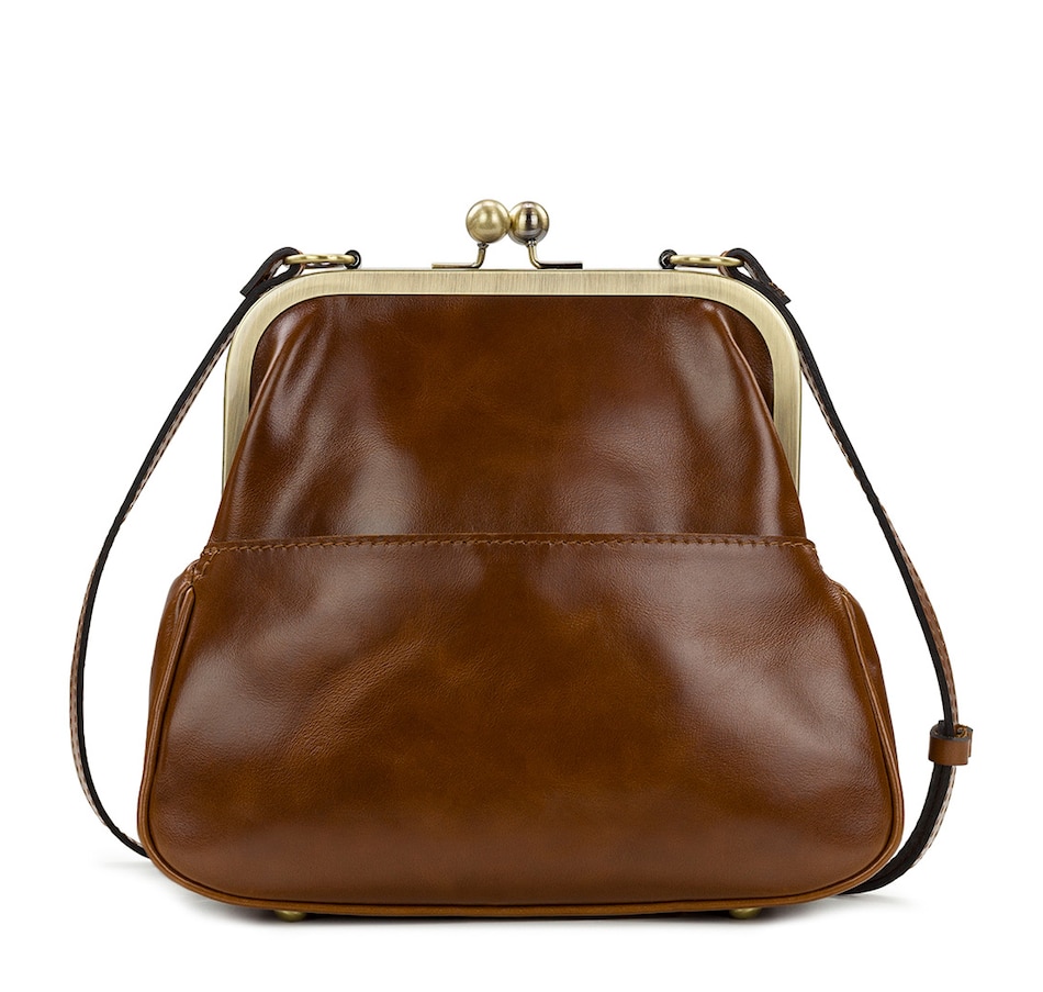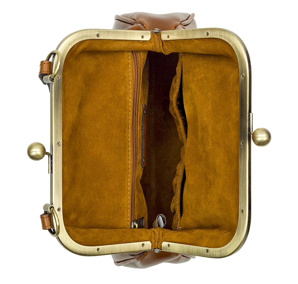 • Exterior: rear slip pocket with magnetic snap closure, protective metal feet, burned edge finish, front frame pocket with kiss lock closure