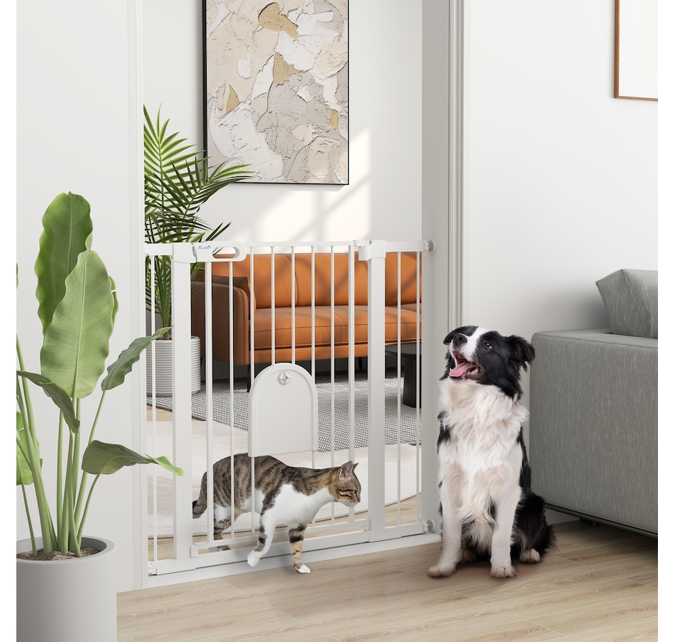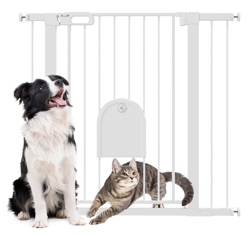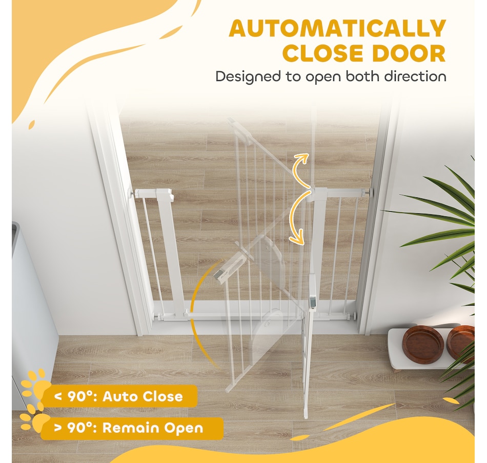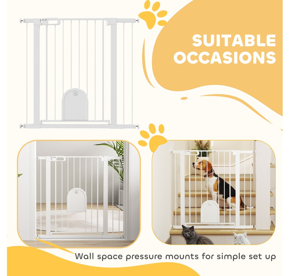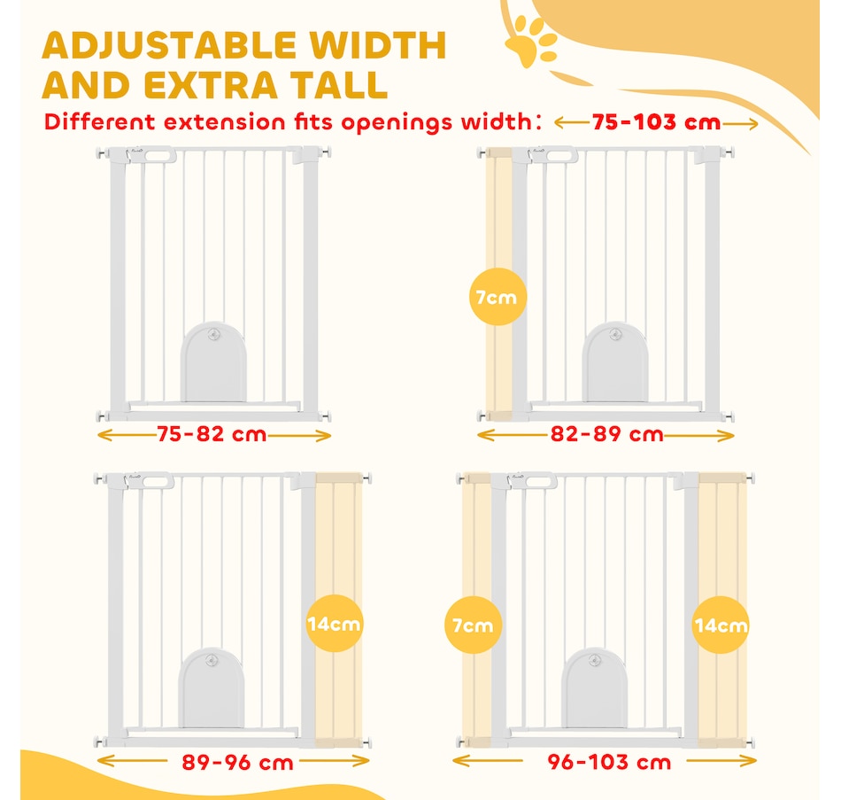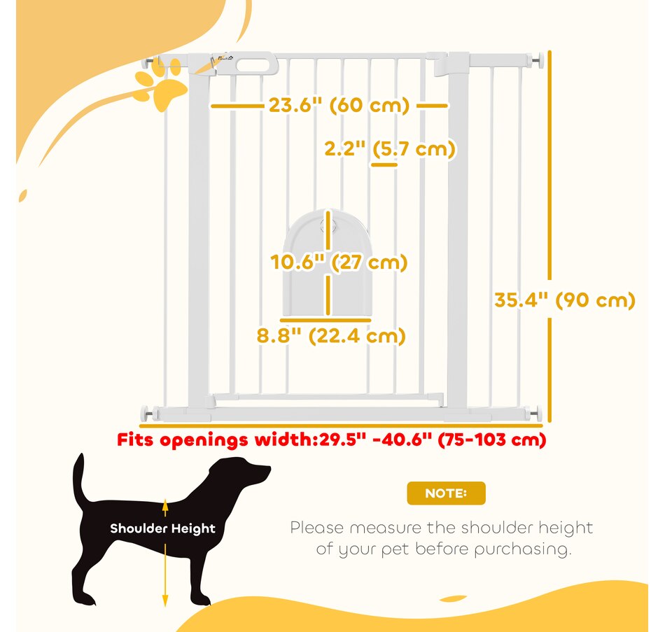 Keep pets away from rooms when required with the Pawhut dog gates with walk through door. Made from metal with lead-free treated surface for strength and safety. Ranges from 29.5" to 40.6"(75 - 103 cm) wide, allowing it to fit into different sized spaces with ease. Slide and lift, the handle is easy to open, allowing you to pass through quickly without your pet escaping for security. Double locking mechanism ensures your pet secured in a place to provide maximum safety.