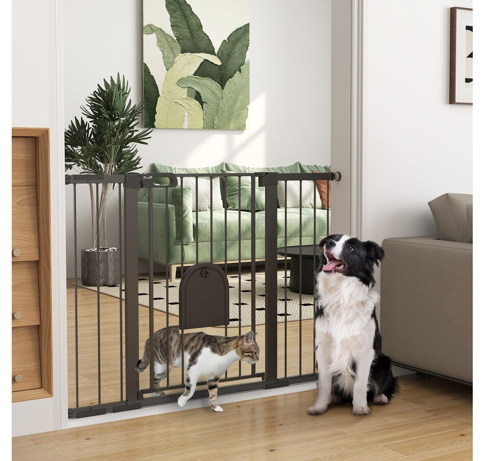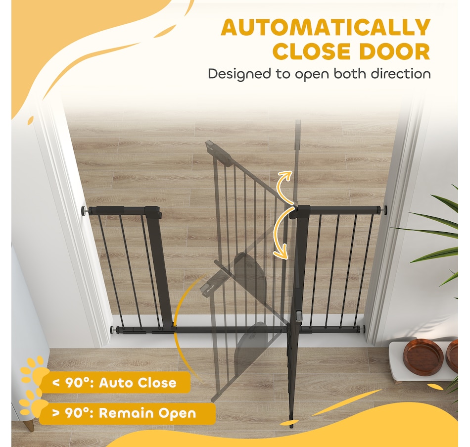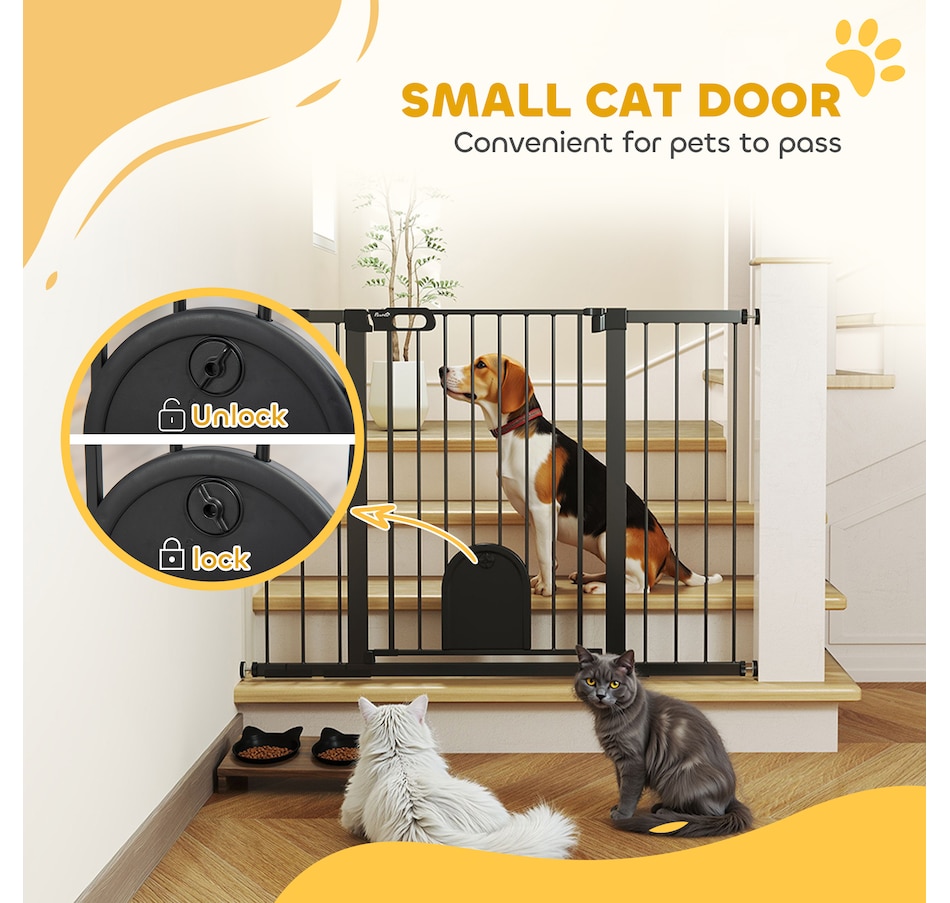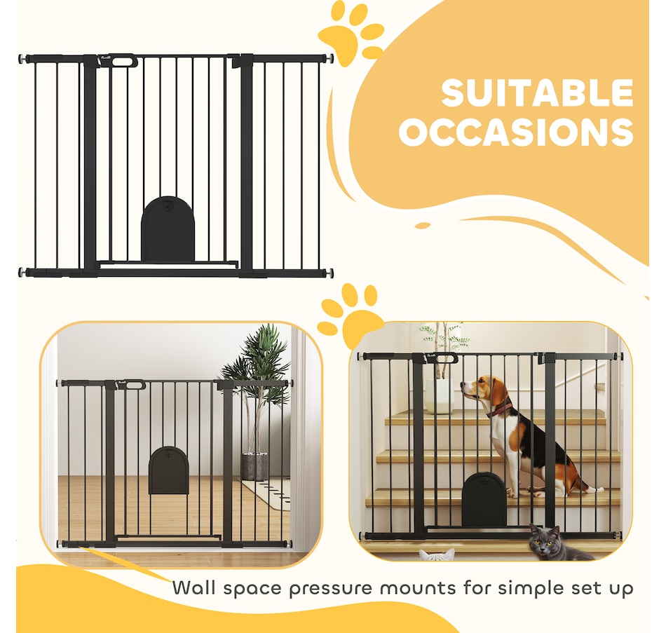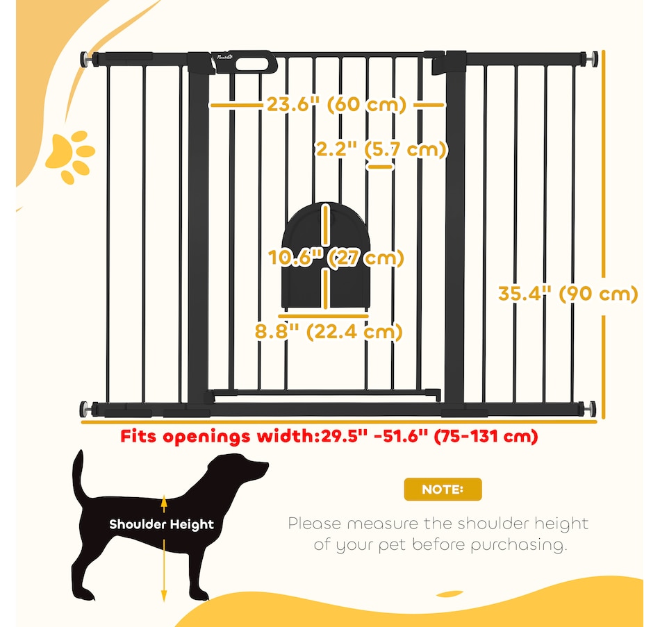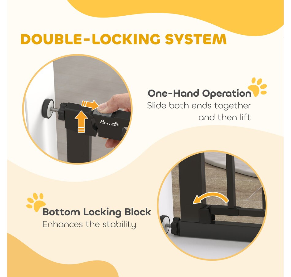 Keep pets away from rooms when required with the Pawhut dog gates with walk through door. Made from metal with lead-free treated surface for strength and safety. Ranges from 29.5" to 51.6"(75 - 131 cm) wide, allowing it to fit into different sized spaces with ease. Slide and lift, the handle is easy to open, allowing you to pass through quickly without your pet escaping for security. Double locking mechanism ensures your pet secured in a place to provide maximum safety.