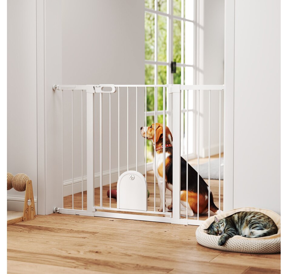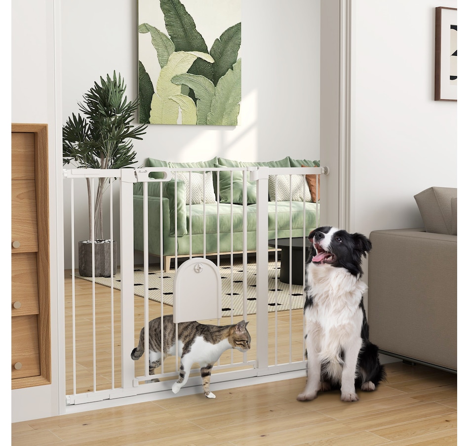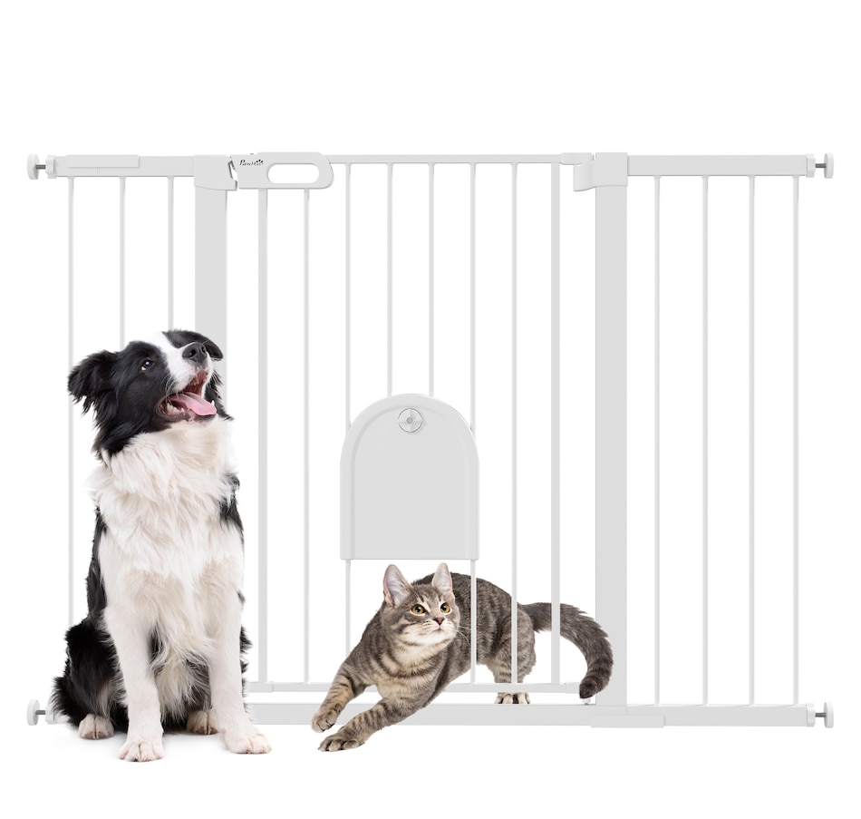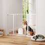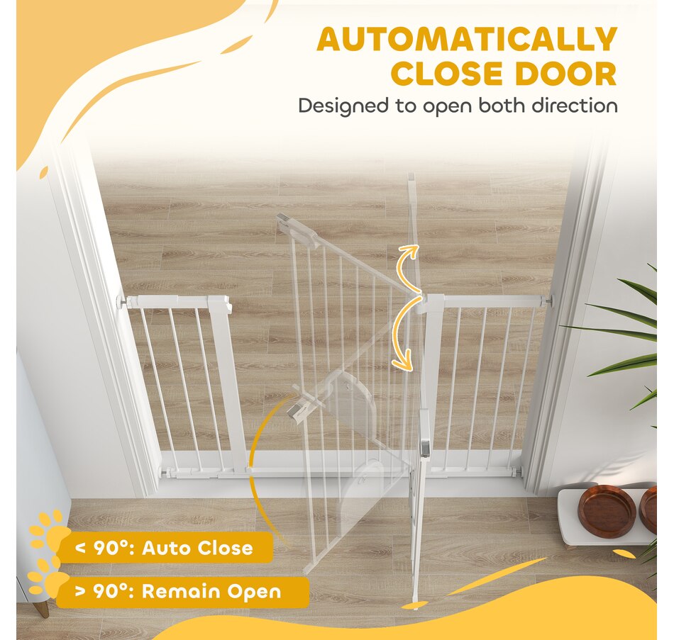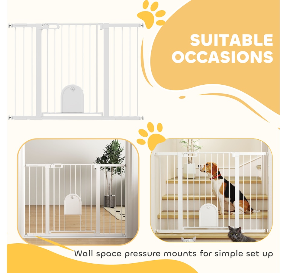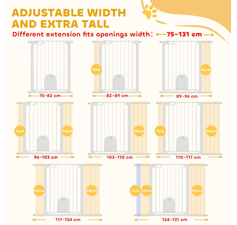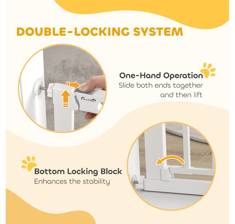 Keep pets away from rooms when required with the Pawhut dog gates with walk through door. Made from metal with lead-free treated surface for strength and safety. Ranges from 29.5" to 51.6"(75 - 131 cm) wide, allowing it to fit into different sized spaces with ease. Slide and lift, the handle is easy to open, allowing you to pass through quickly without your pet escaping for security. Double locking mechanism ensures your pet secured in a place to provide maximum safety.