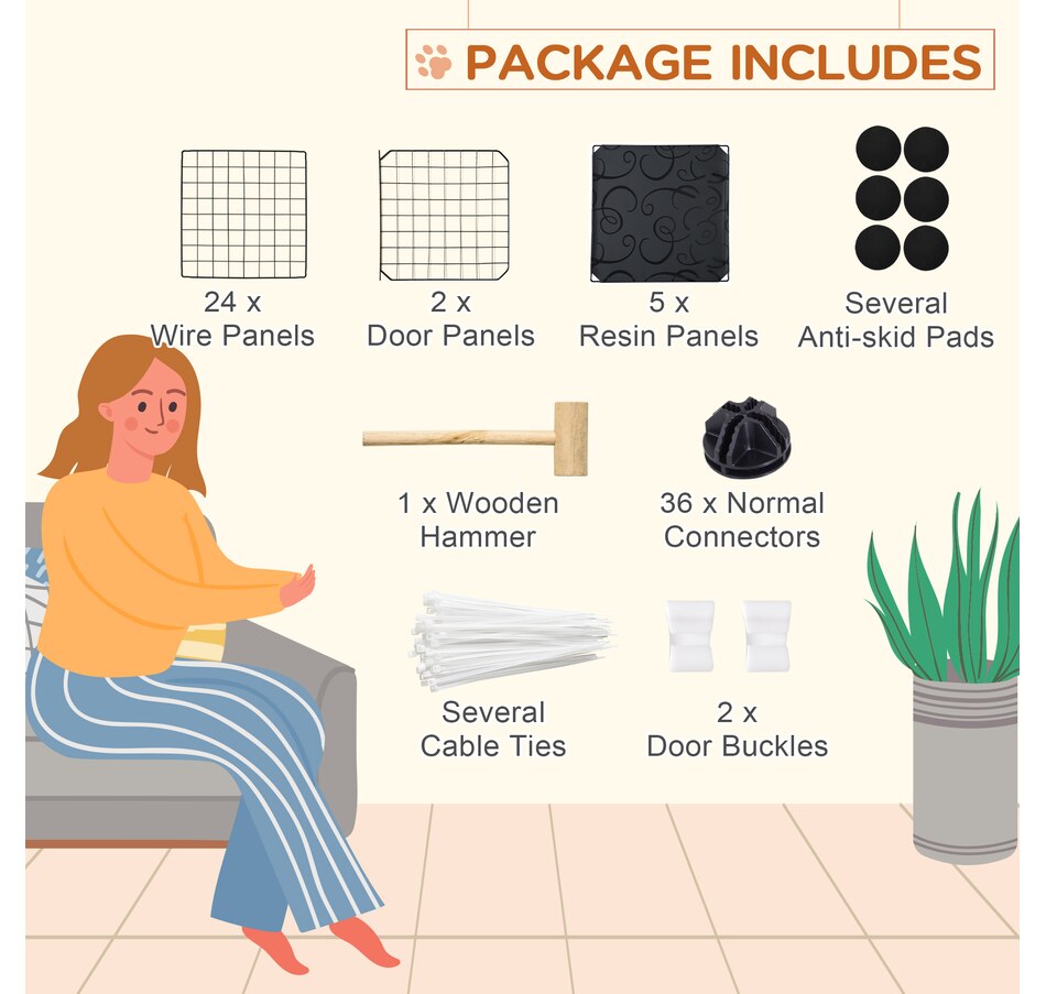 ● 24 wire panels, two side-open door panels, five resin panels, and a ladder;