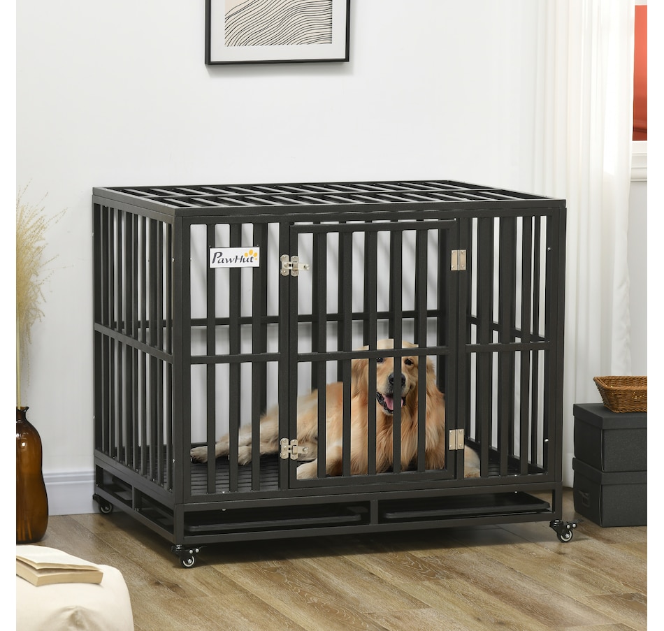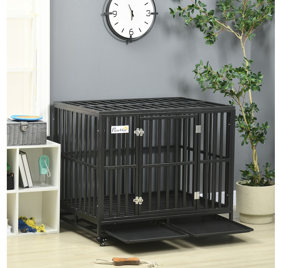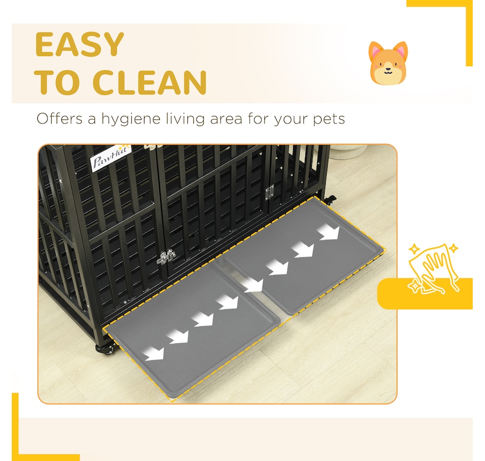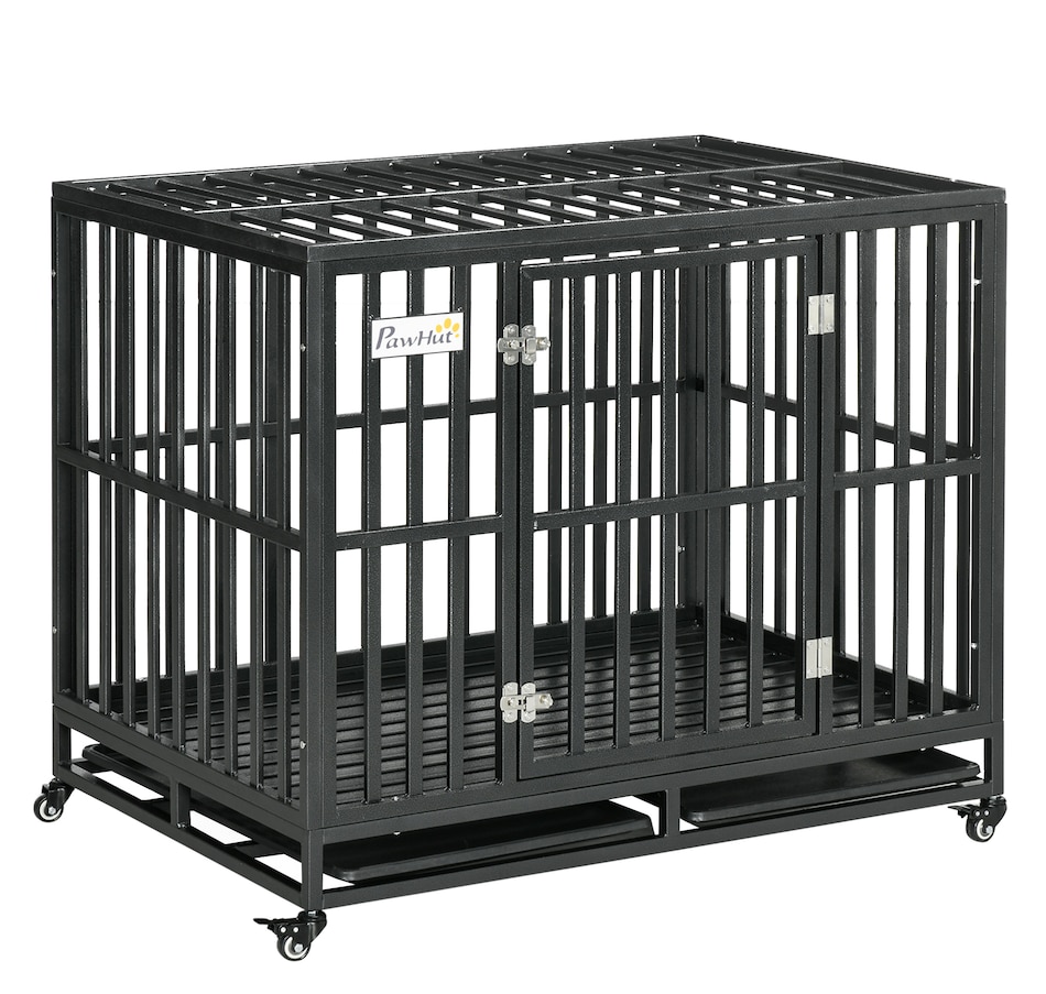 This heavy-duty dog kennel from PawHut provides a comfortable and secure home for your furry friend. Constructed with solid steel gauge tubes and frame. Each bar is securely welded to the frame for strength and durability. Two convenient slide-out panels are included for easy cleaning and maintenance. This dog kennel has rolling caster wheels for easy transportation and movement. This crate is a great tool for keeping your pets safe and secure while you are away.
