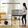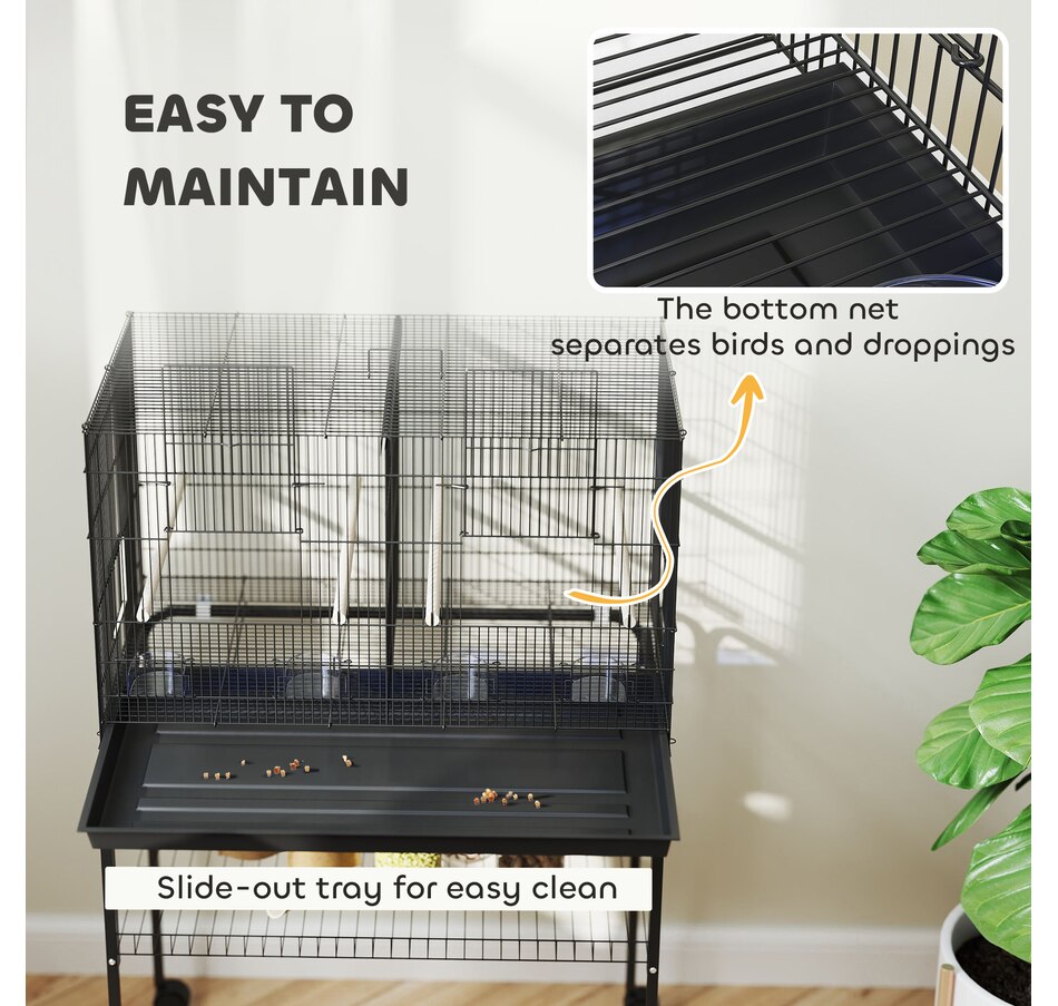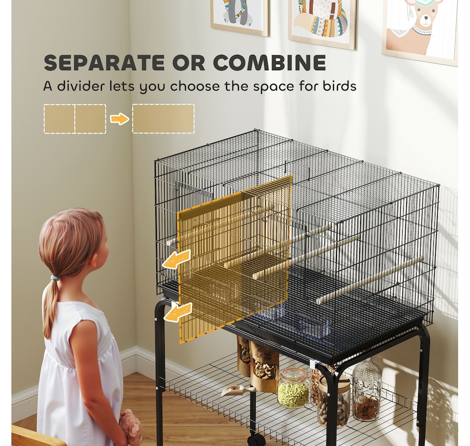 Discover the joy of a spacious PawHut budgie cage that effortlessly separates into two cosy rooms or transforms into a grand space. A secure latch on 0.5" (1.2 cm) bar spacing, your budgies, lovebirds, or canaries will stay safe and content. Suitable for both play and relaxation, this canary cage includes 4 perches, 4 food dishes and a stand with wheels and a shelf, making it a sanctuary for your feathered friends.