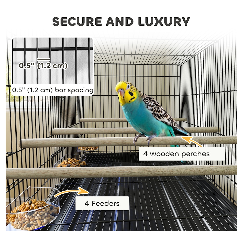 ● 0.5" (1.2 cm) bar spacing with secure latch prevents bird escapes;