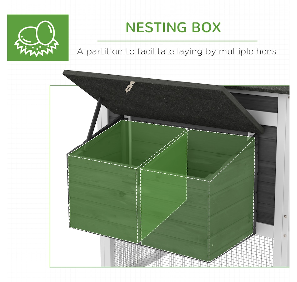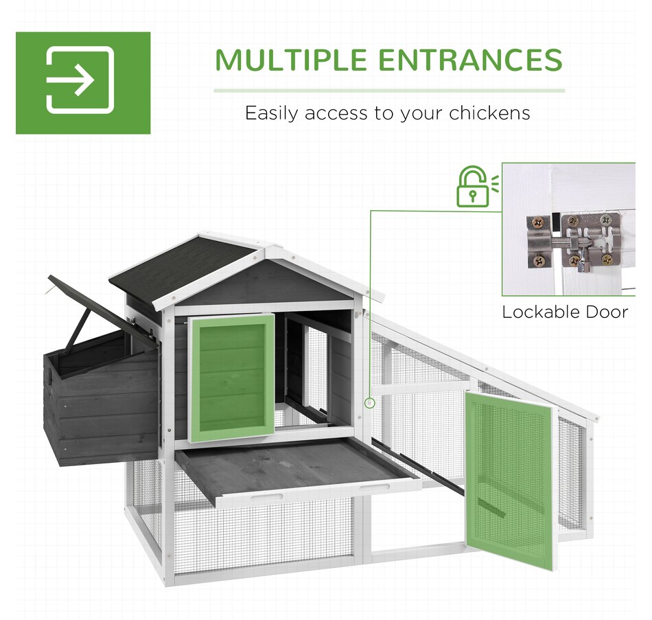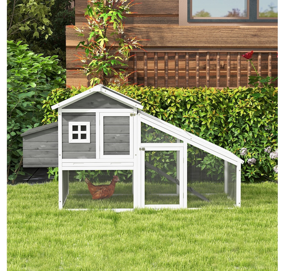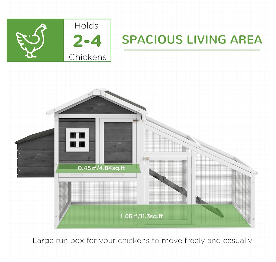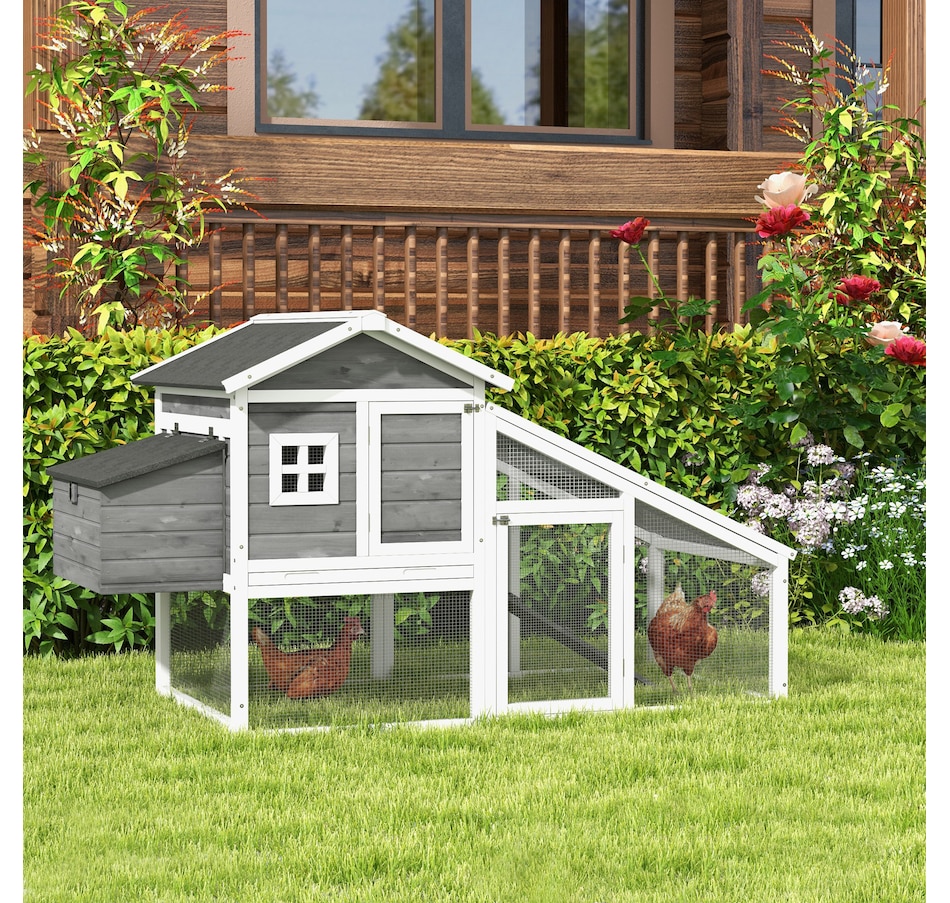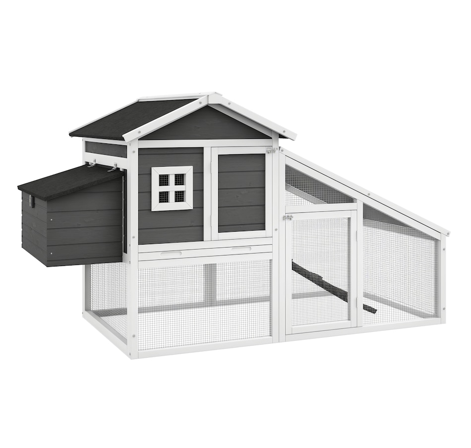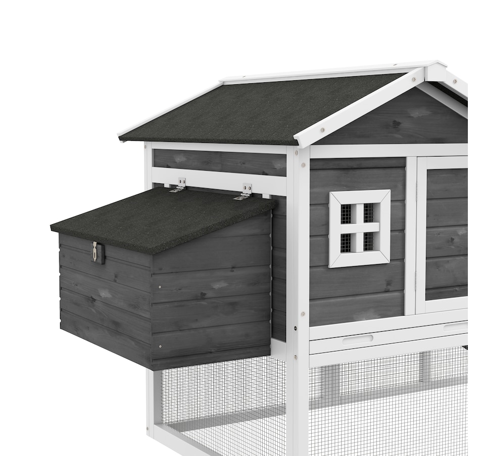 Treat your chickens to the good life they deserve with this chicken chateau from PawHut! Our deluxe chicken coops are both stylish and functional. This model includes both indoor and outdoor spaces for your chickens to enjoy while being protected from predators and the elements. Easily access the interior of this coop via liftable roof sections on the nesting box, or the doors with latches on the front of the house and run. Provide your hens with their very own poultry palace from PawHut!Features: