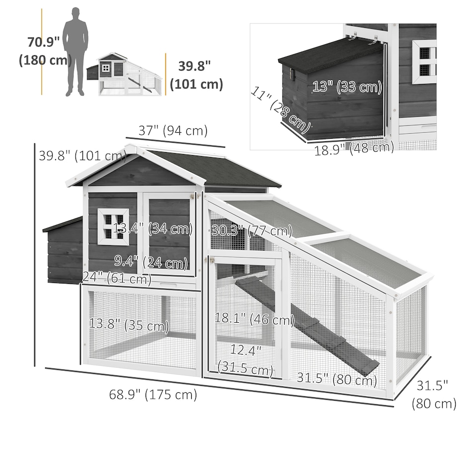 ● Quality fir wood construction with elevated house, nesting box, run, ramp, and doors;