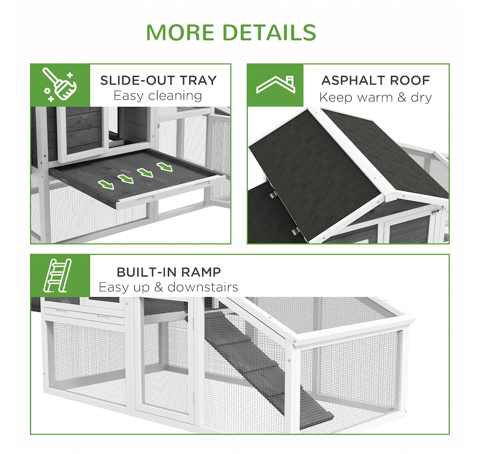 ● Non-slip ramp allows chickens to easily enter the raised house;