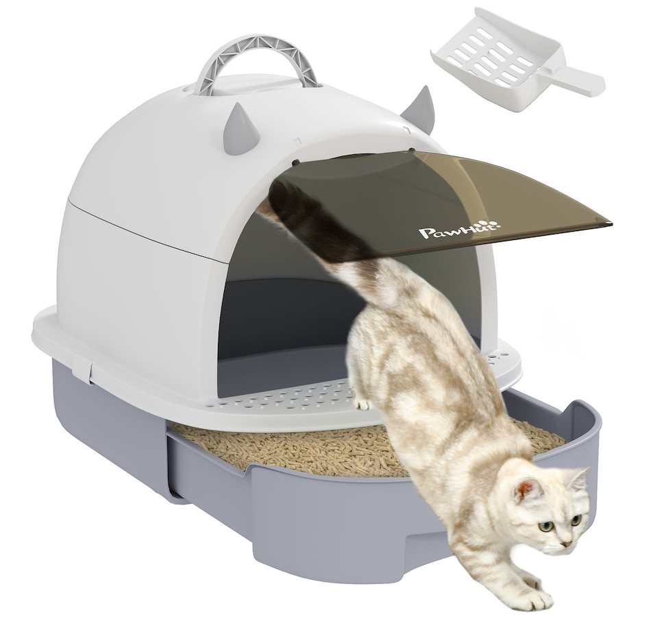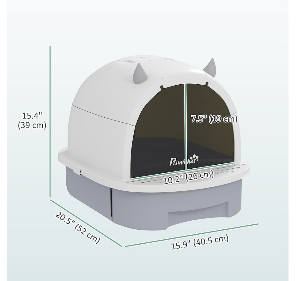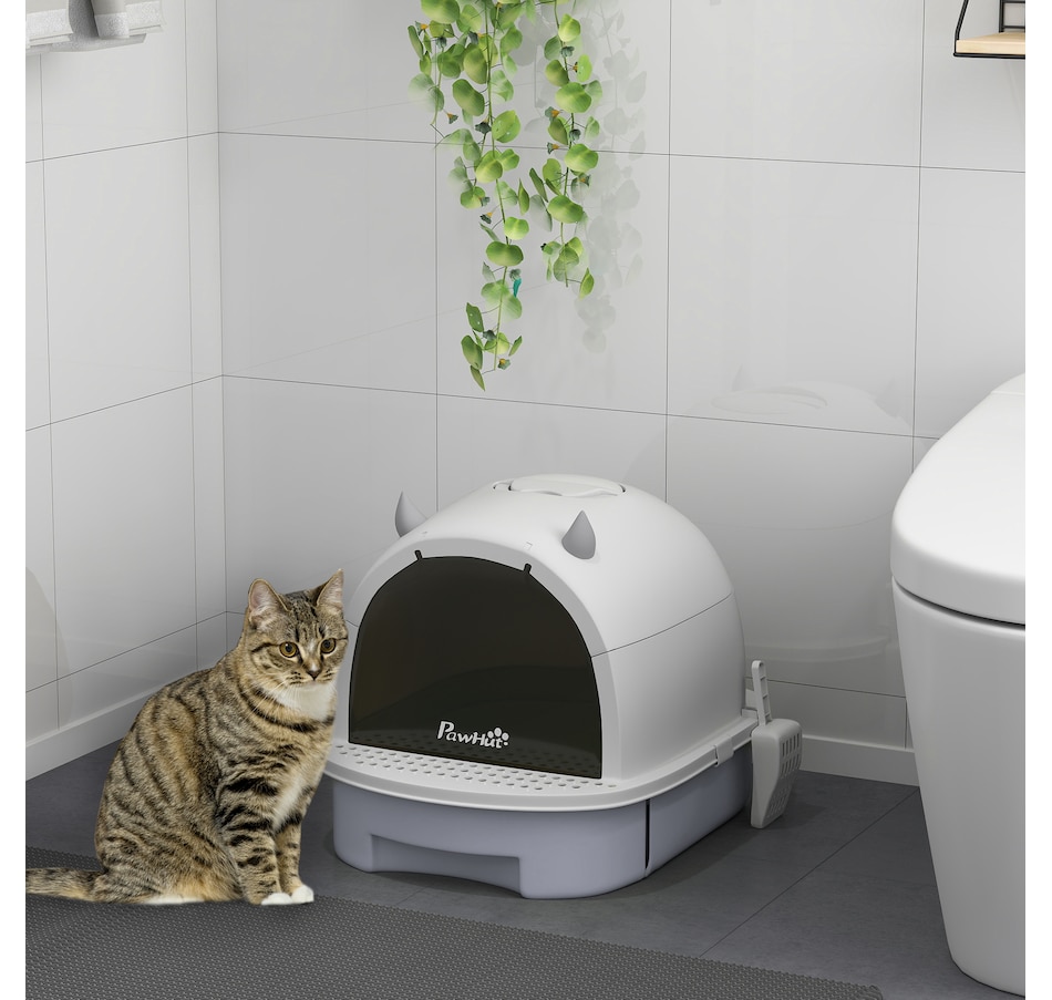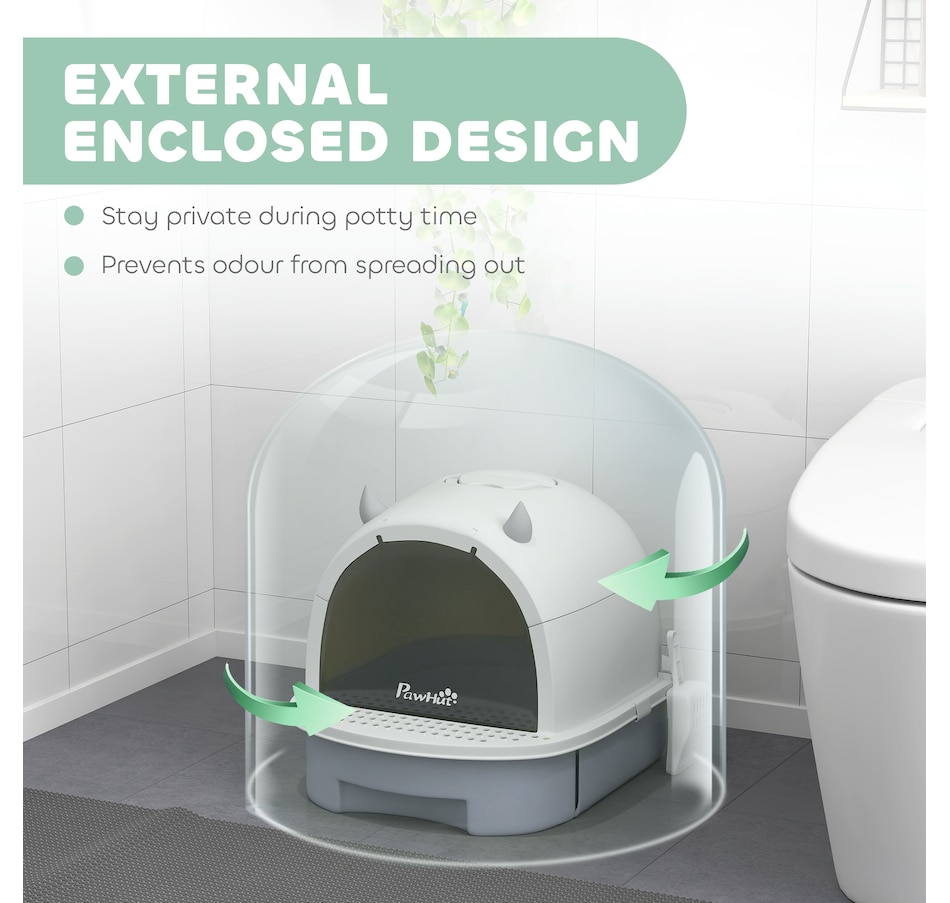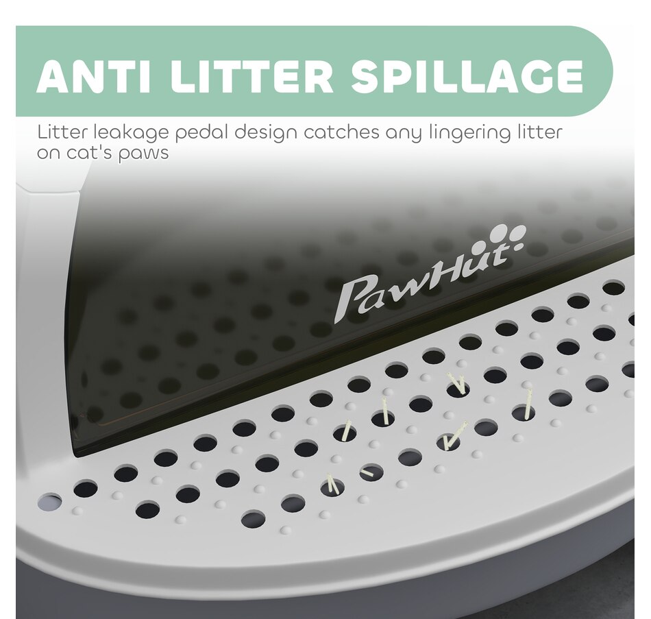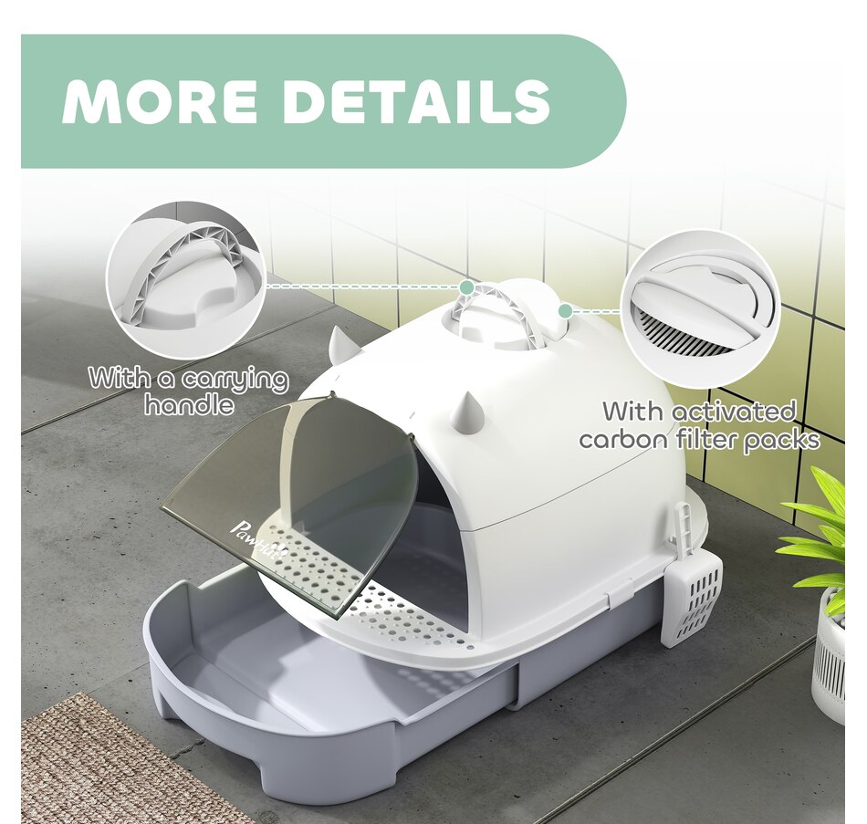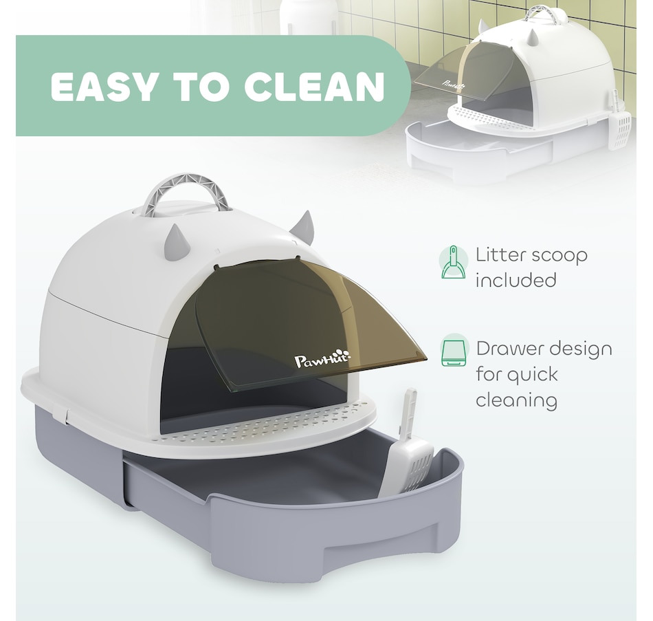 Discover the PawHut kitty litter box enclosure, where privacy meets cleanliness! Its enclosed design with a translucent flap and odor-fighting two deodorizing bags ensures a fresh, private space for your kitty. Cleaning is a breeze with its easy-access drawer and included scoop. Plus, the litter-proof entrance pedal keeps floors clean. Suitable for seamless mobility, thanks to its handy carrying handle.