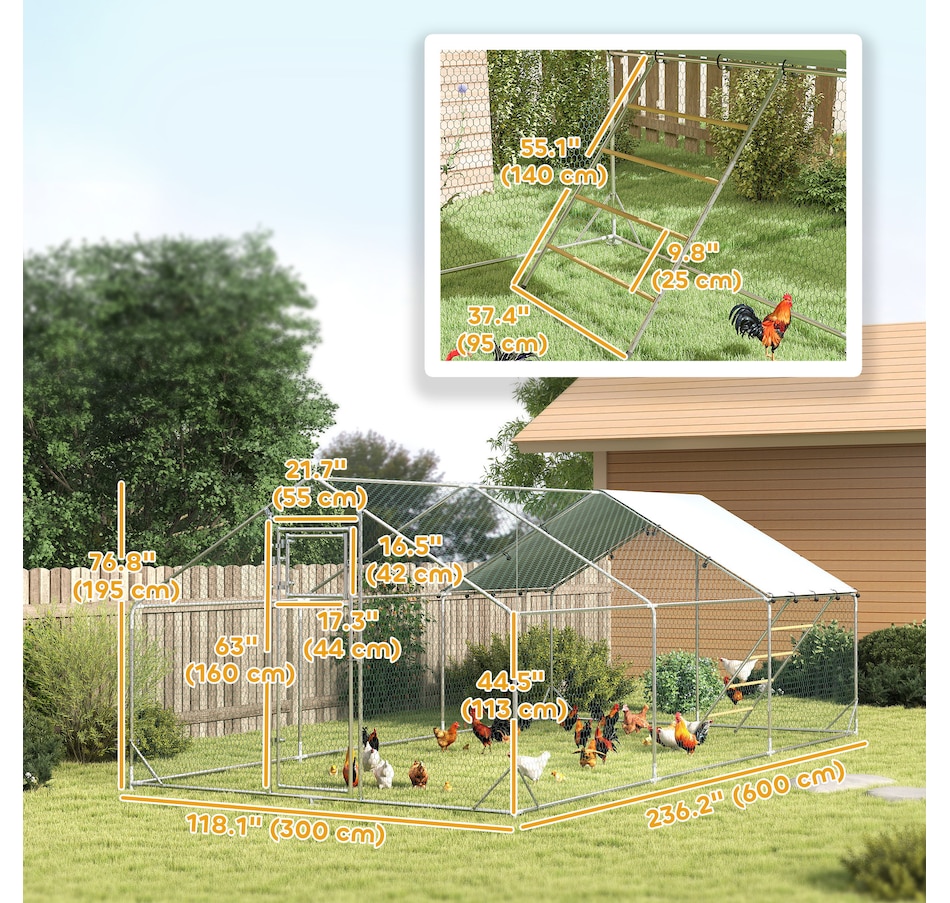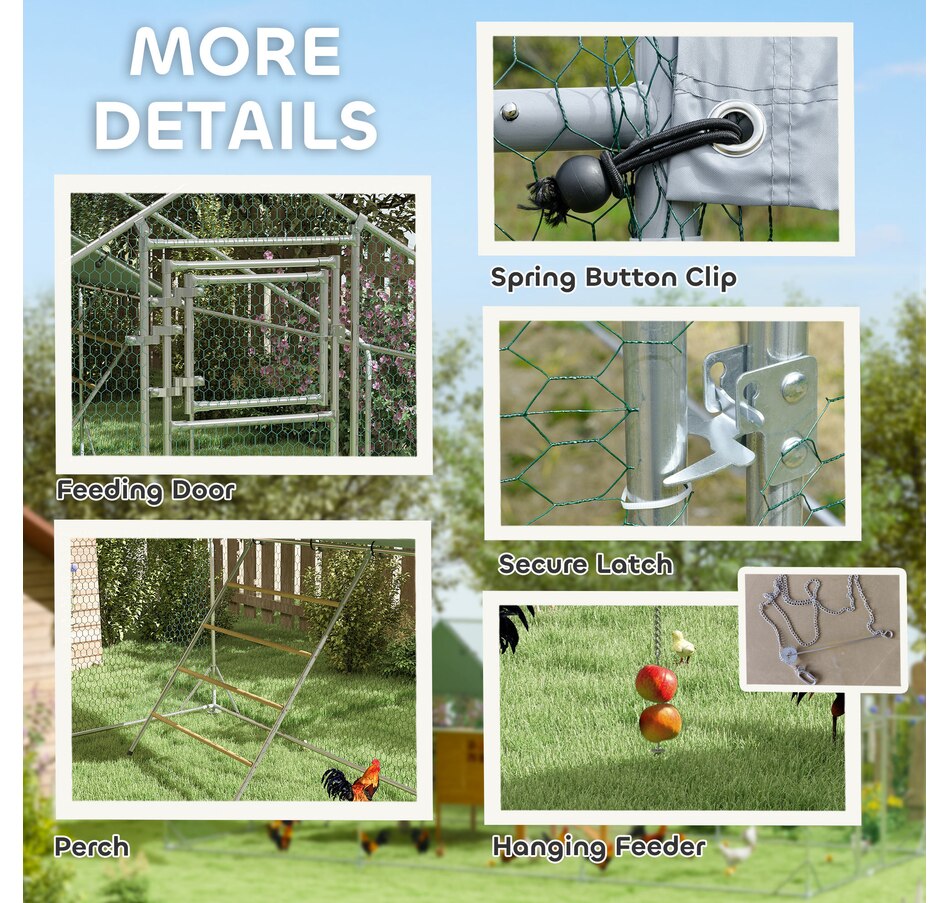 Transform your backyard with the PawHut Chicken Run, a spacious and secure 194 sq. ft. (18 m²) enclosure for 18-24 chickens. Featuring galvanized steel and UV-resistant fabric, it offers shelter and easy maintenance. The feeding door and included accessories create a comfortable, complete setup for your flock.