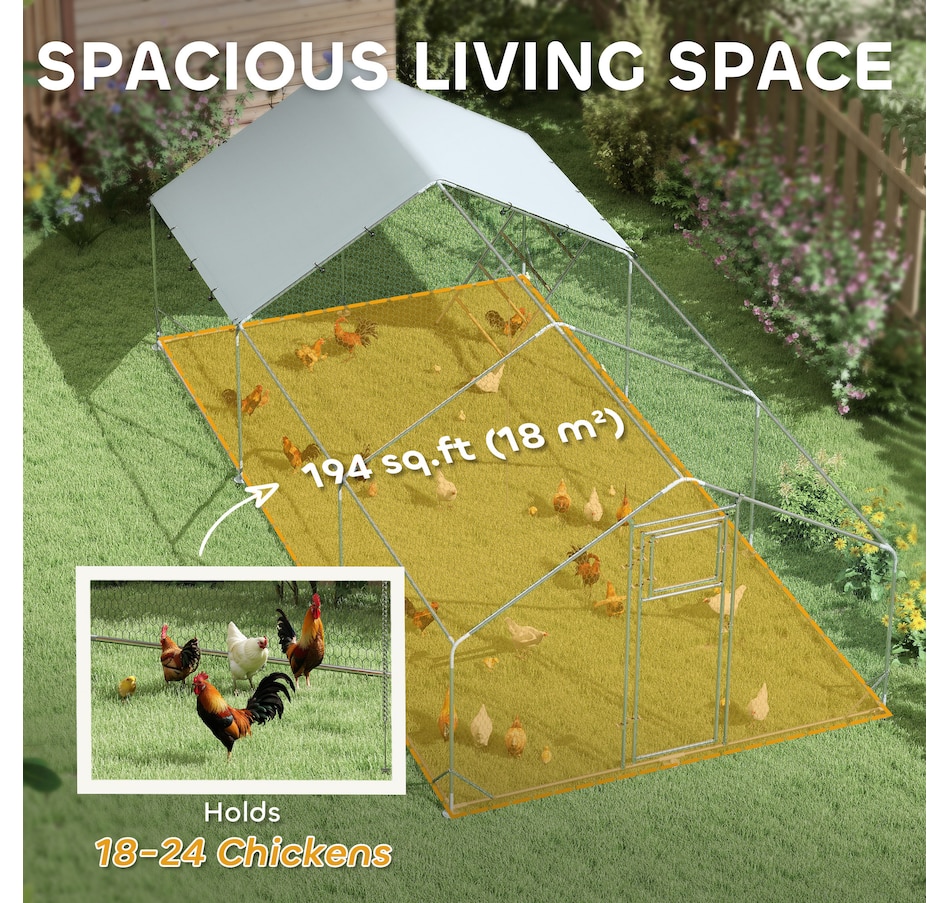 ● Spacious 194 sq. ft (18 m²) area comfortably accommodates 18-24 chickens;