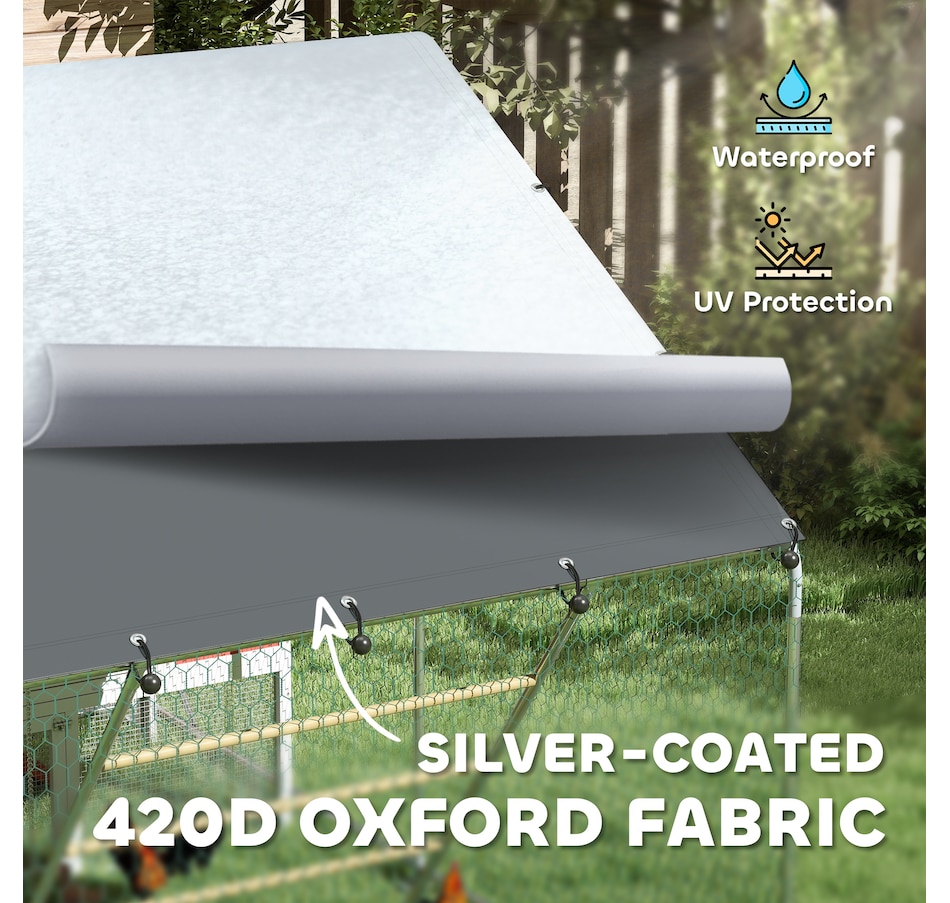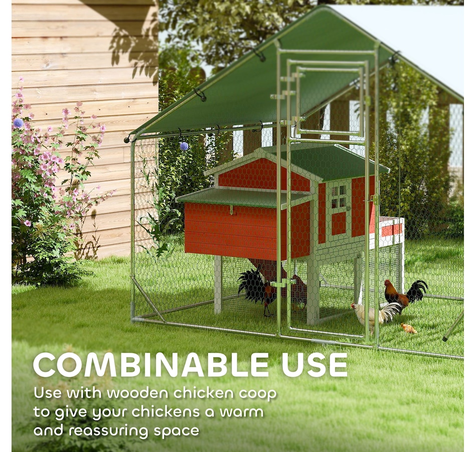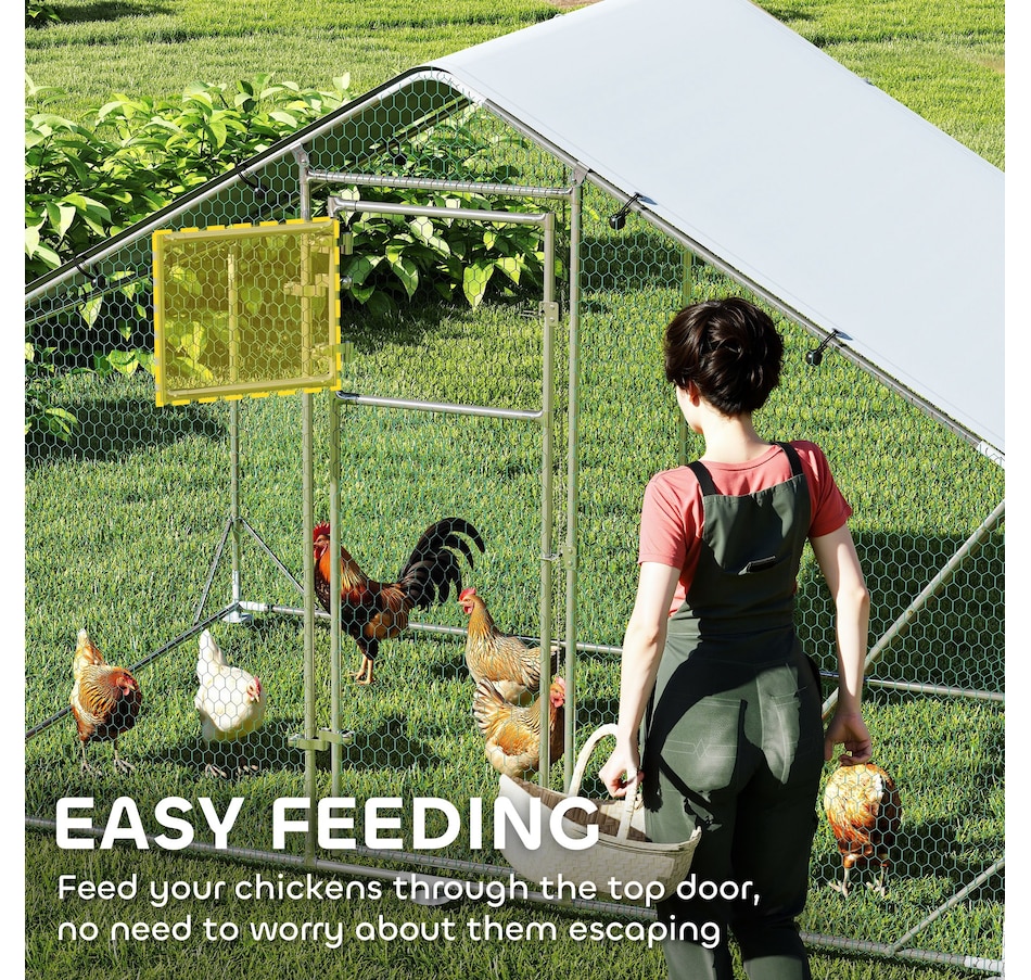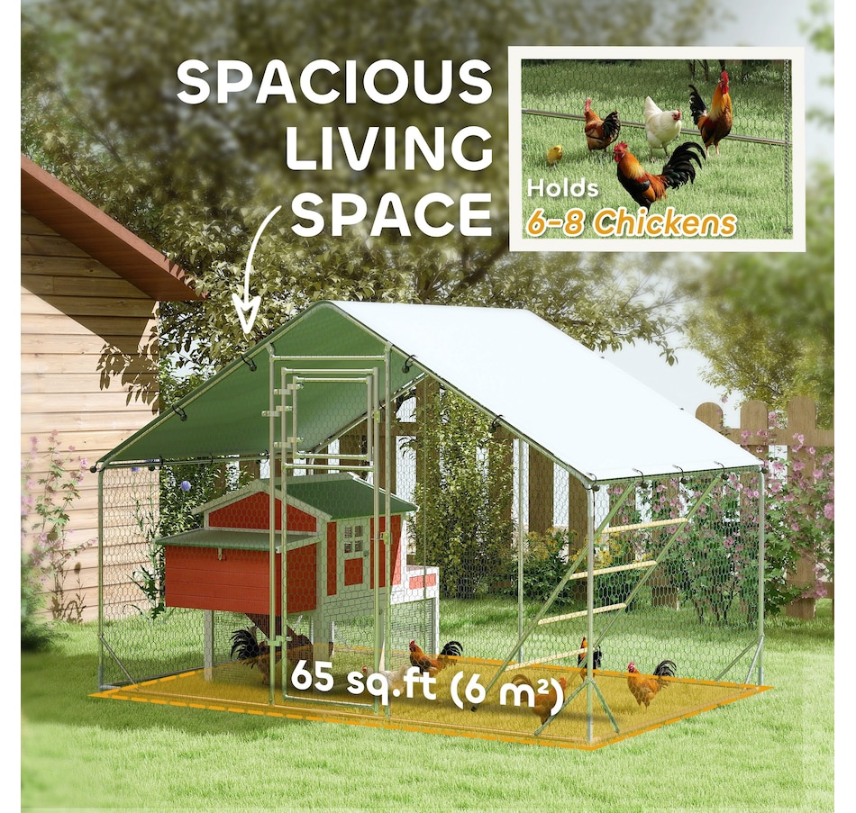 Transform your backyard with the PawHut Chicken Run, a spacious and secure 65 sq. ft. (6 m²) enclosure for 6-8 chickens. Featuring galvanized steel and UV-resistant fabric, it offers shelter and easy maintenance. The feeding door and included accessories create a comfortable, complete setup for your flock.