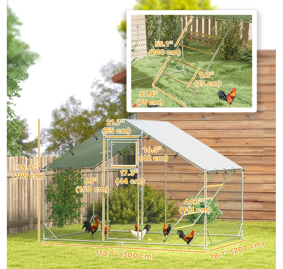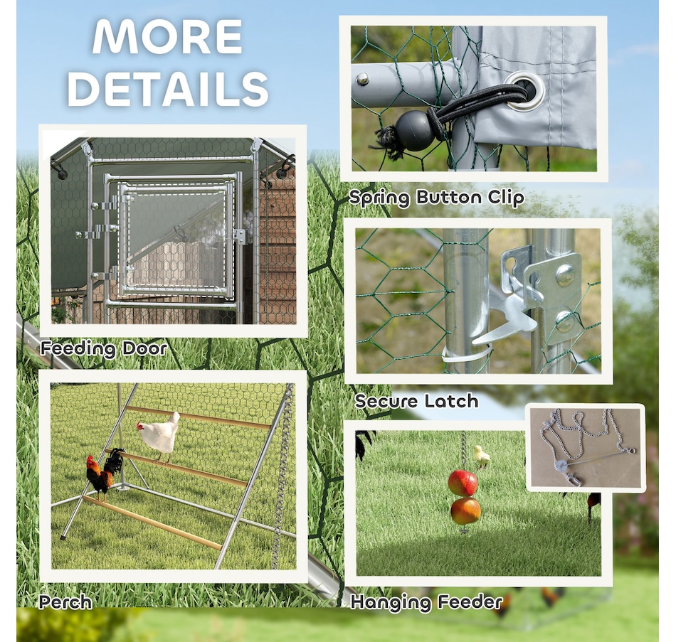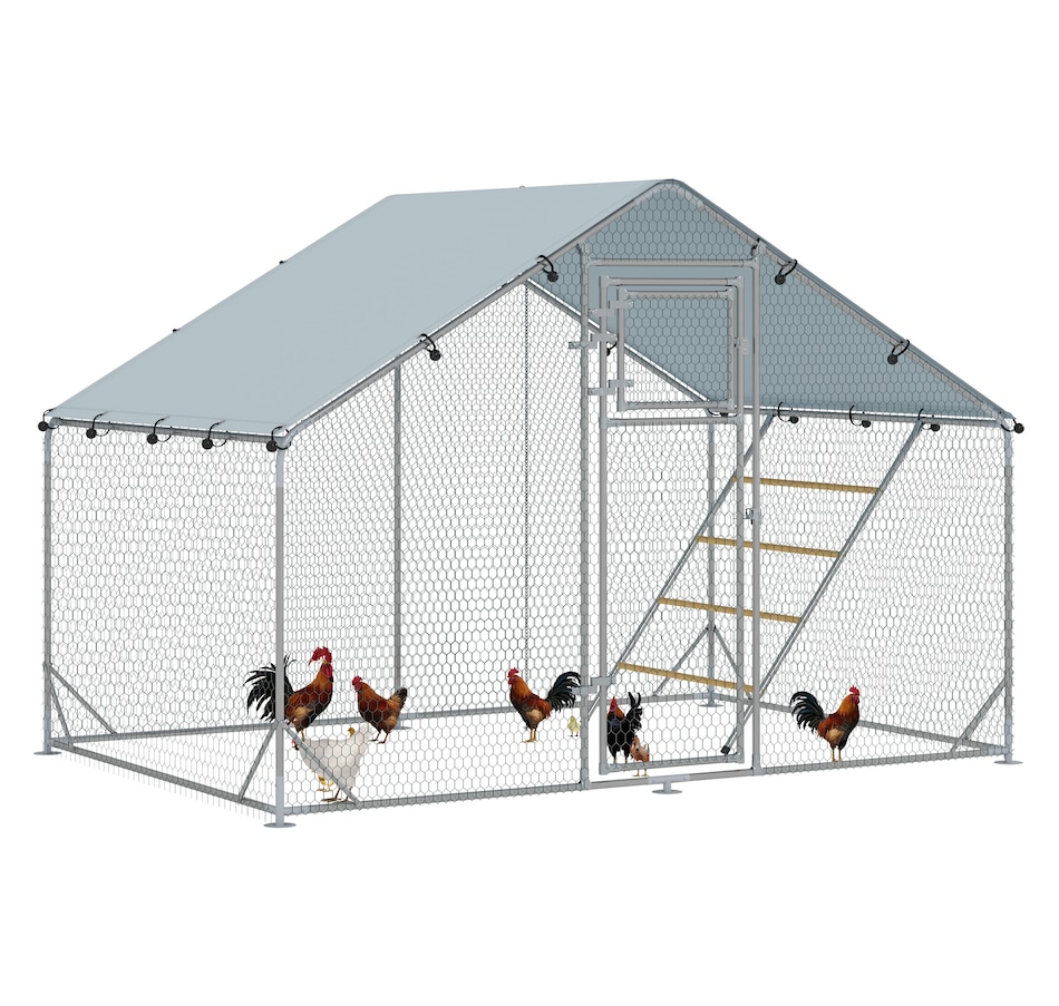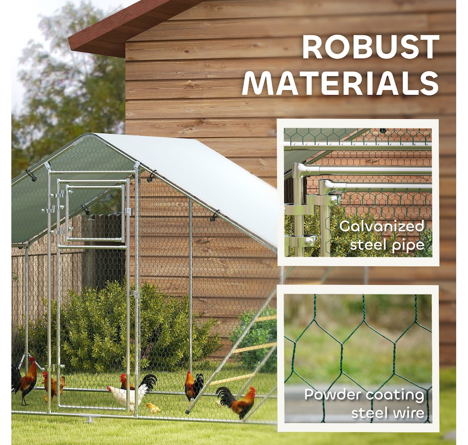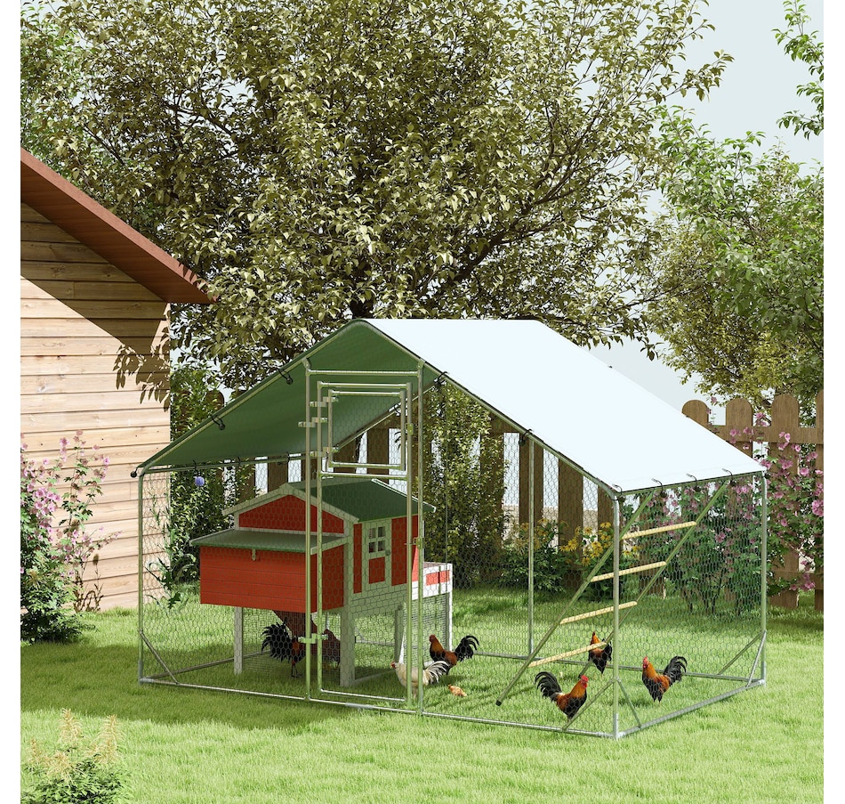 Transform your backyard with the PawHut Chicken Run, a spacious and secure 65 sq. ft. (6 m²) enclosure for 6-8 chickens. Featuring galvanized steel and UV-resistant fabric, it offers shelter and easy maintenance. The feeding door and included accessories create a comfortable, complete setup for your flock.