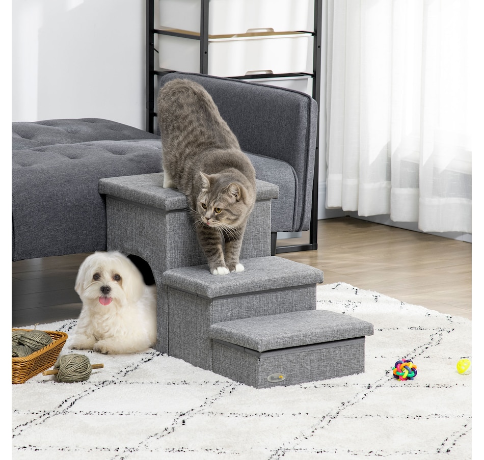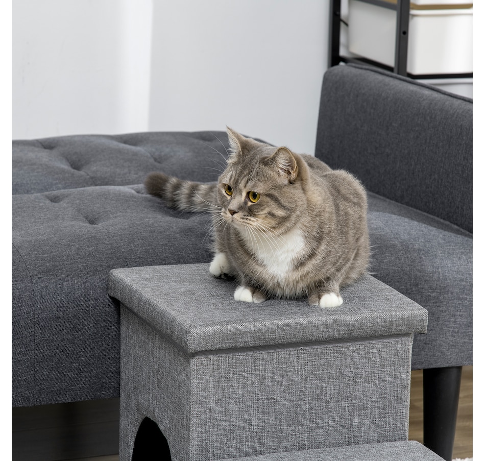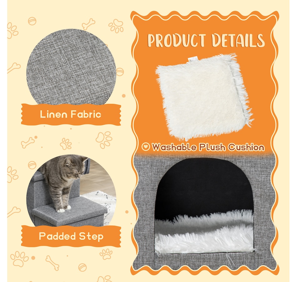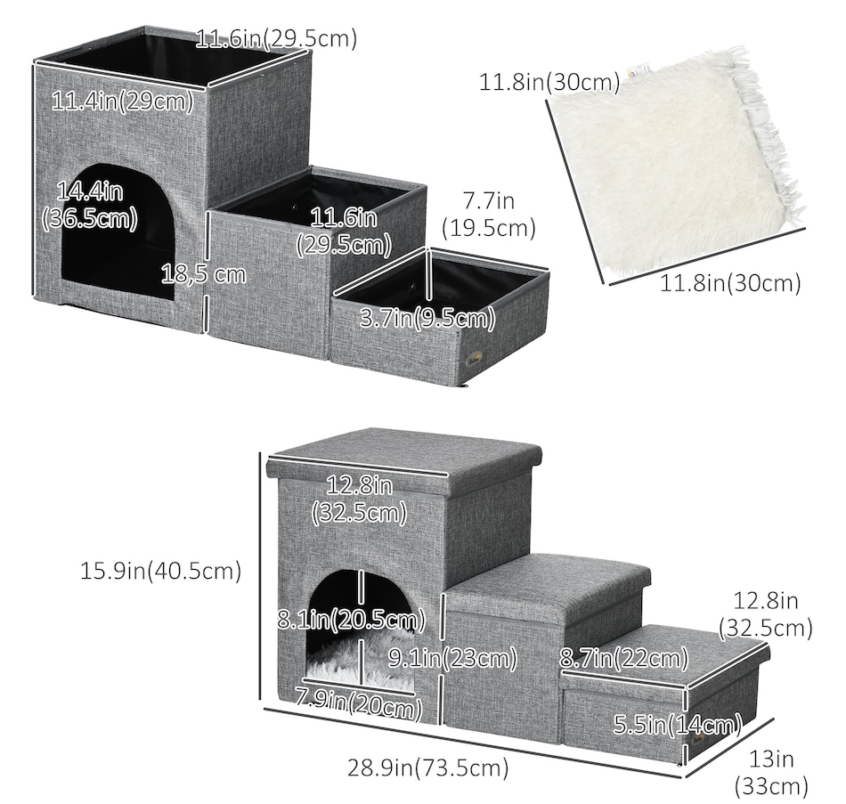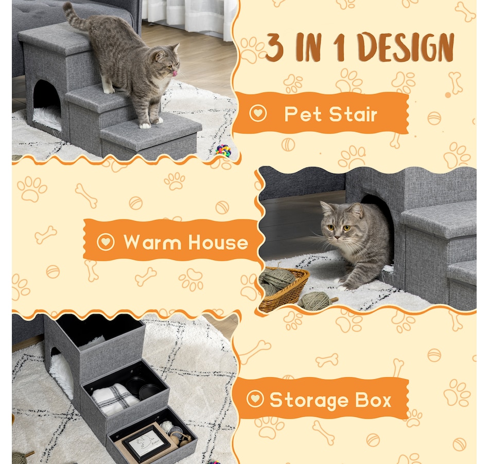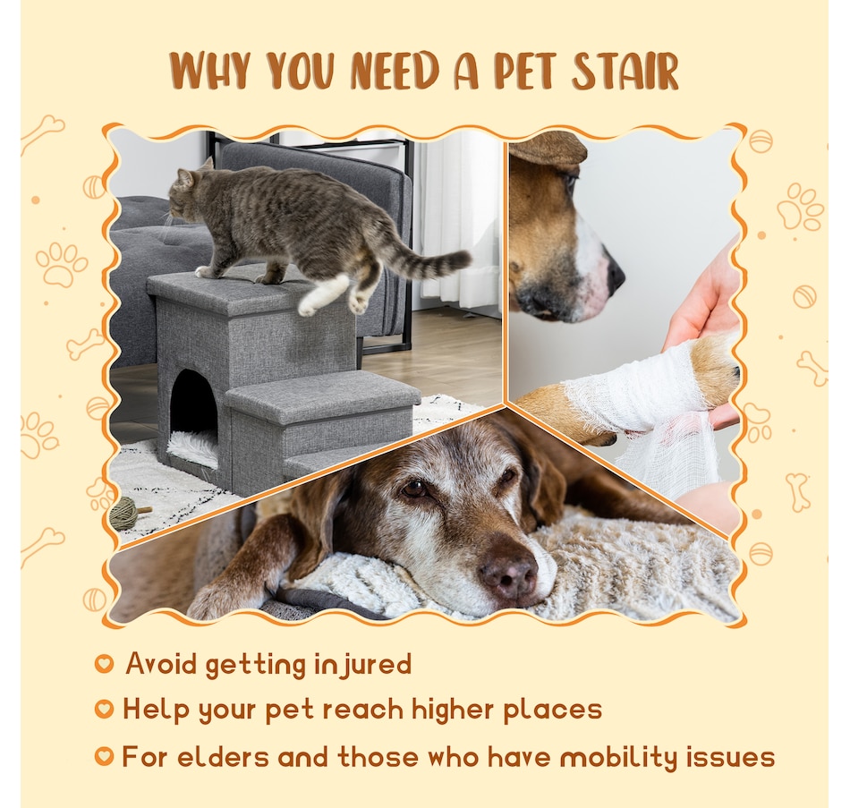 Do you know that allowing pets to climb up and down may cause joint and knee pain? Especially for senior pets or pets with mobility issues. Training pets to use dog steps for bed could be a viable solution. Our PawHut multifunction steps for dogs encourage exercise by providing a safe place to leap, jump and play. Includes a condo, your beloved furry companions enjoy curling up in it and being out of sight. And extra storage space also offers great convenience.