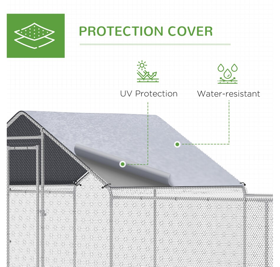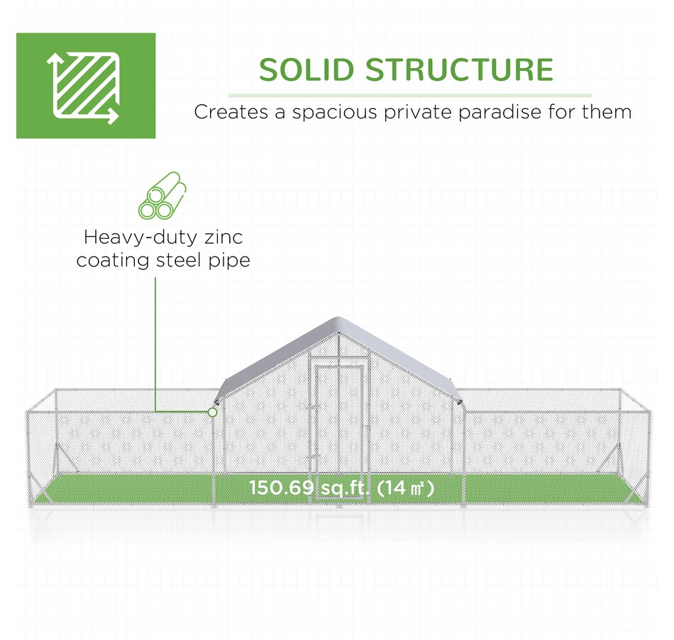 This PawHut large chicken coop is extra big and wide, allowing a multiplicity of chickens. The top roof provides more robust protection against rain while ensuring UV resistance. The design is the walk-in height for comfort. Protect your chickens in a secure surrounding with steel wire, keeping wild animals out. The interior of this poultry housing is extensive, with 150.69 sq.ft (14㎡).