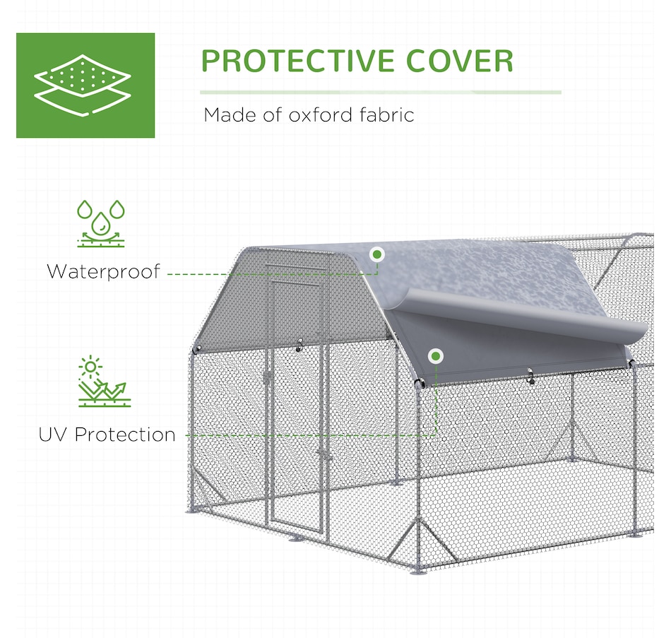 This PawHut walk in chicken coop has plenty of space, allowing a multiplicity of chickens. The top roof provides more robust protection against rain while ensuring UV resistance. The design is the walk-in height for comfort. Protect your chickens in a secure environment with enclosed wire mesh, keeping wild animals out. Let PawHut provide a happy house for your hens and other small animals.