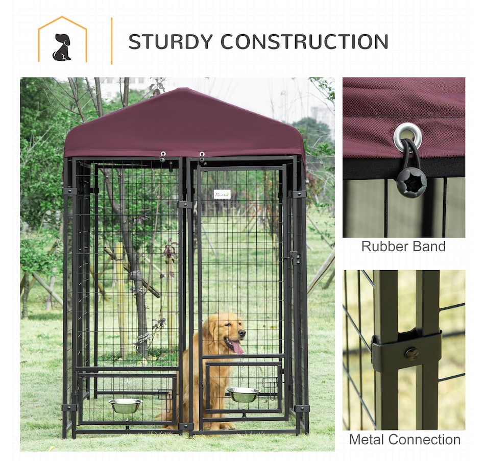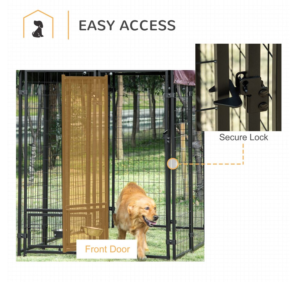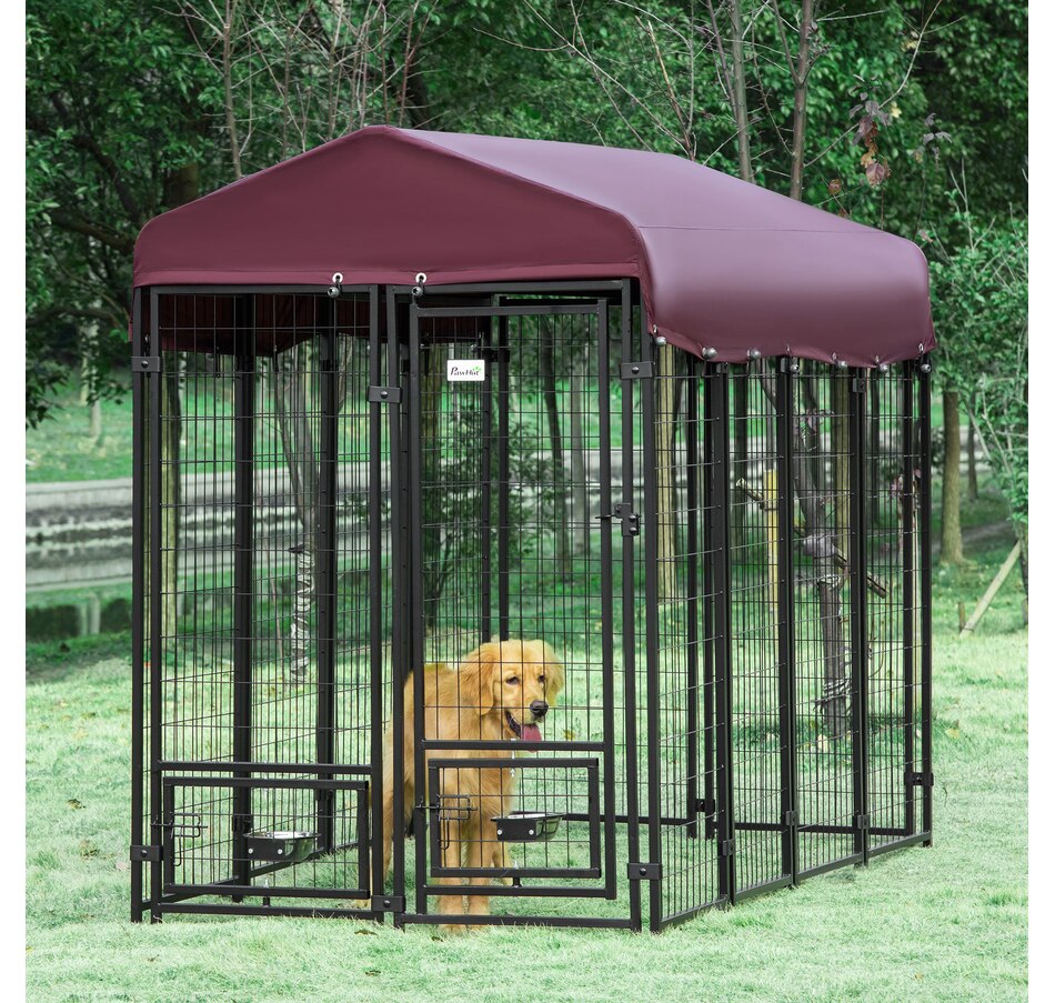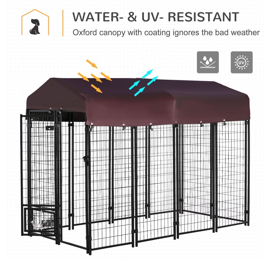 Get an excellent home for your furry friend with our PawHut dog kennel. Rust-resistant wire, top cover with solid metal roof frame, suitable height enclosure, and lockable gate with spacious room to satisfy all dog's need. Robust but easy to move outside or inside, easy to assemble or disassemble for transporting, almost zero maintenance all support a great practical kennel for your dog. Rest assured to settle your dog in the comfortable kennel and enjoy your leisure time.Features: