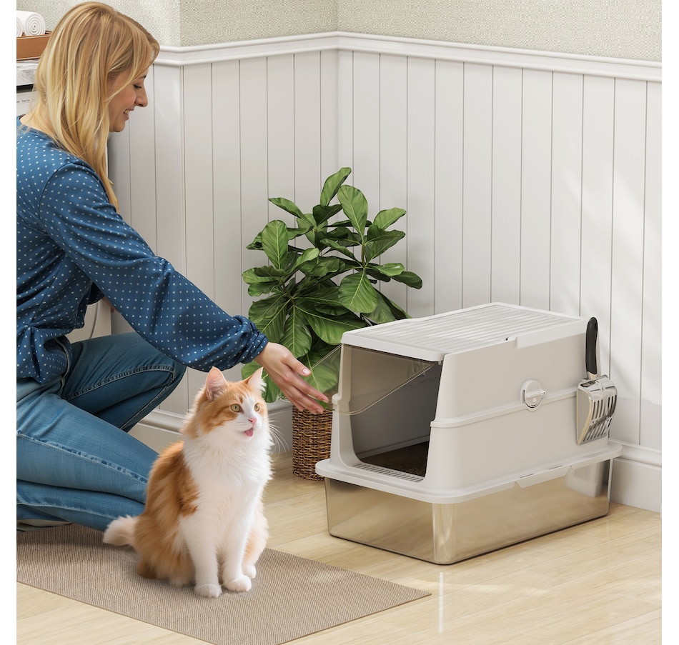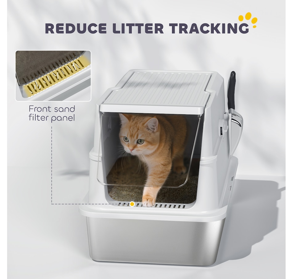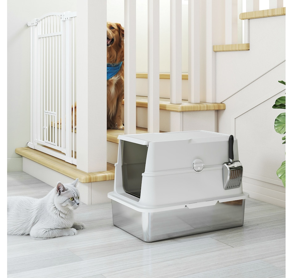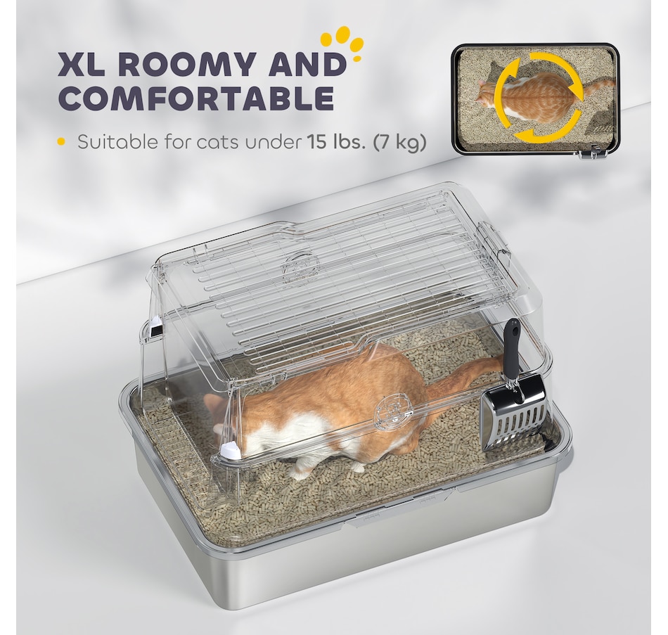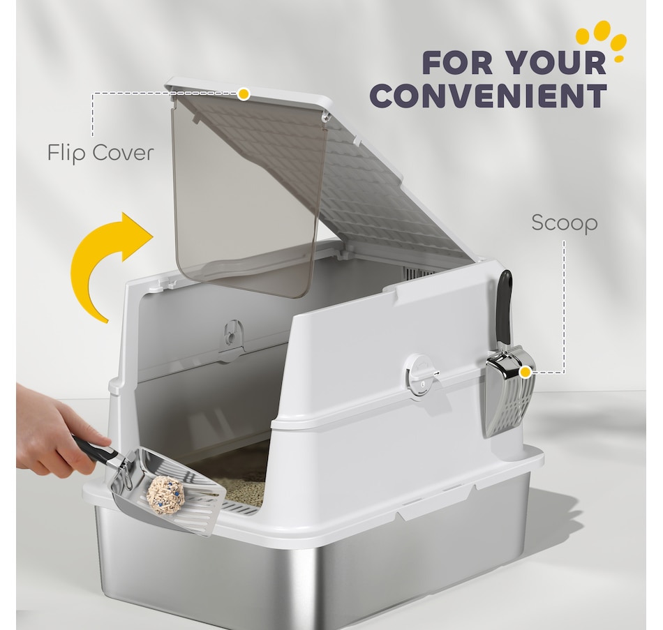 Tired of constant litter box mess and odors? The PawHut stainless steel litter box offers a solution with its scratch-resistant and odor-resistant design, ensuring easy maintenance and a healthier space for your cat. Its spacious XL interior provides comfort for even large cats, reducing cleaning hassles and enhancing your pet's experience. The top's flip-over design is great for busy pet owners to clean the tray, making routine tasks easier.
