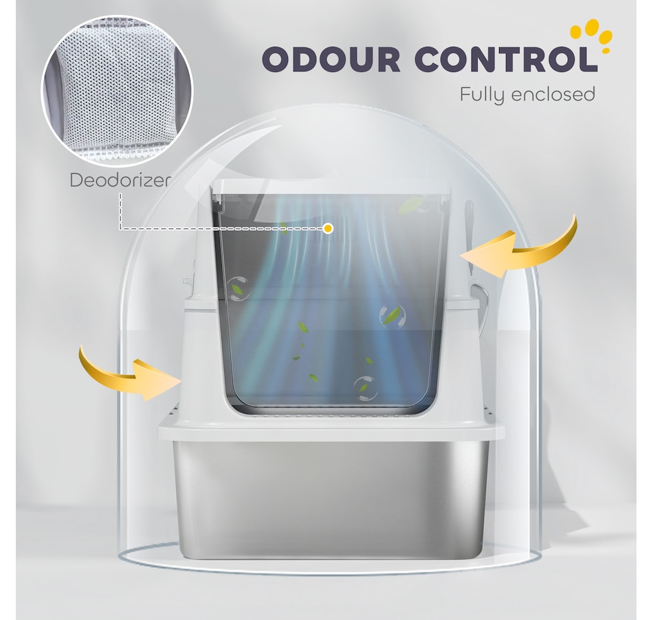 ● Fully enclosed kitty litter box locks in odors and keeps air fresh indoors;