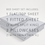 Split King - Flat Sheet: 284cm W x 284cm L (112” W x 112” L); Fitted Sheet (2x): 99cm W x 203cm L x 43cm D (39” W x 80” L x 17” D); Pillow Cases: 53cm W x 102cm L (21" W x 40” L)