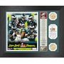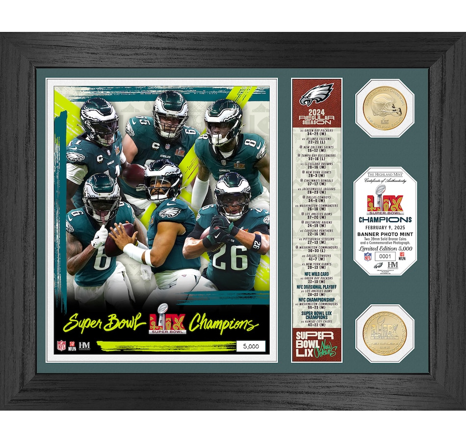 This limited edition 13" x 16" frame features (in double matting under acrylic glass) an 8” x 11” hand numbered print commemorating the Super Bowl LIX Champions Philadelphia Eagles, featuring key players combined with a banner listing the scores of every game this season as well, as the 39mm minted Super Bowl LIX Champions bronze coin and the Super Bowl LIX Bronze Coin. Issues in a limited edition of 5000 and officially licensed by the NFL and NFLPA, each has a certificate of authenticity matted in the frame between the minted coins. This product is proudly made in the USA by The Highland Mint!