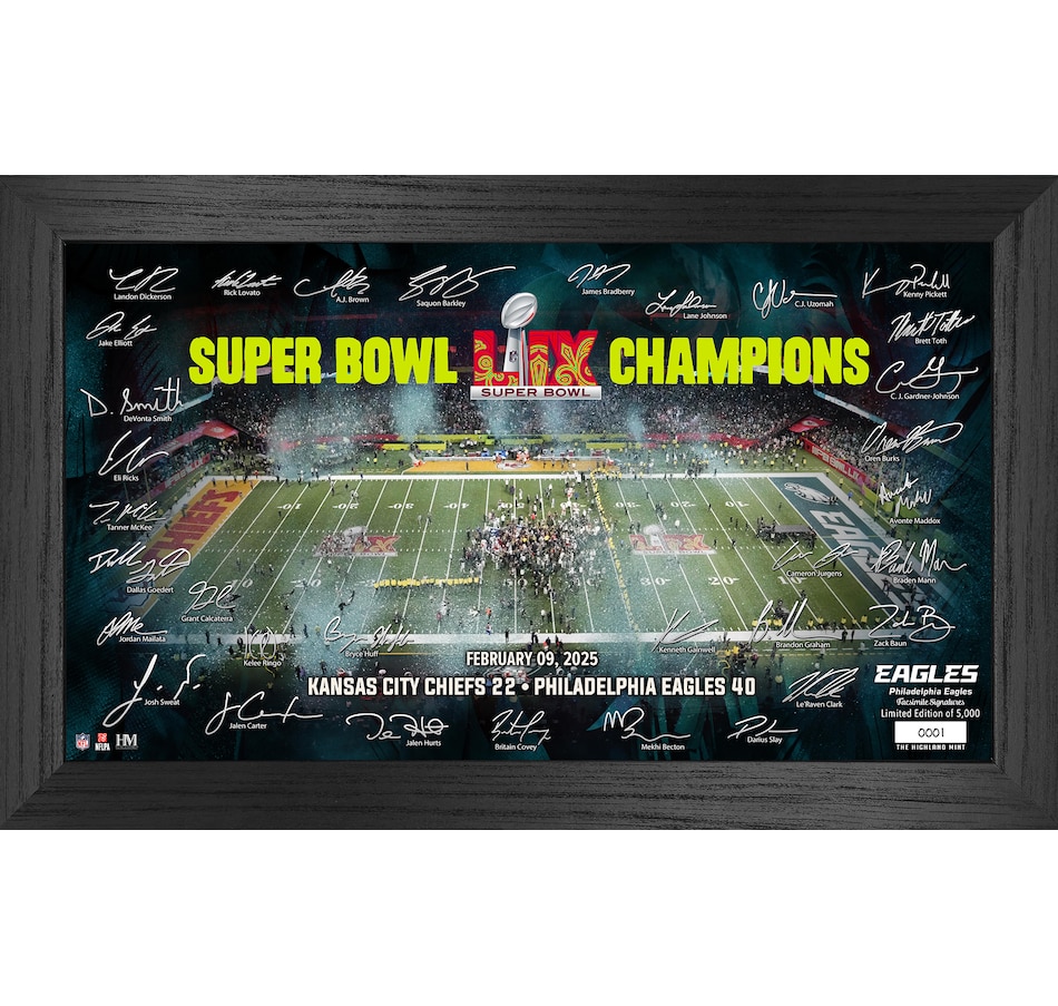 This Super Bowl LIX signature celebration features the facsimile replica signatures of the Super Bowl LIX Champions roster super imposed over an image of the post-game on-field celebration. Each print is individually hand numbered and delivered in a 12” x 20” wood frame with an acrylic glass front panel. This collectible is a limited edition of only 5,000, and each photo mint is accompanied with a certificate of authenticity. It is officially licensed by the NFL and NFLPA and proudly made in the USA by The Highland Mint. Please note, some players on the roster may not appear on the print.