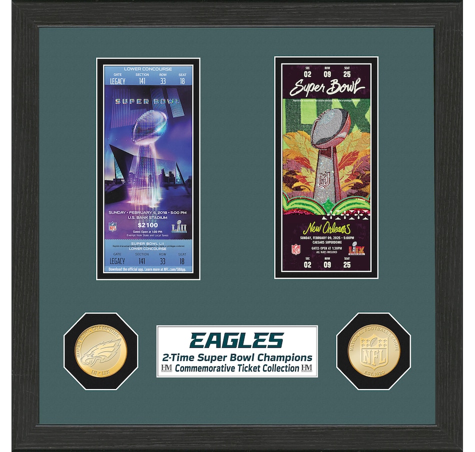 This 13" x 13" wood frame with double matting features under acrylic glass the exact replica Super Bowl tickets for each of the Philadelphia Eagles two titles, combined with a two-time Super Bowl Champions bronze coin and an NFL shield coin. Officially licensed by the NFL, each frame is accompanied by a certificate of authenticity and proudly made in the USA by The Highland Mint.