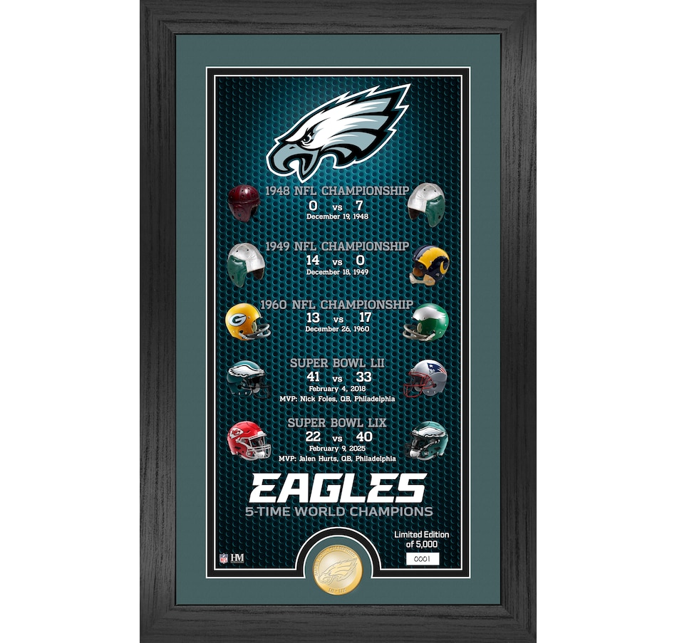 This piece commemorates the Super Bowl LIX Champions Eagles and their Super Bowl titles! Featured in a 12" x 20" frame with a glass front panel and double matting is a 15" x 7" hand numbered commemorative print that shows the Eagles dueling helmets worn during that era with the scores, dates and MVP's from each of their Super Bowl titles. Highlighting this unique collectible frame is a minted 39mm Eagles five-time Super Bowl Champions bronze coin. As a limited edition of 5000 and officially licensed by the NFL, each one is delivered with a certificate of authenticity. This product is proudly made in the U.S.A. by The Highland Mint.