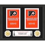 This collection commemorates the Philadelphia Flyers Stanley Cup championships, with a commemorative banner for each season and minted coins. It is featured in a 15" x 12" wood frame with acid free matting, with a banner commemorating each title. Along with the banner is a fact card matted above each one. Matted below the banners is a 39mm minted Philadelphia Flyers bronze coin and a 39mm minted NHL commemorative coin. Each frame has a certificate of authenticity adhered to the back. This product is officially licensed by the NHL and proudly made in the USA by The Highland Mint!