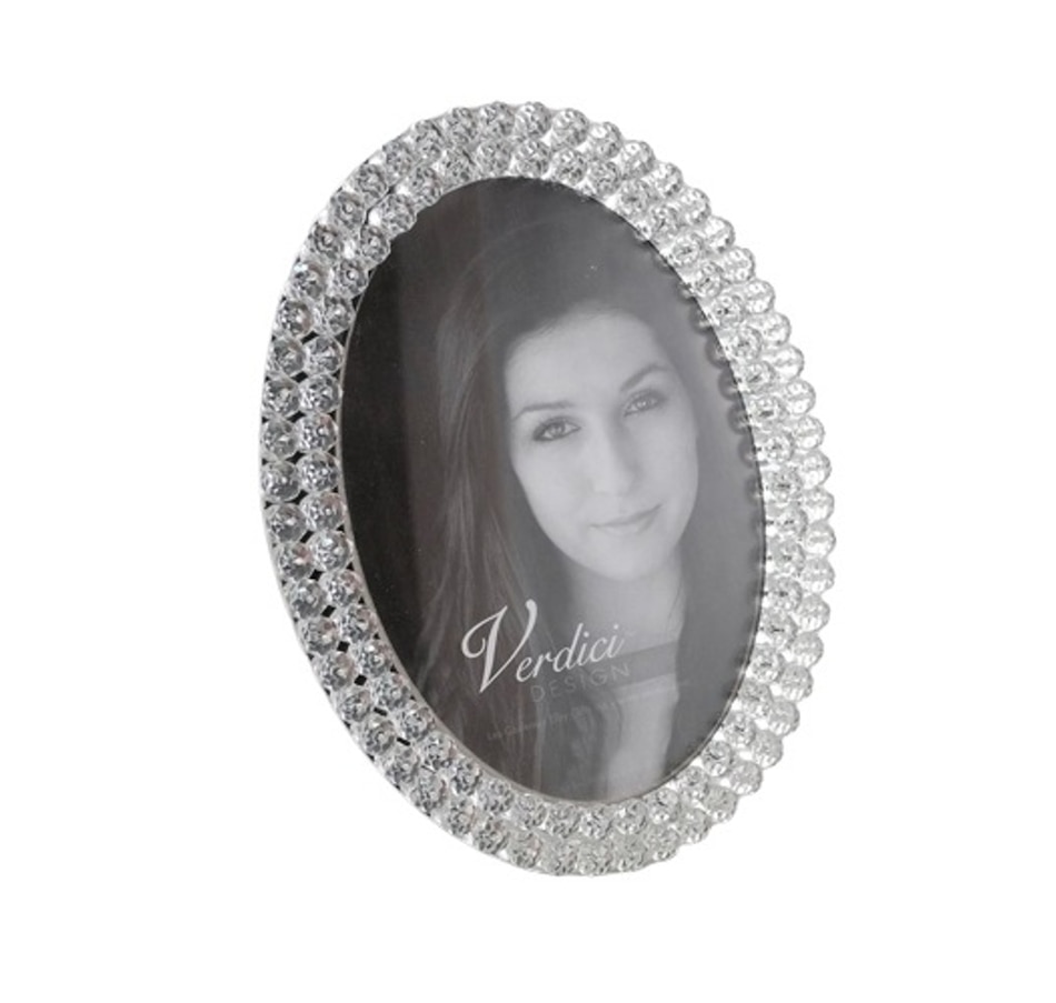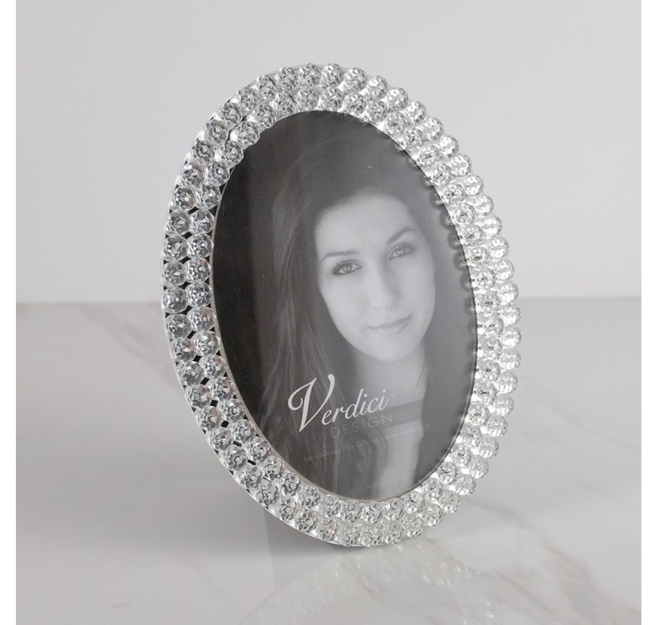 Design: The frame is described as classic and comes in an oval shape, adding a touch of elegance to your photos. .Size: The frame itself measures 9 x 11 x 1 inches, making it a substantial and eye-catching piece for displaying your photos..Photo Size: It's designed to hold photos that are 8 x 10 inches in size, which is a common standard for photographs..The inclusion of crystals likely adds a touch of sparkle and sophistication..