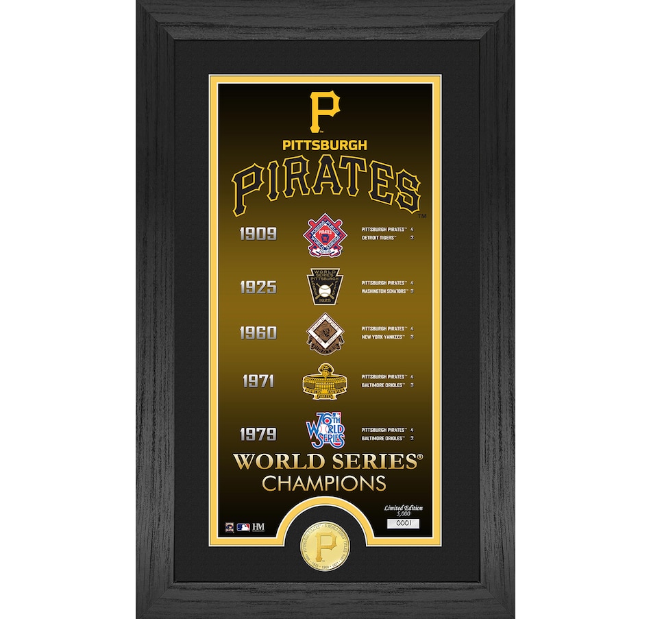 This is a limited edition piece commemorating the Pittsburgh Pirates World Series Championships! This 12"x 20" frame with double matting and a glass front panel features a custom and individually numbered 15" x 7" commemorative photo listing each of their World Series, and a minted 39mm solid bronze team commemorative coin. A limited edition of only 5000, each photo is hand numbered and each frame is accompanied by a certificate of authenticity. This item is officially licensed by the MLB and proudly made in the U.S.A. by The Highland Mint!