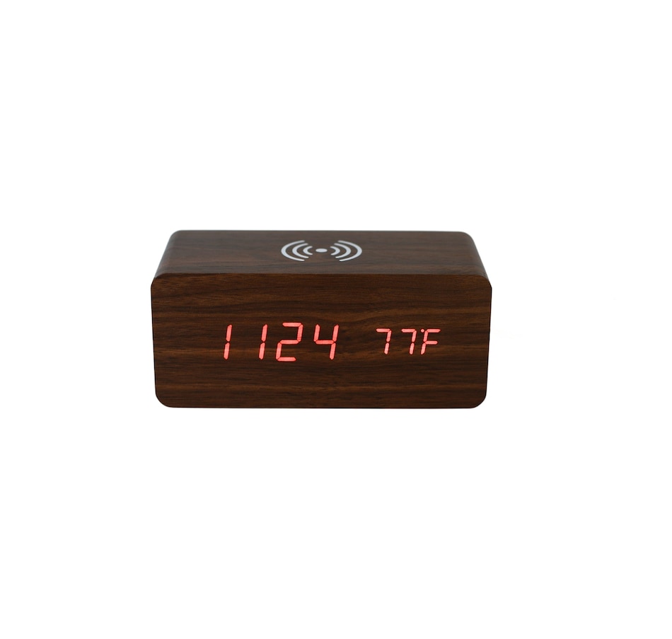 Revamp your space with the Walnut Wireless Phone Charger/Digital Clock¢â‚¬â€an ingenious blend of modernity and practicality.Wireless Charging: Compatible with most wireless charging cellphone models for a clutter-free charging experience. Ideal for your phone's bedside spot.Smart LED Display: High-definition LED screen showcasing time, date, and temperature with adjustable brightness levels for comfortable viewing. Dimensions: 7.28 x 3.43 x 3.35 inches.Intelligent Alarms: Set up to 3 alarms to cater to your various working hours. Easily adjust settings with the SET key for a personalized wake-up routine.Voice Control: Activate power-saving mode with a simple tap or a sound above 60 dB to wake up the screen. Enjoy hands-free interactions with voice control functionality.Chic Wooden Design: Crafted from delicate and smooth bamboo, adding an elegant touch to your room while serving as a functional wireless phone charger.