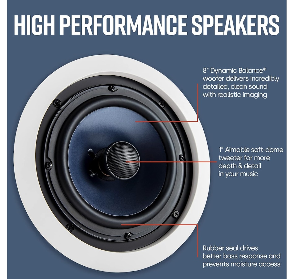 • Experience more balanced and lifelike sound: features an 8" dynamic balance woofer and a 1" aimable tweeter for more depth and detail in your music; mineral-filled polymer cone and strong composite driver baskets create wider dispersion for even-sound coverage