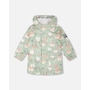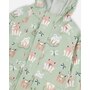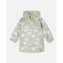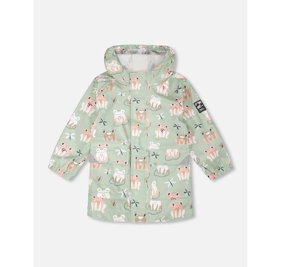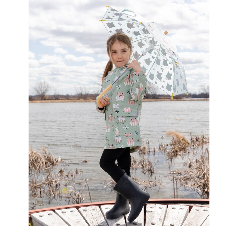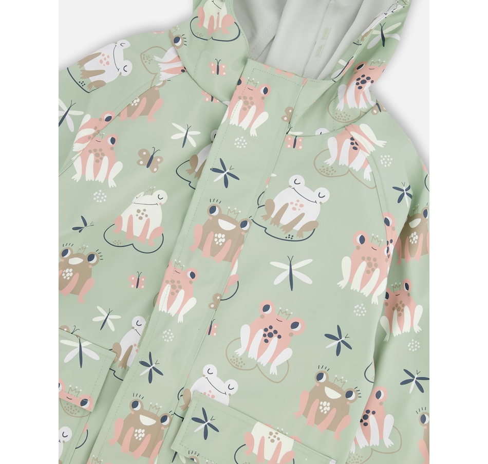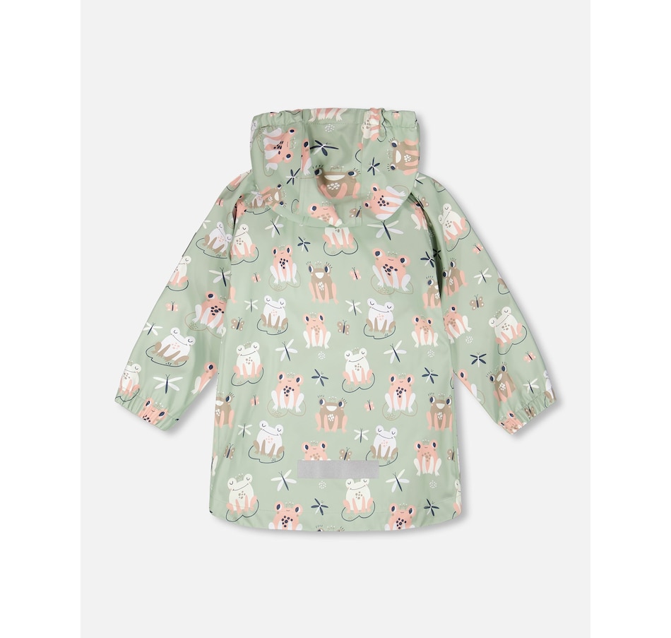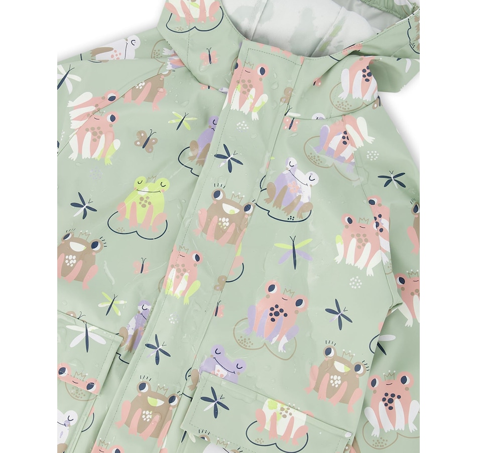 Our polyurethane rain jacket in green with frog print makes rainy days magical and fun. Designed to change color when it gets wet, it keeps girls dry and happy with its 3,000 mm waterproof coating and welded seams. Featuring an allover frog pattern, a hood, reflective bands, and an identification label, this playful raincoat offers both protection and charm.