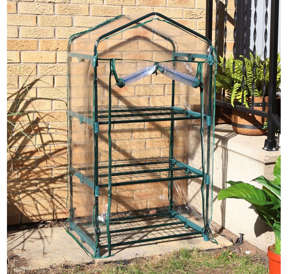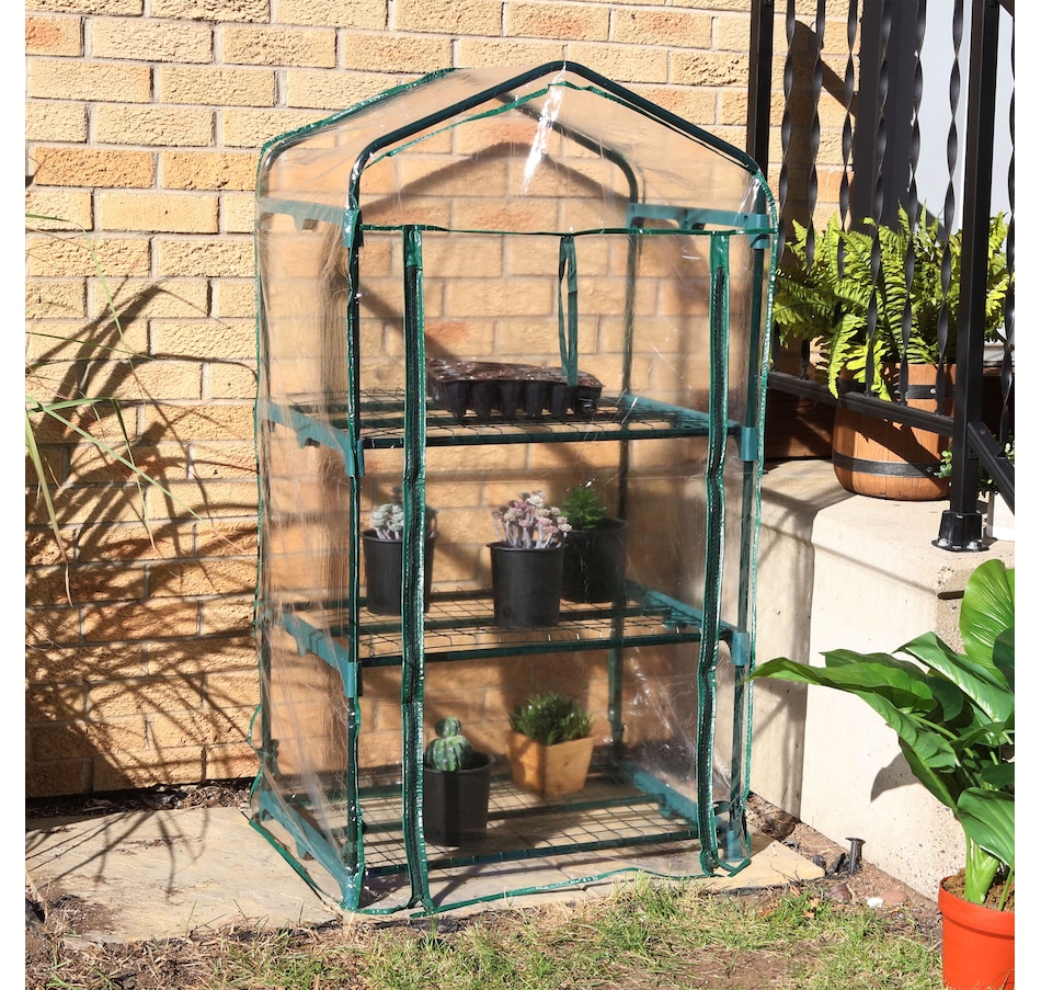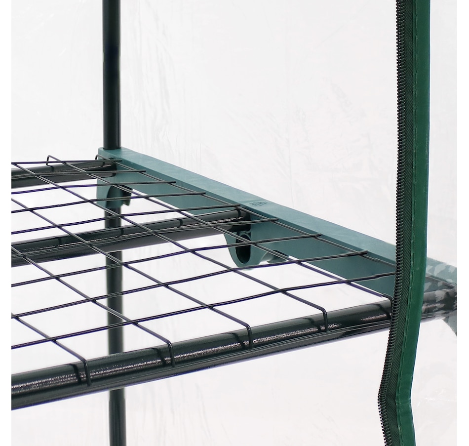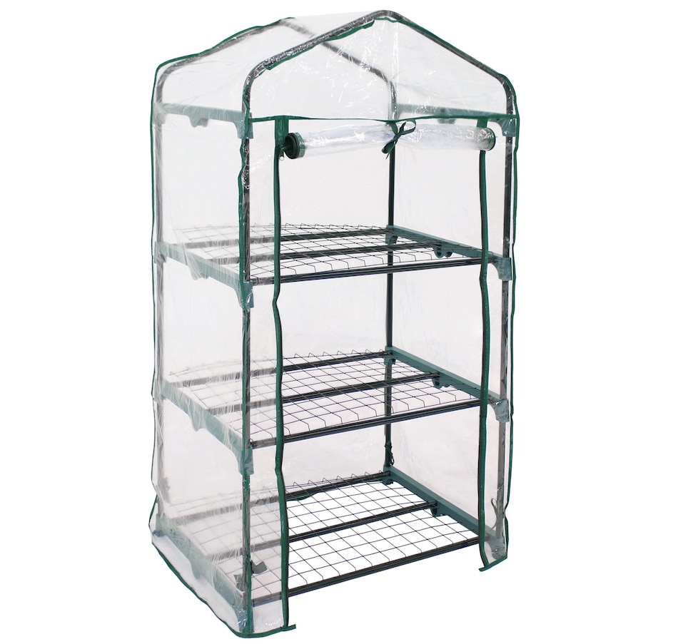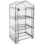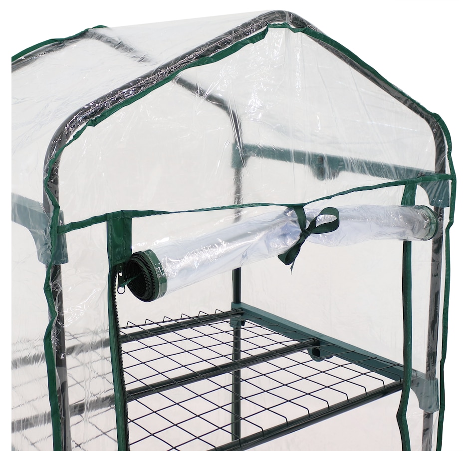Have a successful growing season with help from this small greenhouse for plants. With three shelves for growing plants and storing supplies, this portable mini greenhouse is great for creating just the right climate for growing vegetables, herbs, fruits, and flowers. This greenhouse is durably constructed from an iron tube frame with steel wire shelves and a polyethylene covering coated with a UV ray protective finish. The durable cover protects plants from inclement weather, like frost and excessive heat or too much moisture. The cover of this mini greenhouse is transparent so light can filter through to ensure plants receive the right amount of sunlight needed to grow. A roll-up door makes accessing plants easy and allows for controlled airflow in and out of the greenhouse. Simply tie the door up to keep it open or untie and zip the sides down to keep it closed.