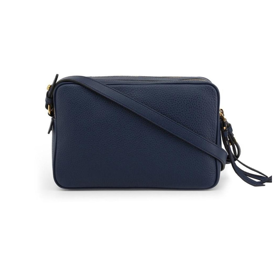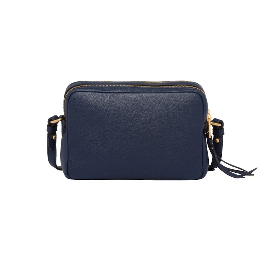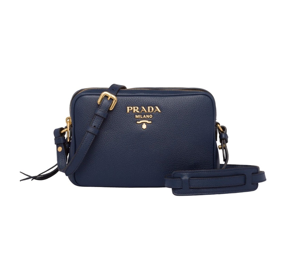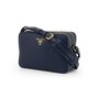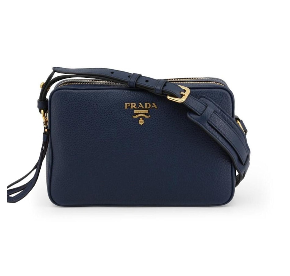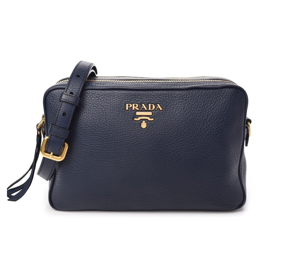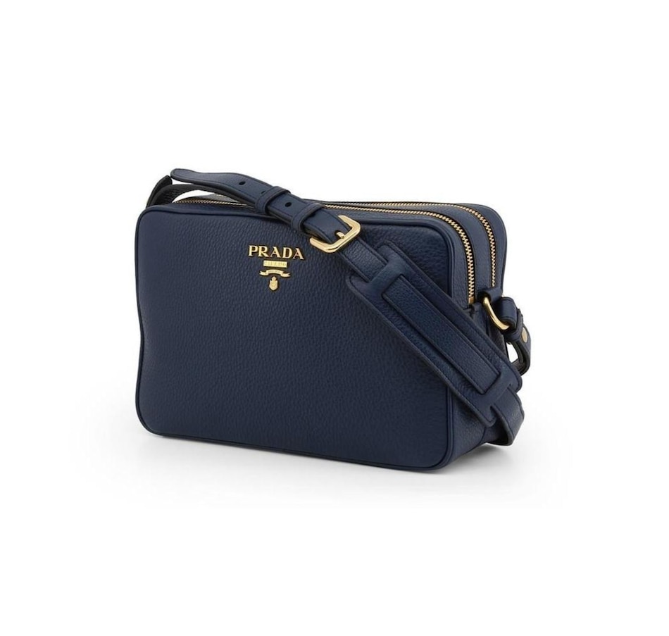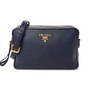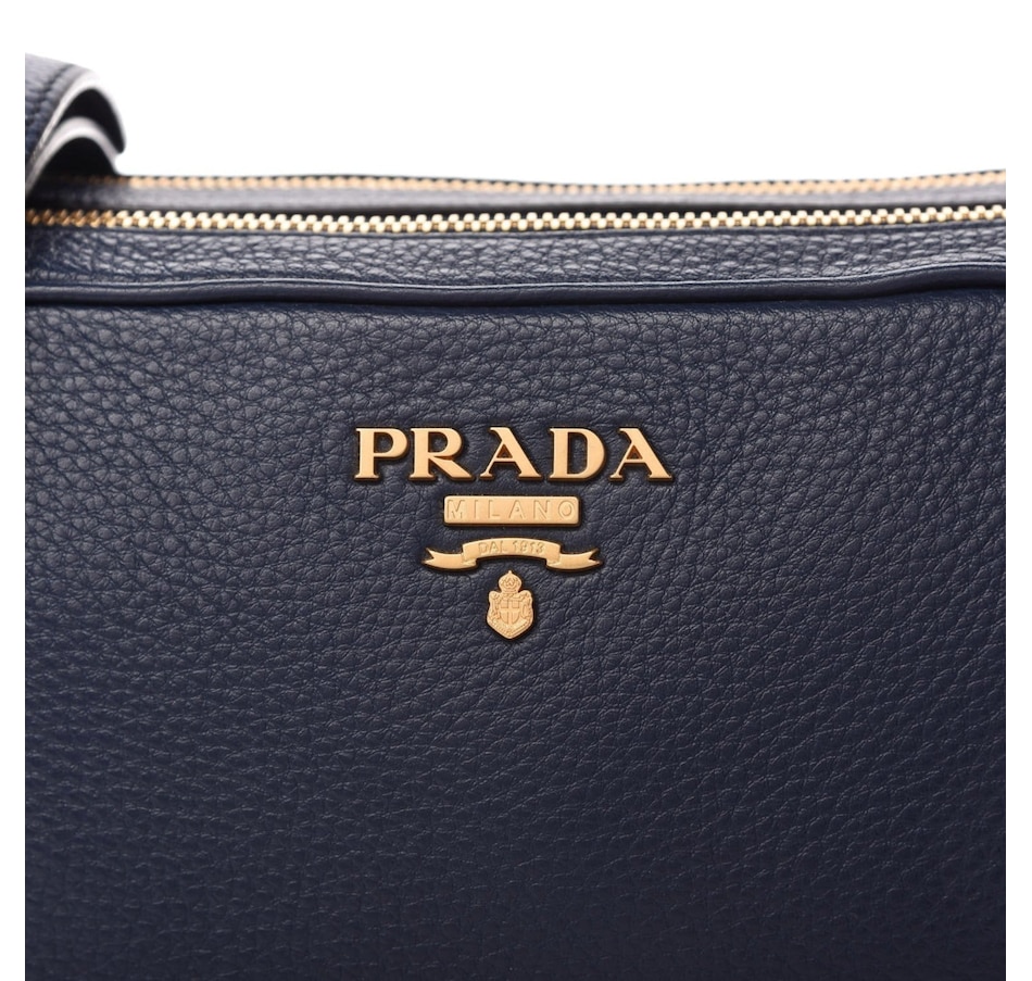 This crossbody bag is crafted with navy blue vitello phenix leather. The bag features a gold Prada Milano logo on the front and an adjustable leather strap. The two zipper compartments open to a spacious jacquard lined interior that allows for convenient storage and organization. This Prada handbag is great for everyday use with the distinctive quality and style of Prada!