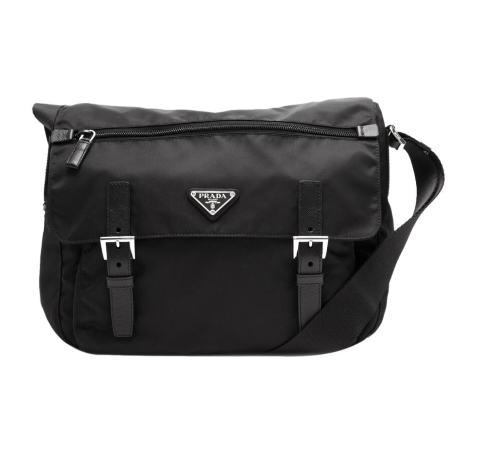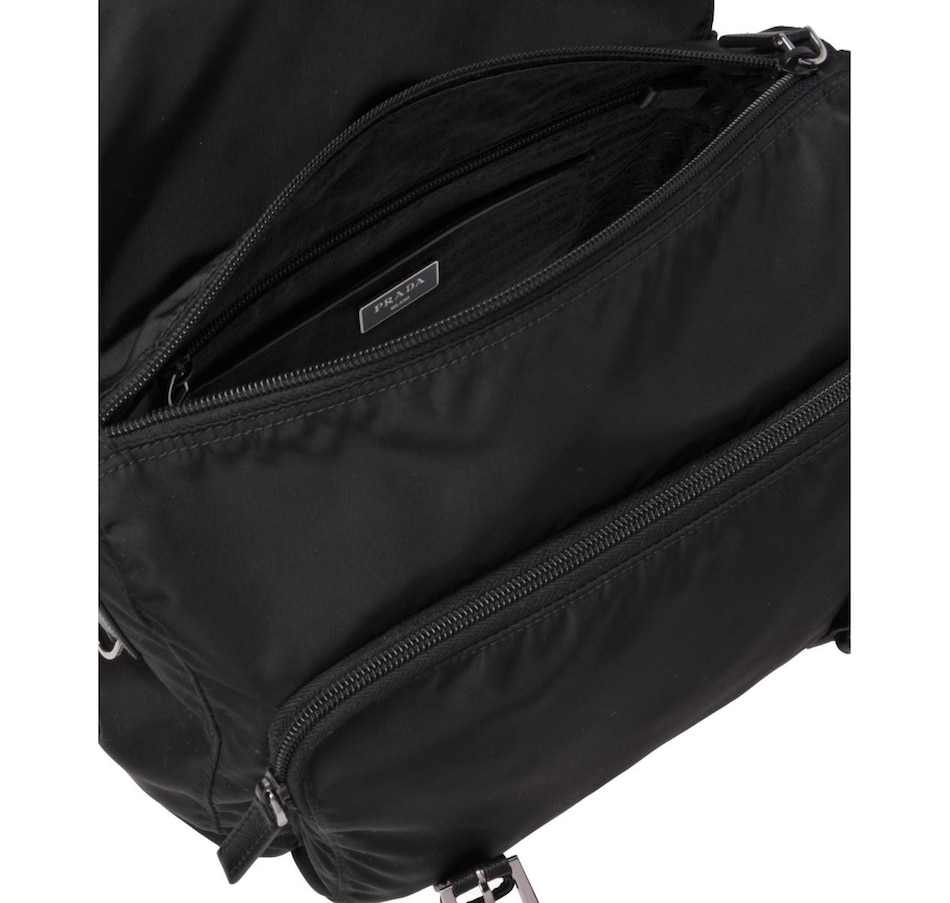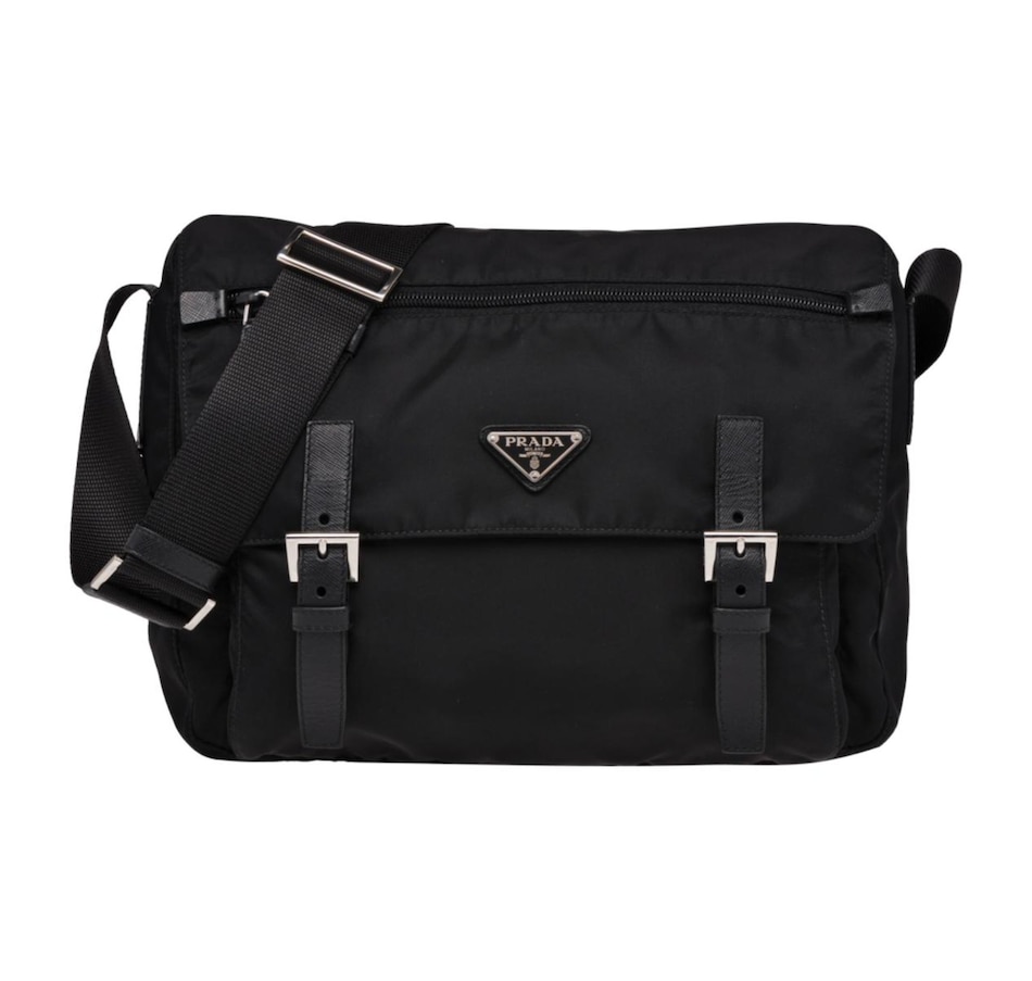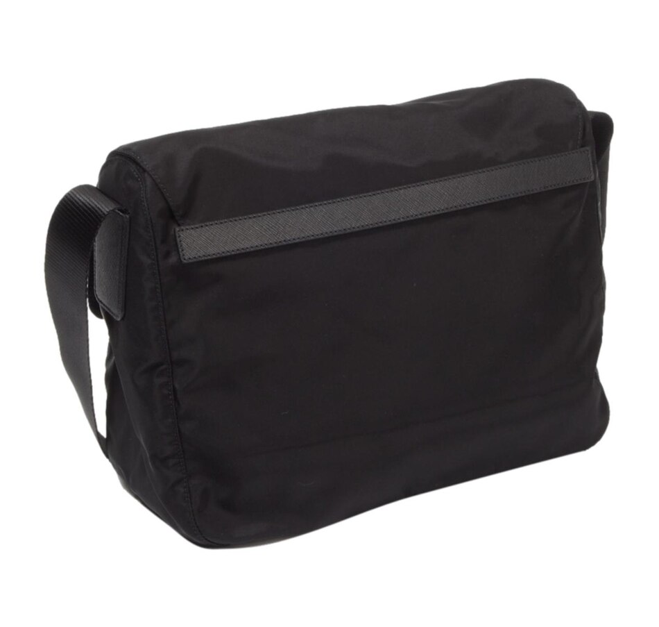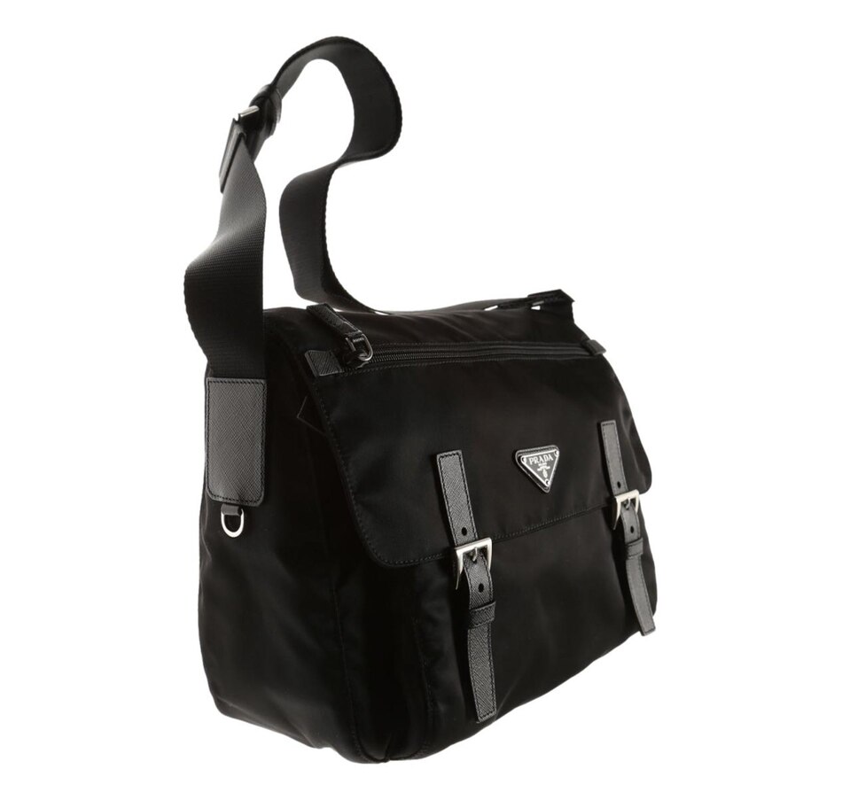 Versatile and light weight, the Prada nylon fabric crossbody bag in black is stylish, easy to carry, and practical for many uses. The thick adjustable shoulder strap gives you the support you need while carrying this essential designer messenger.