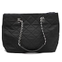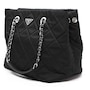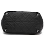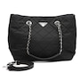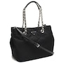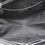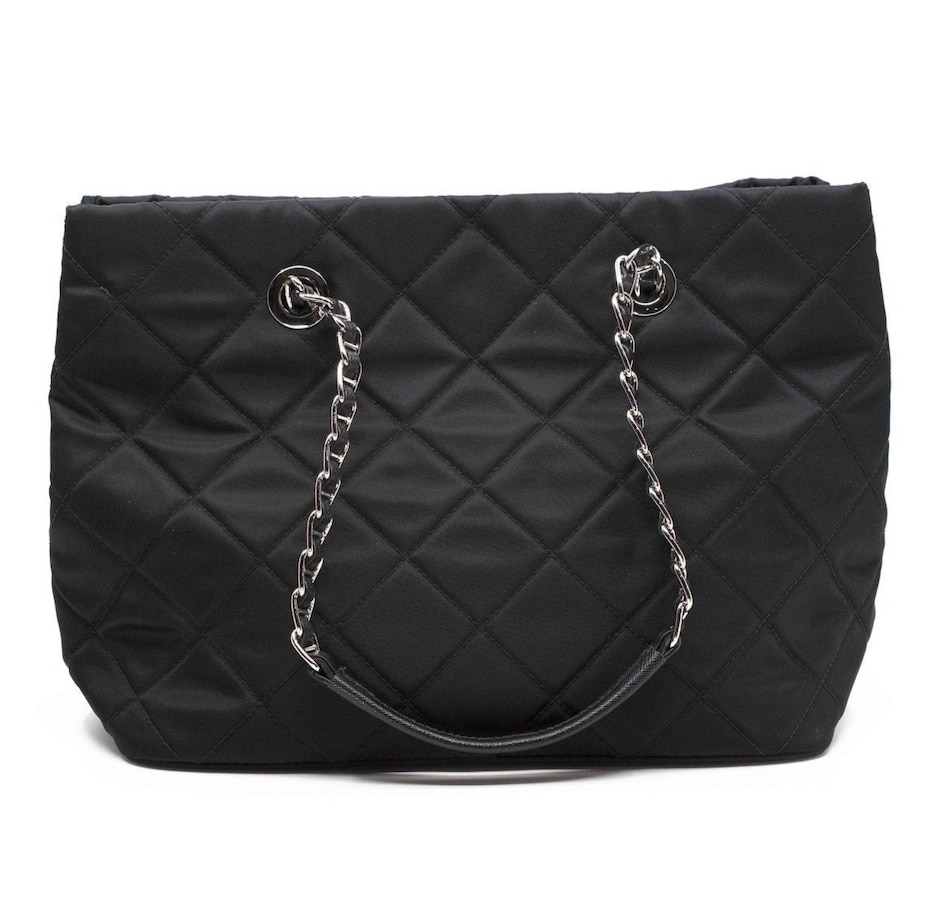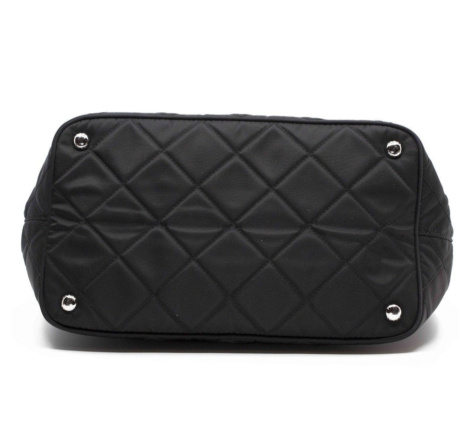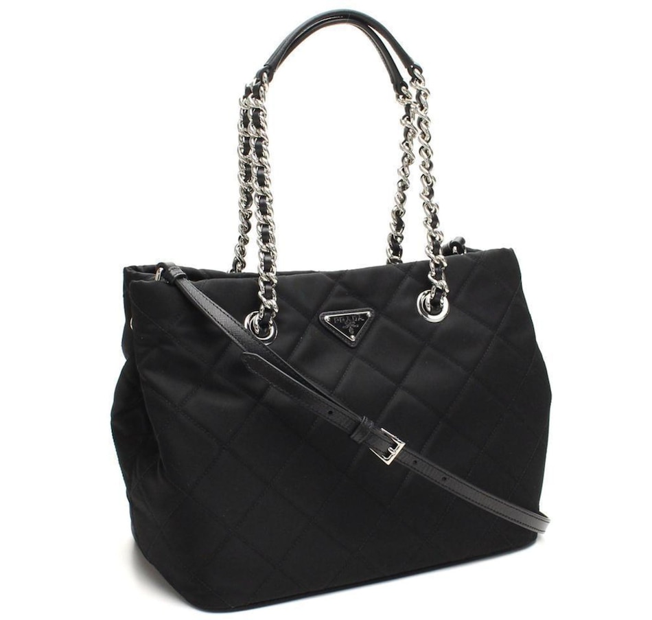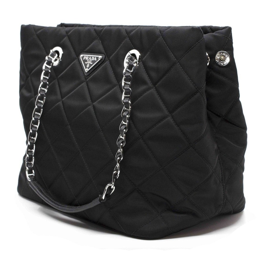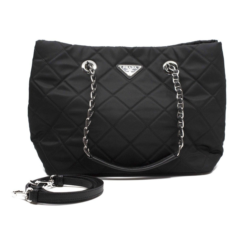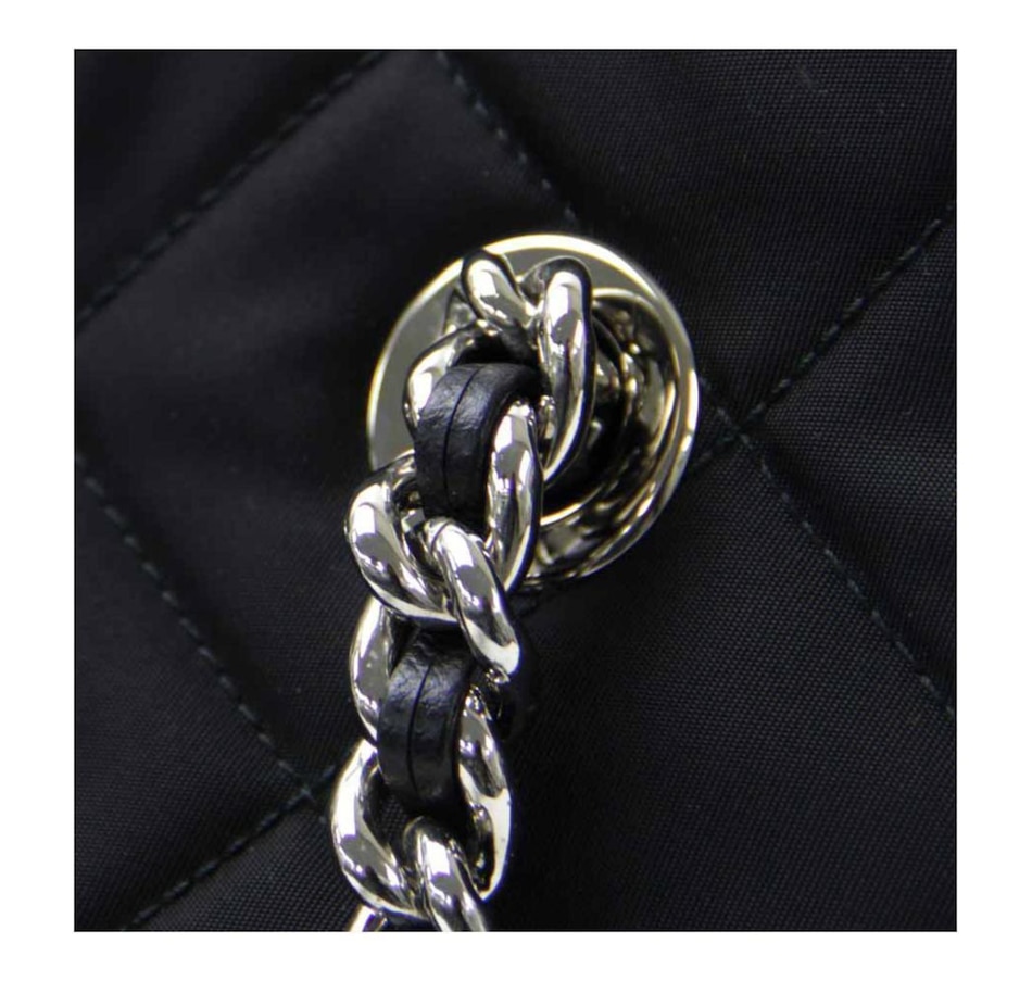 This Prada Nylon Bag is perfect for everyday use. The nylon is easy to care for and black goes with everything. There are two chain handles with leather shoulder pads for comfort as well as a detachable and adjustable leather strap. The Prada triangle logo is made of enamel and featured on the front of the bag. The interior is spacious with a zippered compartment and two slip pockets. There are protective bottom feet to ensure that when you set this bag down the nylon won't be resting directly on the floor.