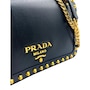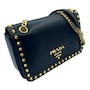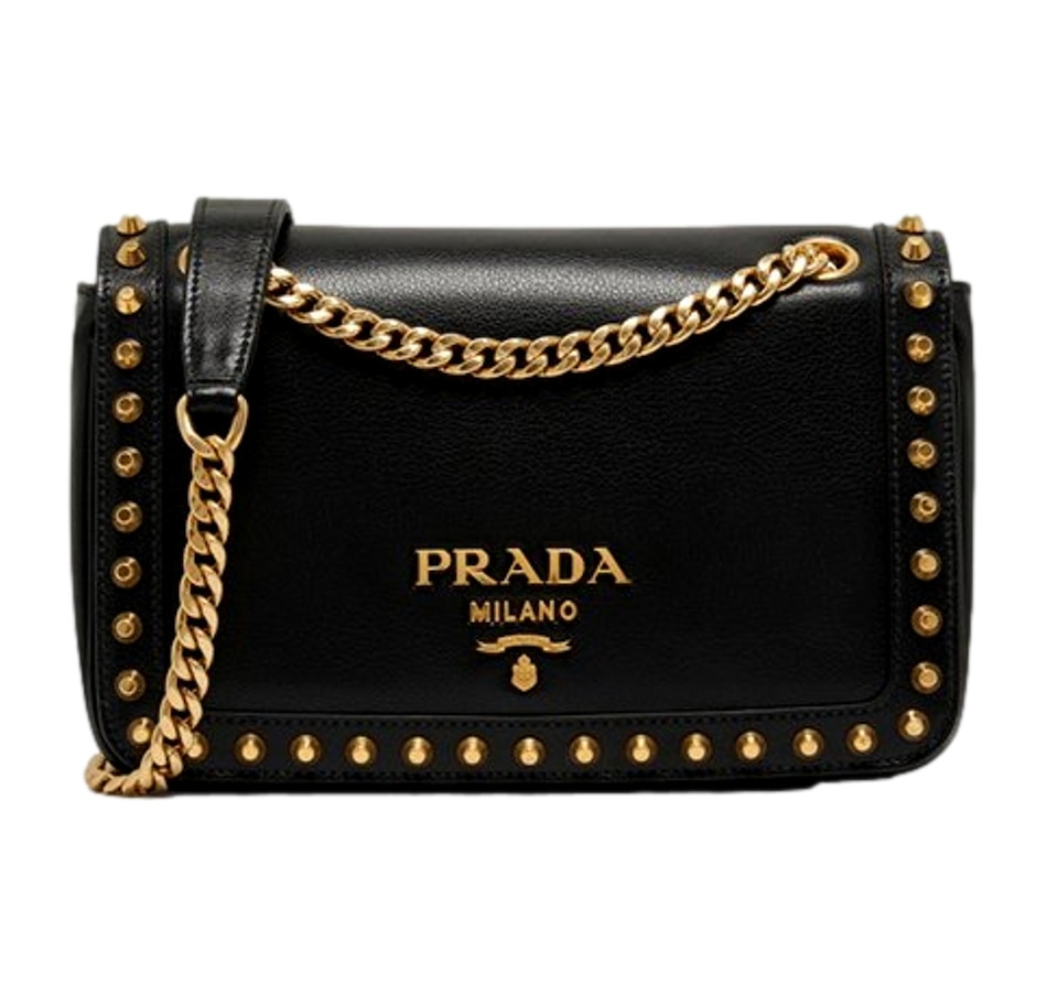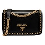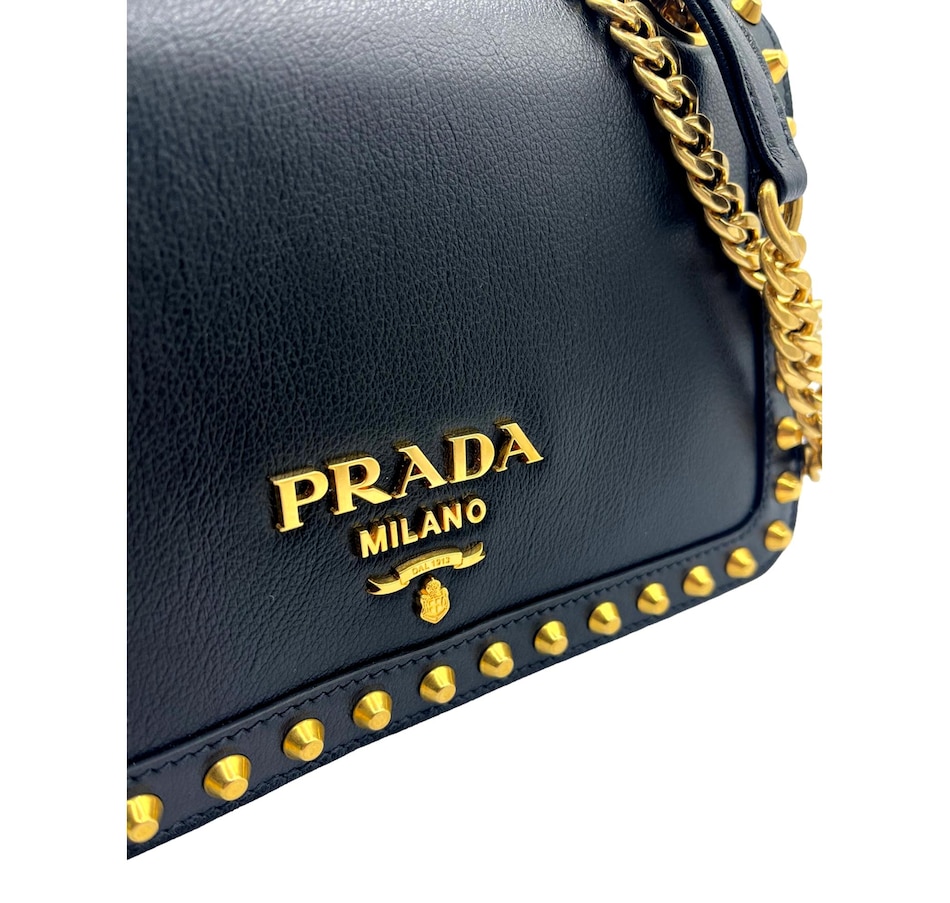 This show stopping Prada crossbody bag is crafted from black calf leather and is adorned with gold studs on the front face, along with the iconic logo plaque. The black jacquard-lined interior is conveniently equipped with a slip and zipper pocket for organizing your essentials in style. Versatile and fashion forward, this handbag features a sliding gold chain and leather strap that can be worn as a crossbody or shoulder bag. Effortlessly transition from day to night styles with this sophisticated and edgy crossbody bag, only from Prada. Model: 1BD147 Black Glace calf leather Gold Stud Accents Gold Prada logo plaque Gold-tone hardware Magnetic snap button closure Black jacquard lining 1 interior zipper pocket 1 interior slip pocket Gold chain and leather strap, Drop: 21" Measurements: 9" x 2.2" x 6" (LWH) Includes authenticity cards and Prada dust bag. Made in Italy
