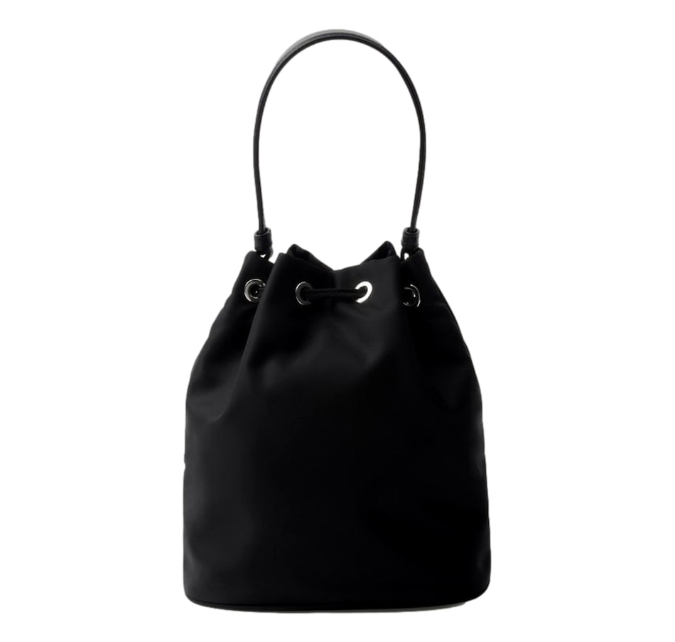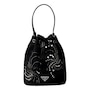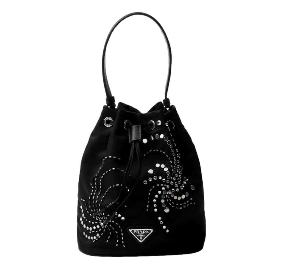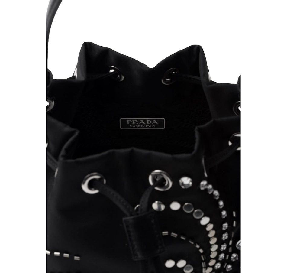 Delicately adorned and meticulously crafted, the Prada Re-Nylon Mini Drawstring Bucket Bag in Black Beaded Embroidery is a radiant expression of the house’s commitment to sustainability, craftsmanship, and modern opulence.