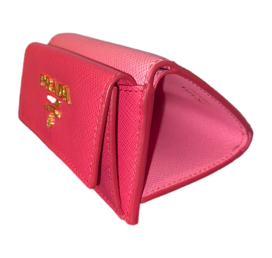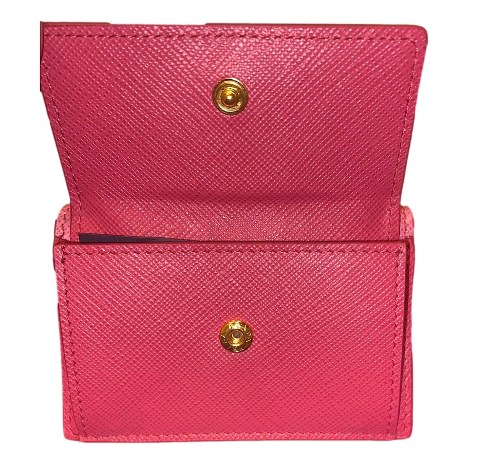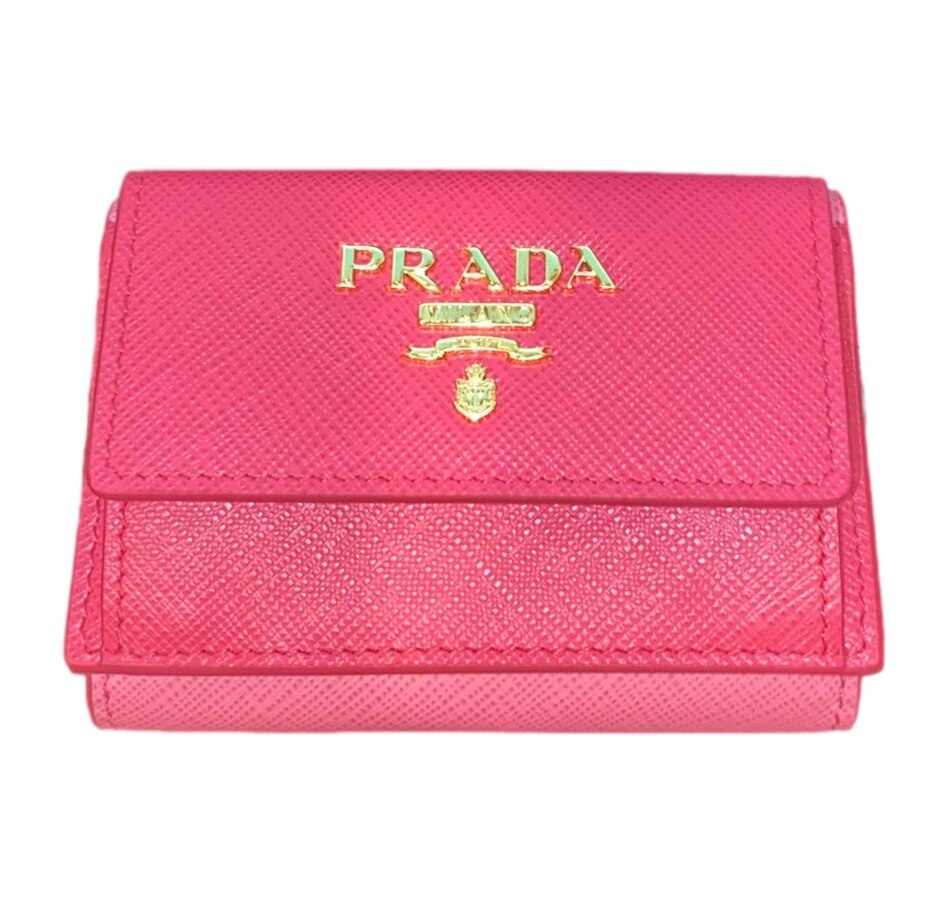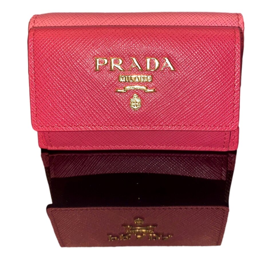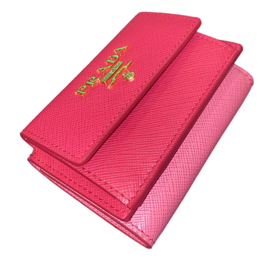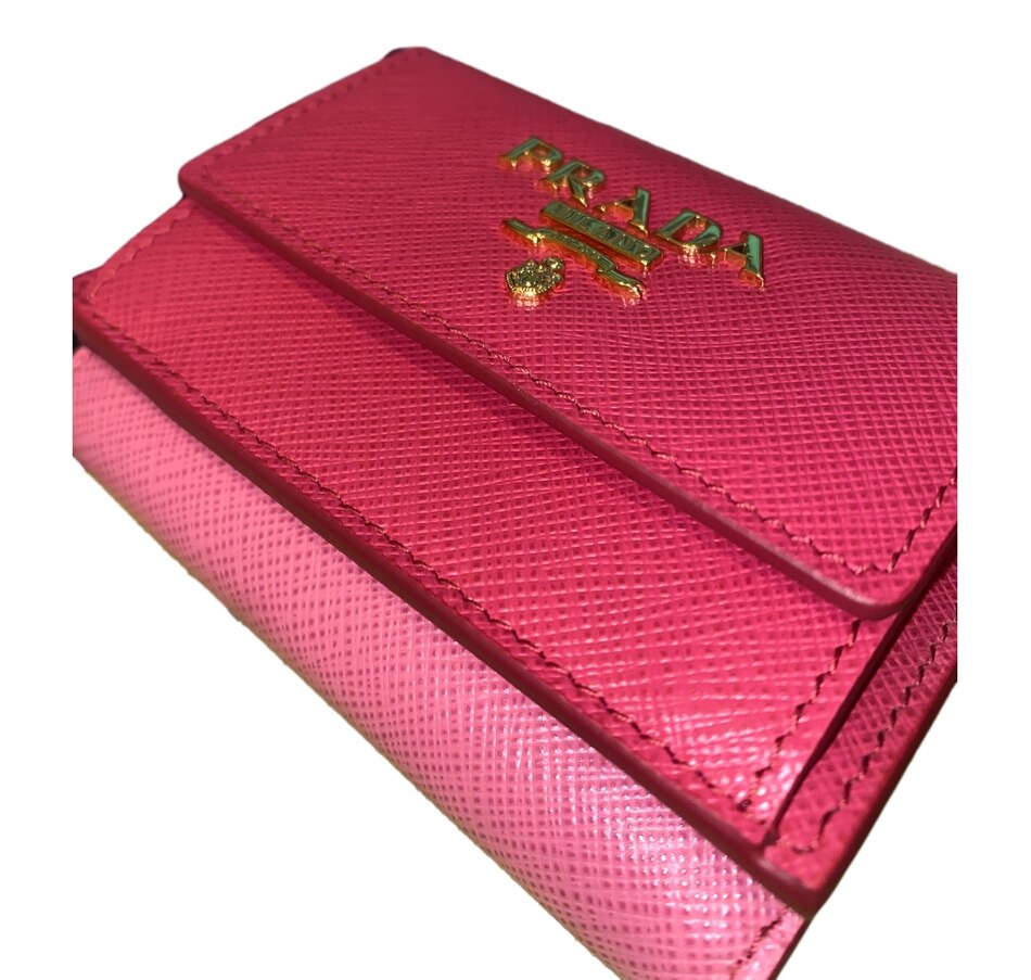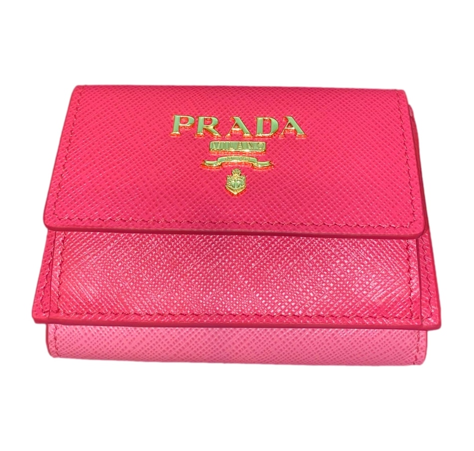 The Prada Two-Toned Pink Tri-Fold Saffiano Wallet is a stunning blend of elegance and functionality. Crafted from luxurious Saffiano leather, known for its durability and refined texture, this wallet features a striking combination of soft peony pink and rich begonia hues that exude sophistication.