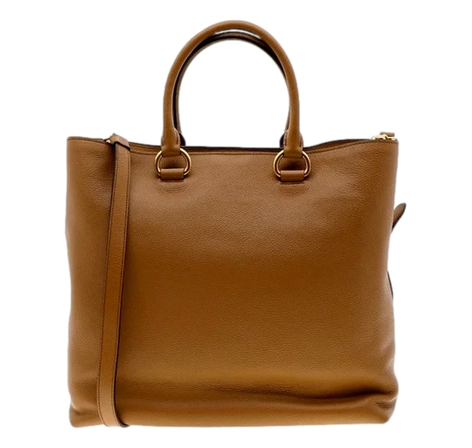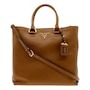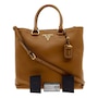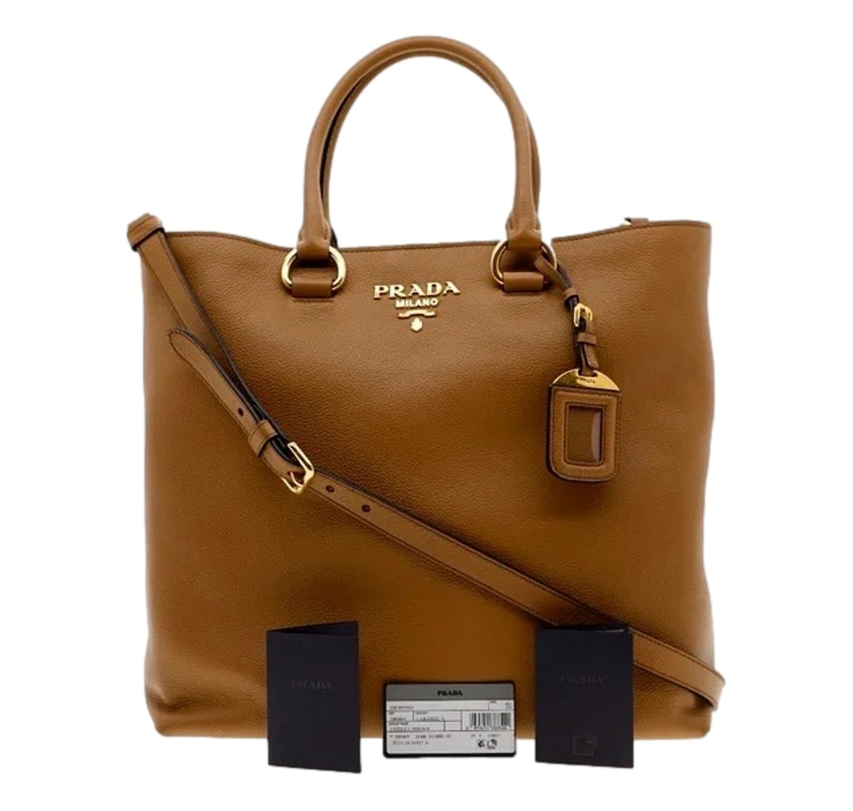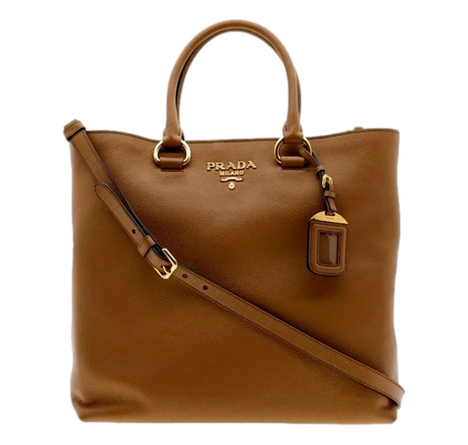 This Prada Women's Brown Vitello Phenix Leather Shopping Tote is the perfect bag to shop and run your errands with. Prada's luxurious Vitello Phenix handbag is the ideal designer tote for carrying all of your belongings in. There is plenty of storage space to store your personal items. There are three interior pockets and the snap closure makes it easy to access your belongings. This is also a great travel handbag to carry on trips or airplanes when you are on the go. This is such a classic Prada design and goes perfect with everyday looks.