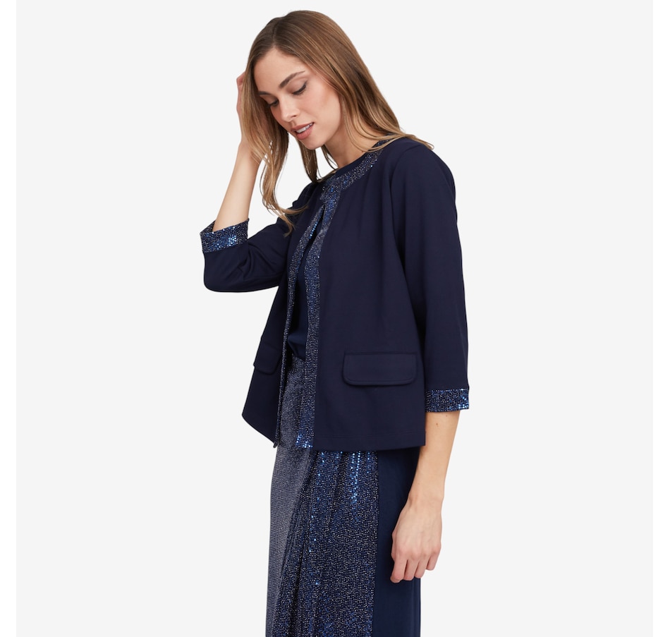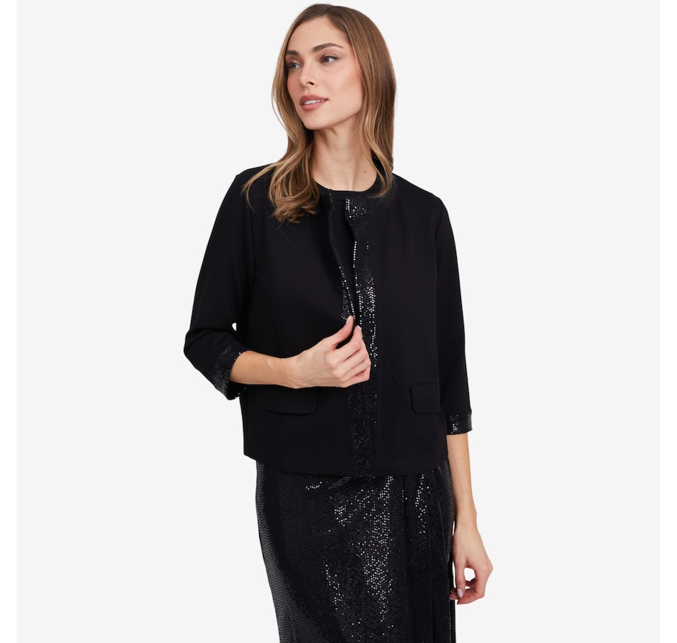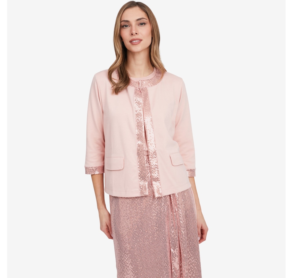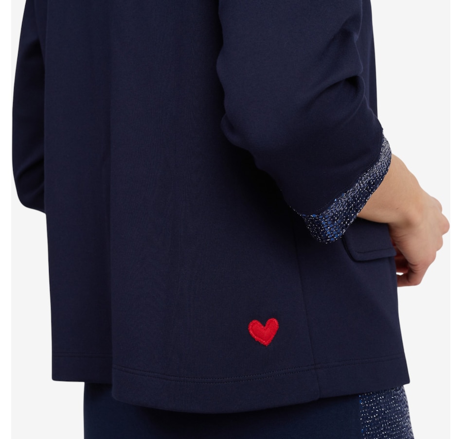 This Frostine from Preloved is a jacket-like cardi that feels like a sweatsuit, and made with ponte fabric. It is a dressy cardigan with sequin trim along the neckline, front plackets and sleeve cuff. It finishes with the upcycled Preloved red heart patch on the back and is made in Canada too.