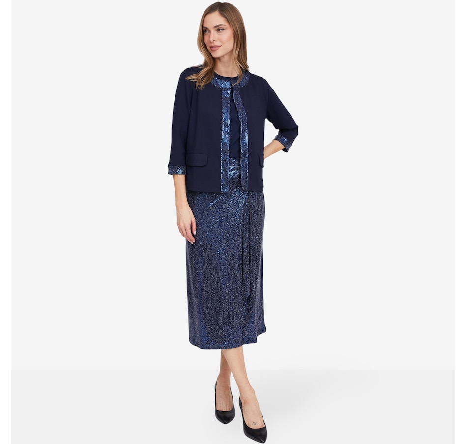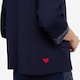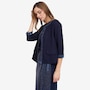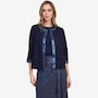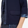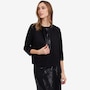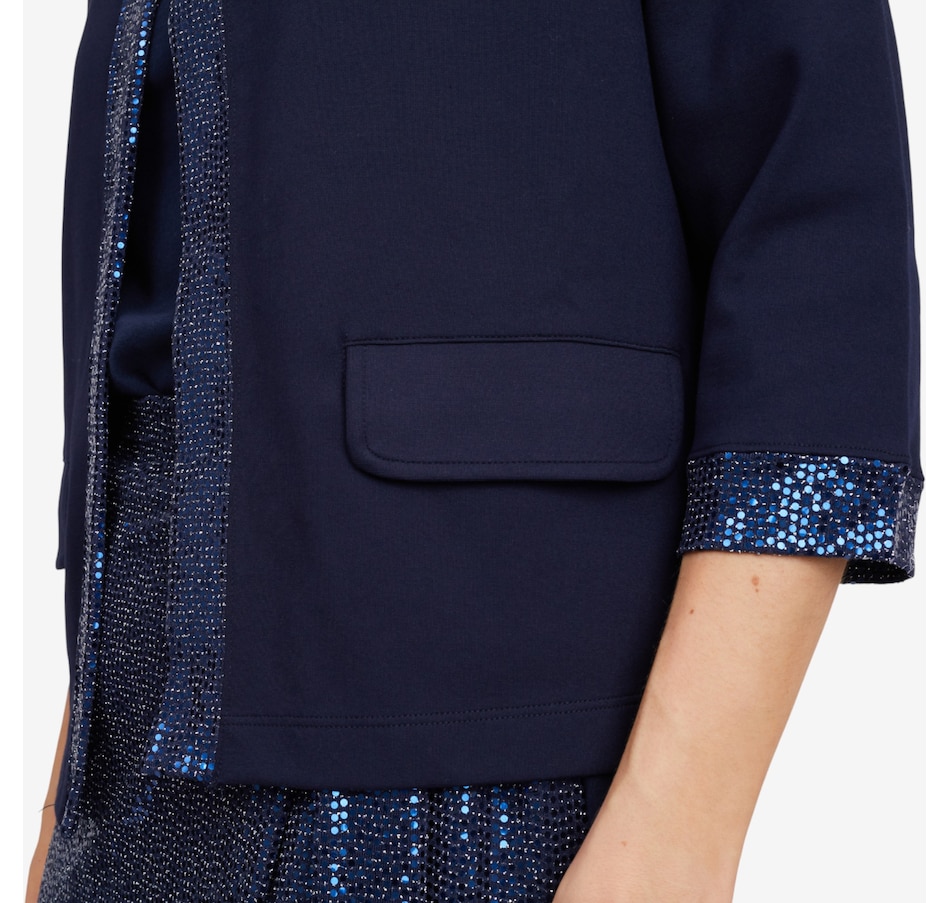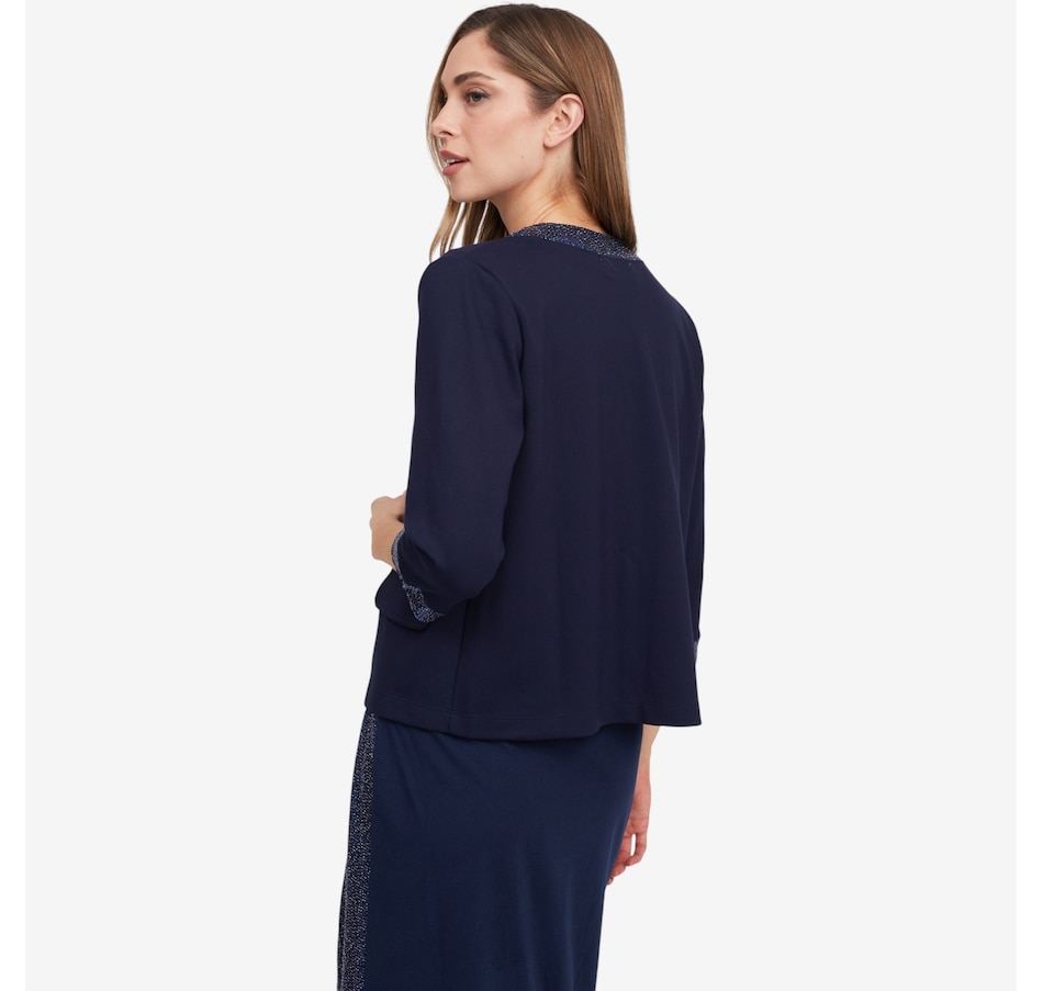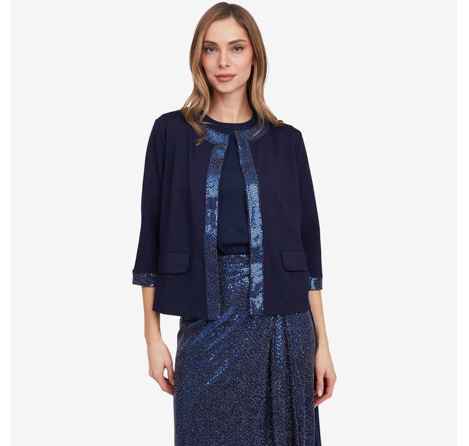This Frostine from Preloved is a jacket-like cardi that feels like a sweatsuit, and made with ponte fabric. It is a dressy cardigan with sequin trim along the neckline, front plackets and sleeve cuff. It finishes with the upcycled Preloved red heart patch on the back and is made in Canada too.