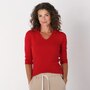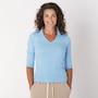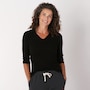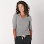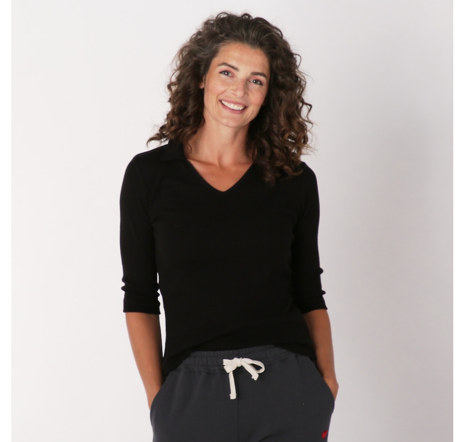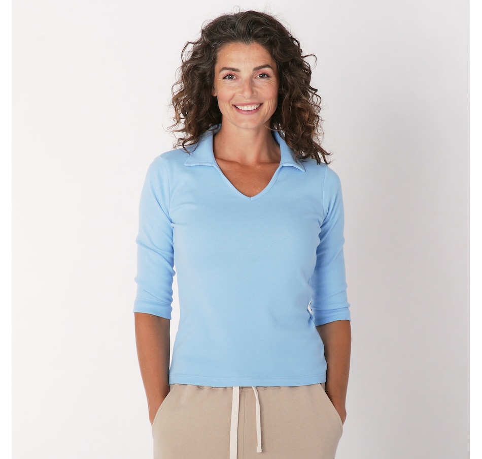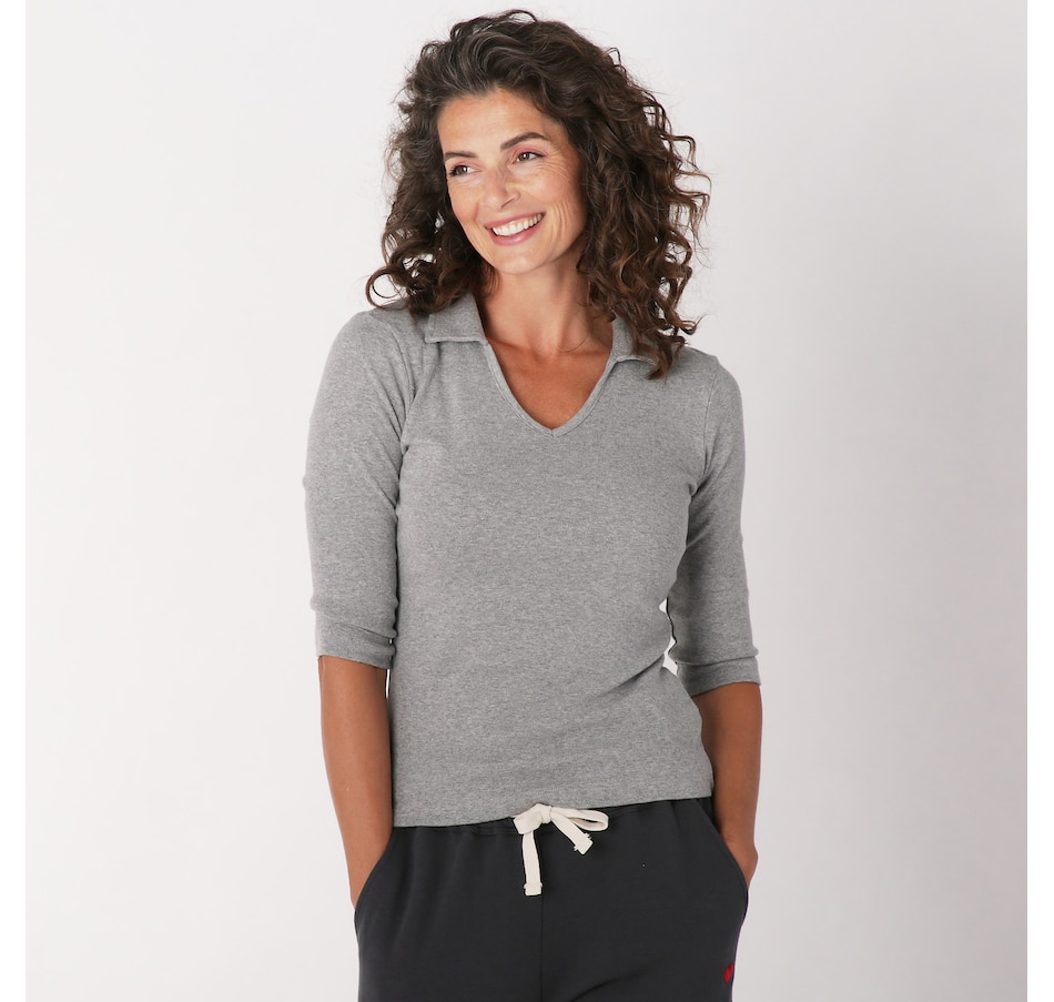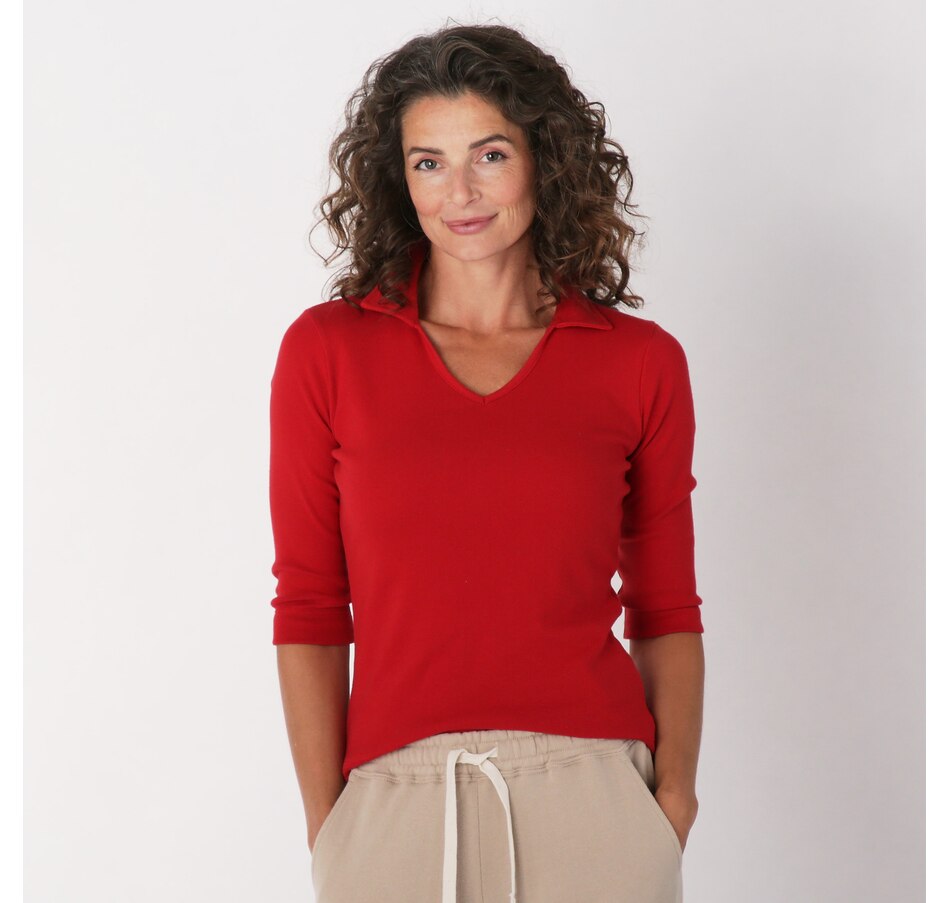 The Kaila 3/4 length sleeve top from Preloved is designed with a fitted collared polo top, and is made with 100% cotton rib fabric. It also features their familiar upcycled red heart patch on the back.