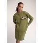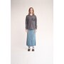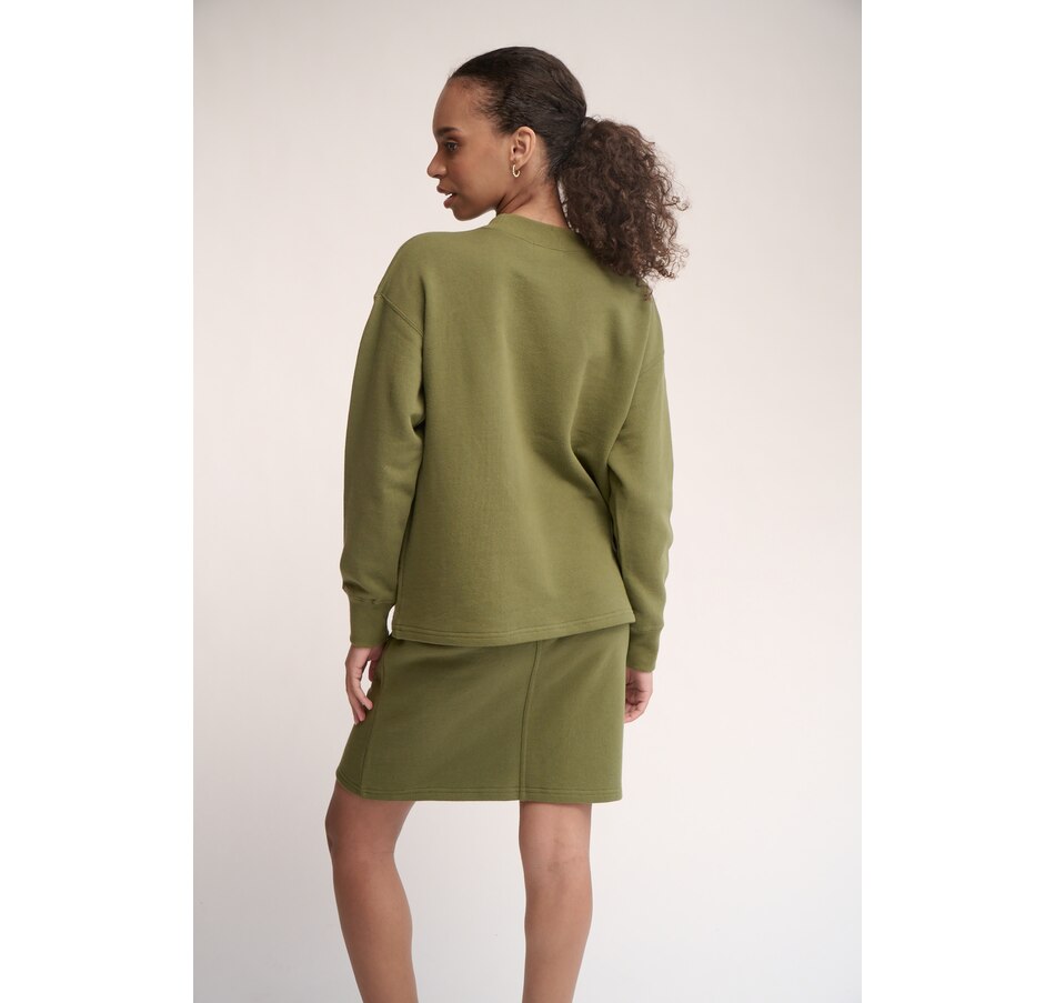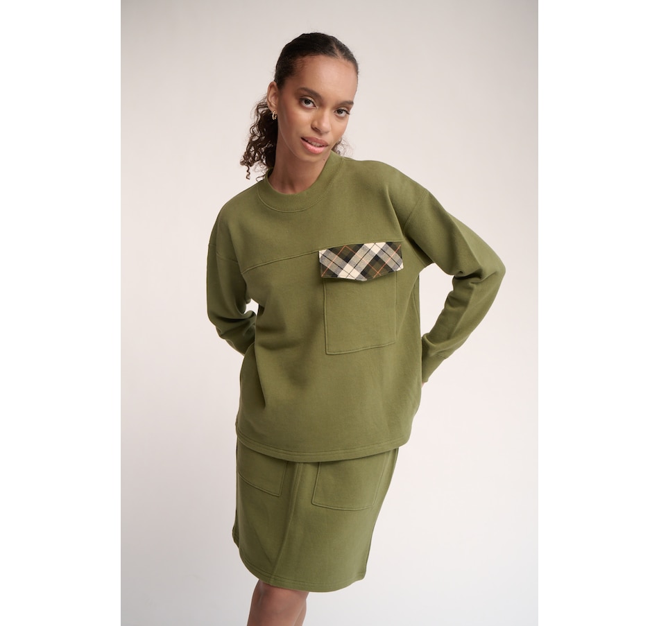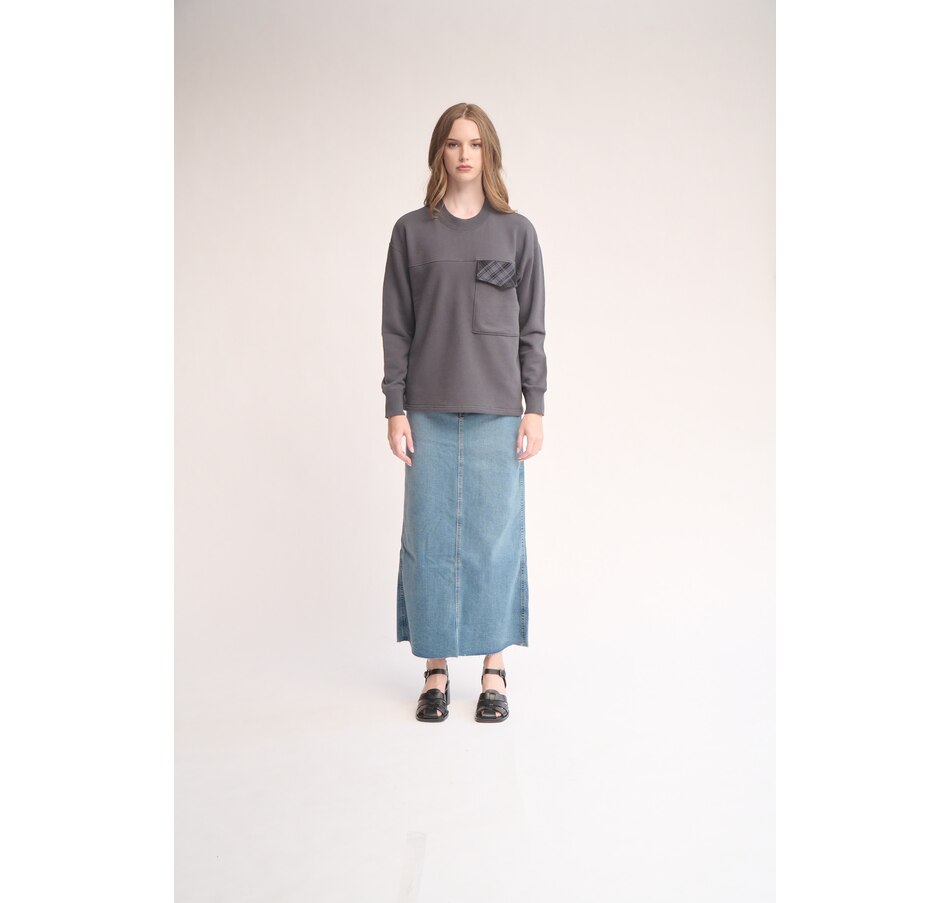 This crew neck top with front pocket detail is made with upcycled flannel material. The body is made with 100% cotton 14 oz terry (50% recycled yarn, and 50% in normal yard), and it features the Preloved upcycled red heart patch on the back.