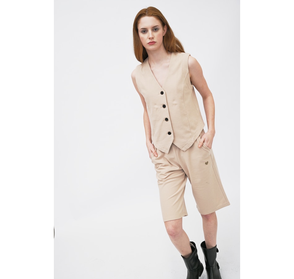 Cute and versatile, you'll centre all your warm weather looks in easy style with the Vida short from Preloved. This straight leg half pant has an elasticated waistband with pockets, and is made with 100% cotton pique fabric. It features an upcycled khaki heart patch on the front pocket too.