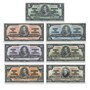 This set includes all seven 1937-issue Canadian banknotes from the $1 note to the $100 in premium high grade "very fine" to "about uncirculated" condition. Each note comes protected in a high-quality display holder. The issues of 1937 feature King George on the front of the $1, $2, $5, $10, $20, and $50 notes, while the $100 features Sir John A. Macdonald. The 1937 series is the first series of bilingual banknotes in Canada and the last issue to feature allegorical designs. The allegorical vignettes are also regarded as some of the most beautiful artwork ever to appear on Canadian banknotes.